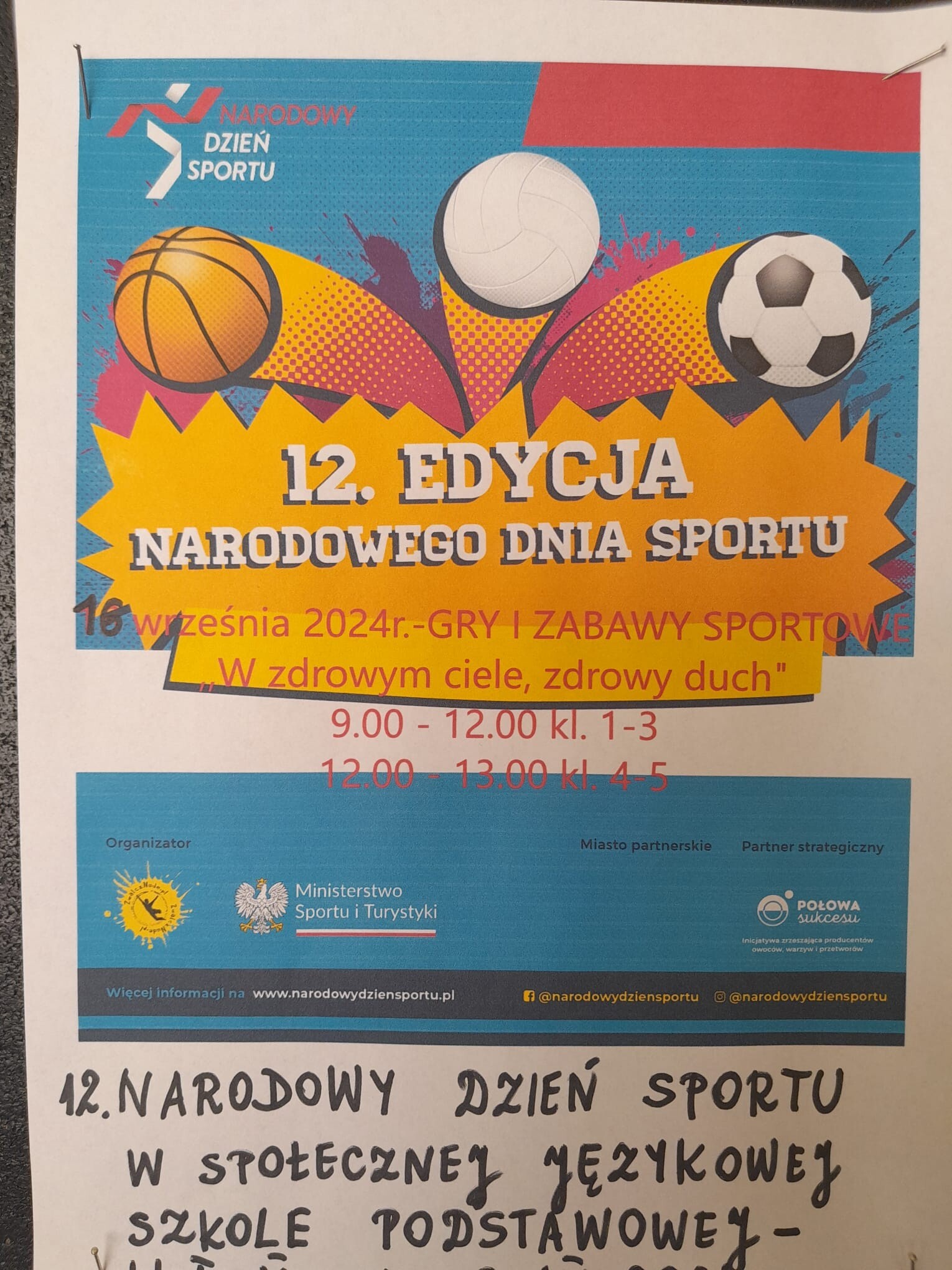 Klasy I - V aktywnie uczestniczyły w XII edycji tej Ogólnopolskiej Akcji prozdrowotnej pod hasłem ,,W zdrowym ciele,zdrowy duch".W ramach Narodowego Dnia Sportu odbył się turniej gry zespołowej ,,Dwa ognie", wyścigi drużyn, gry i zabawy ogólnorozwojowe oraz pokaz sztuk walki Karate w wykonaniu Mistrzów Polski Juniorów. Narodowy Dzień Sportu to ogólnopolska akcja, której organizatorem jest Fundacja ZwalczNude.pl . Jest to wyjątkowy dzień w roku, w którym zwracamy uwagę na tych, którzy kochają sport. Tegoroczną, 12 edycję Narodowego Dnia Sportu swoim patronatem objął m.in. Rzecznik Praw Dziecka, PZPN, Ministerstwo Sportu i Turystyki.