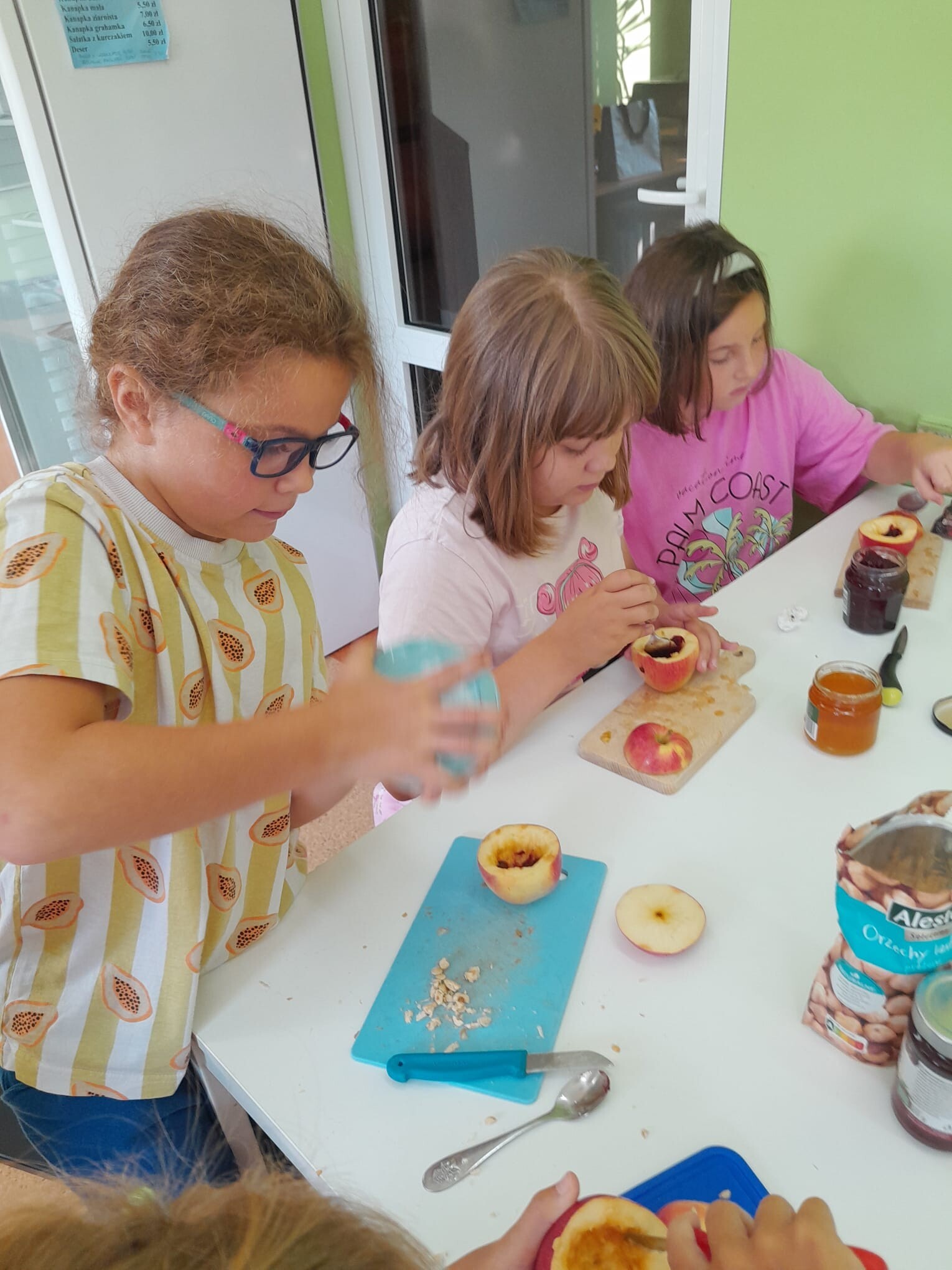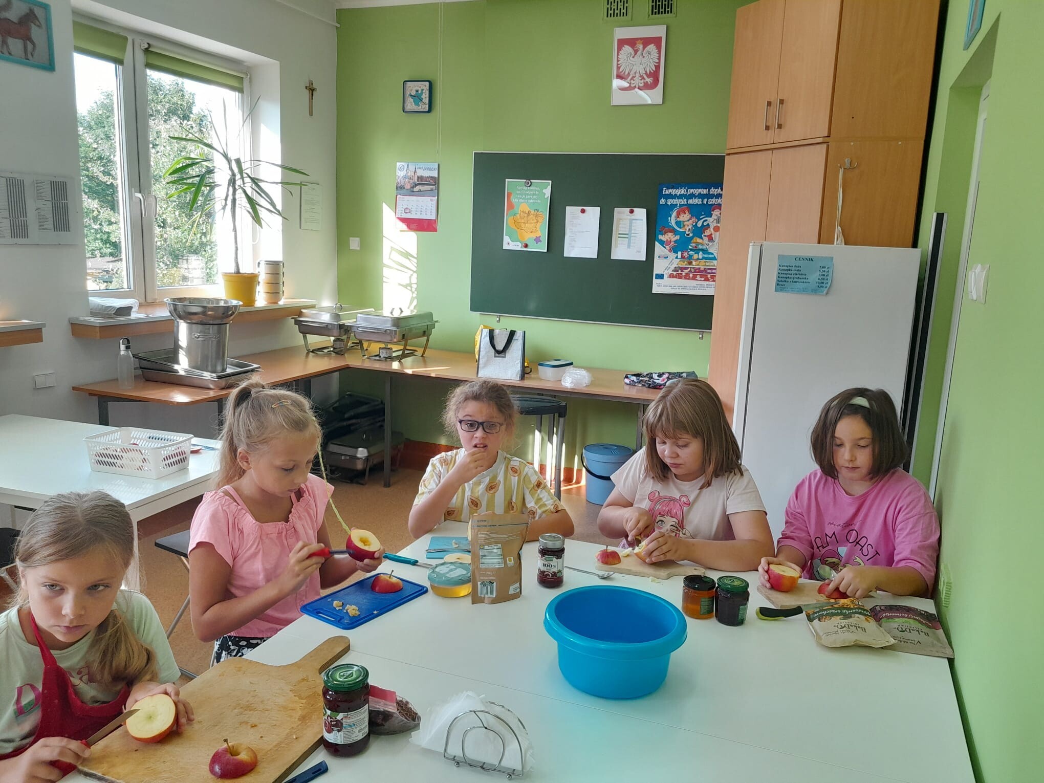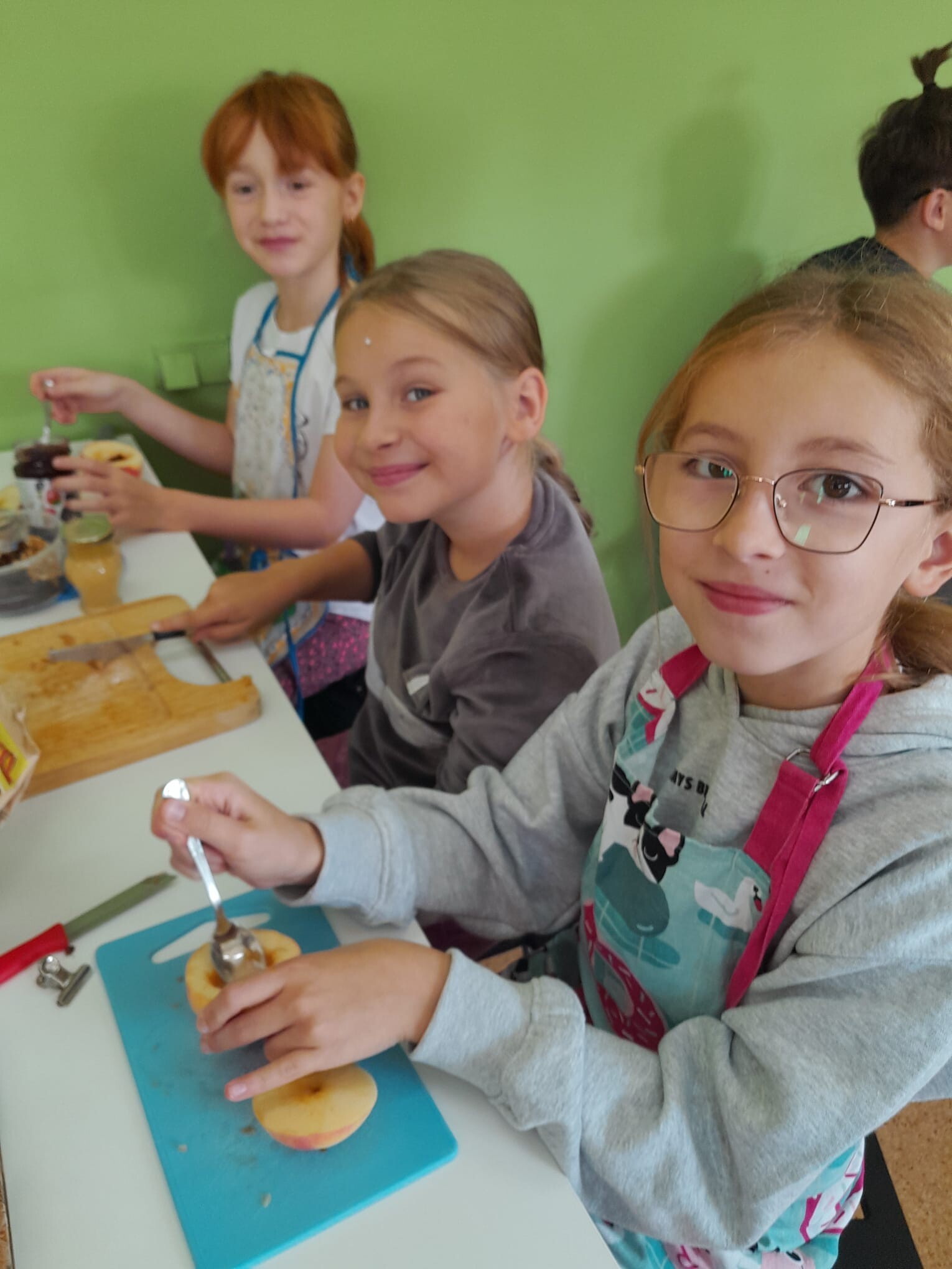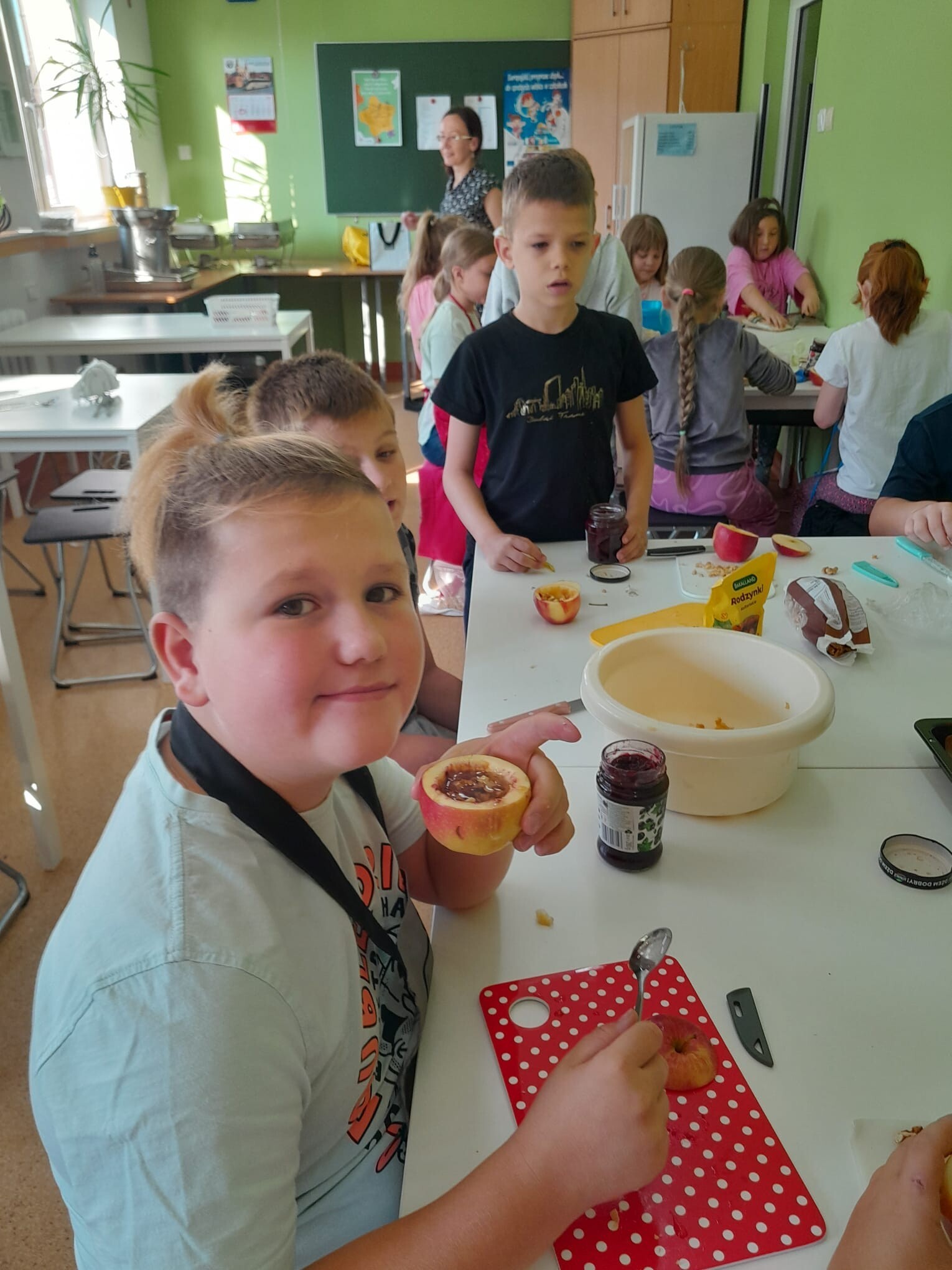 Trzeciklasiści przygotowali dzisiaj zdrową przekąskę z jabłek,mianowicie : pieczone jabłka z miodem, orzechami i cynamonem. Jabłka oraz miód mają mnóstwo właściwości zdrowotnych: zapobiegają przeziębieniu, odpędzają bakterie i wzmacniają organizm, a orzechy wpływają pozytywnie na pracę serca, mózgu oraz kondycję skóry. Ty były bardzo udane zajęcia kulinarne.