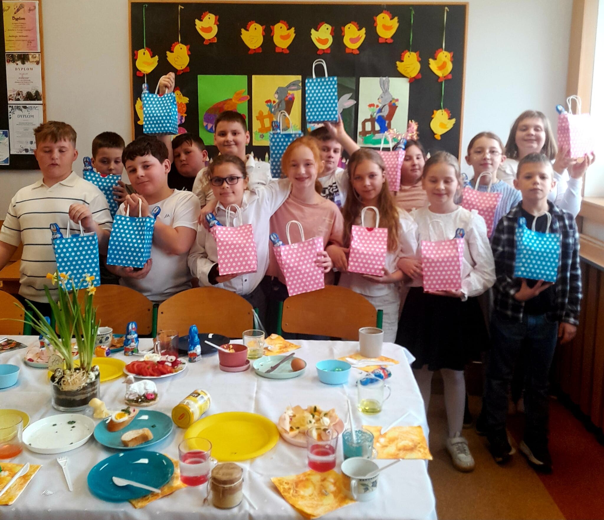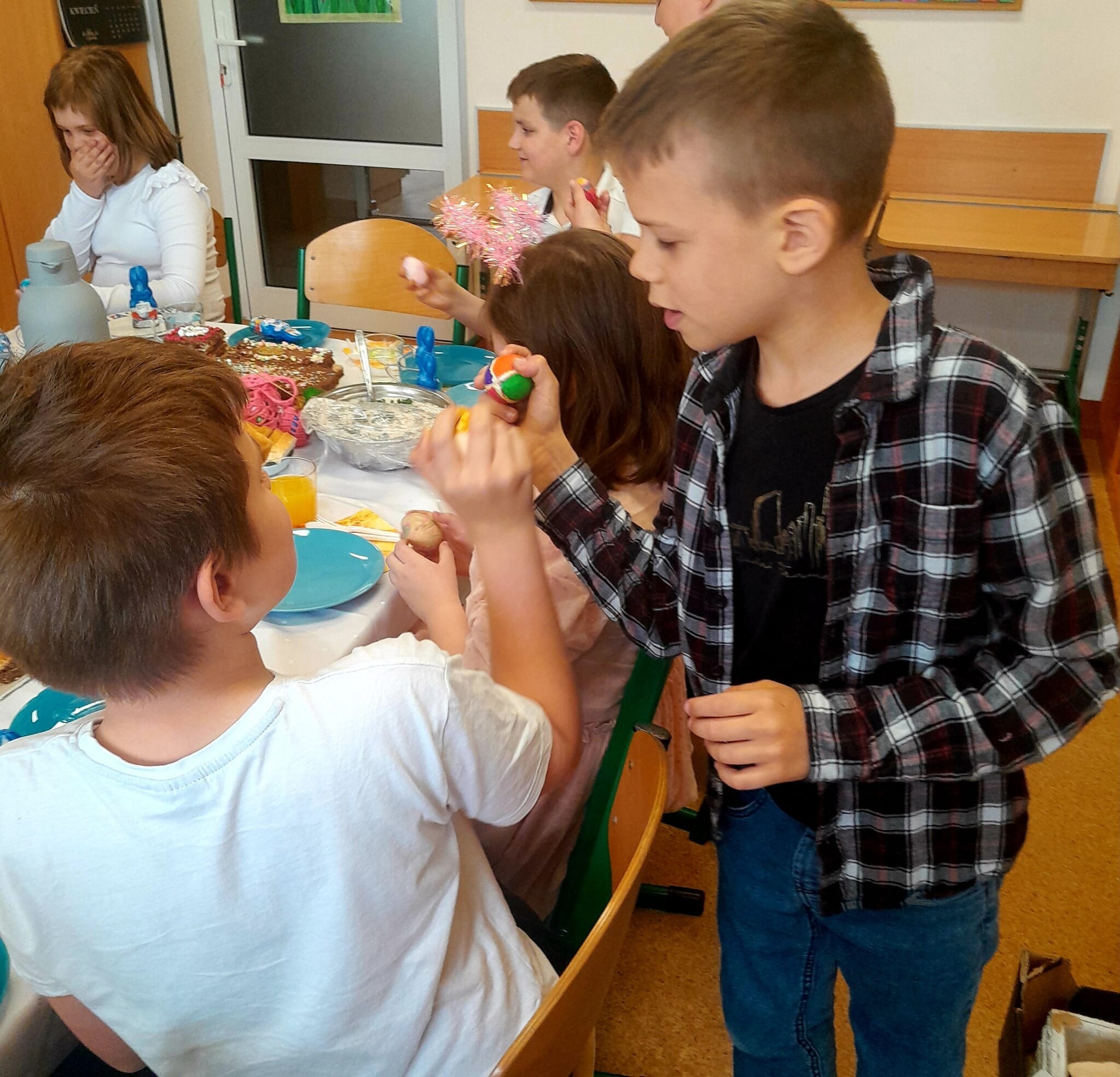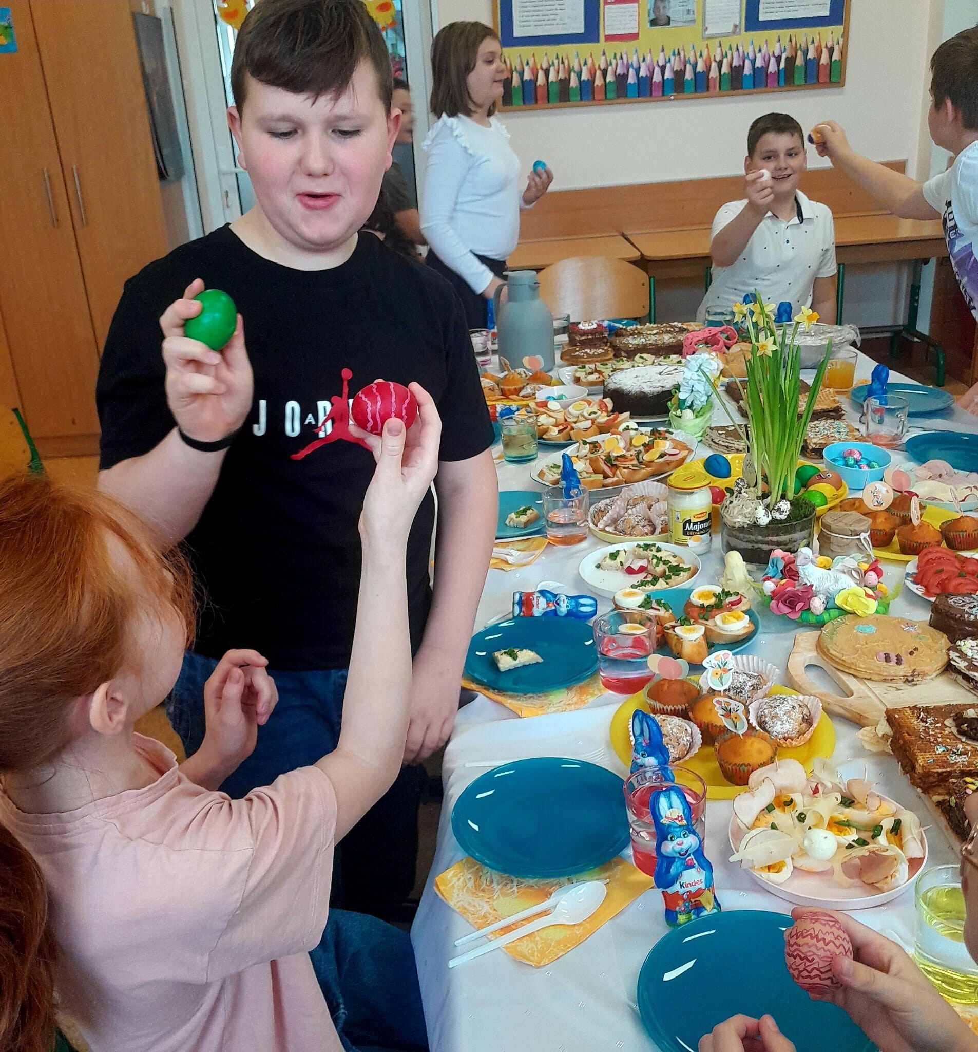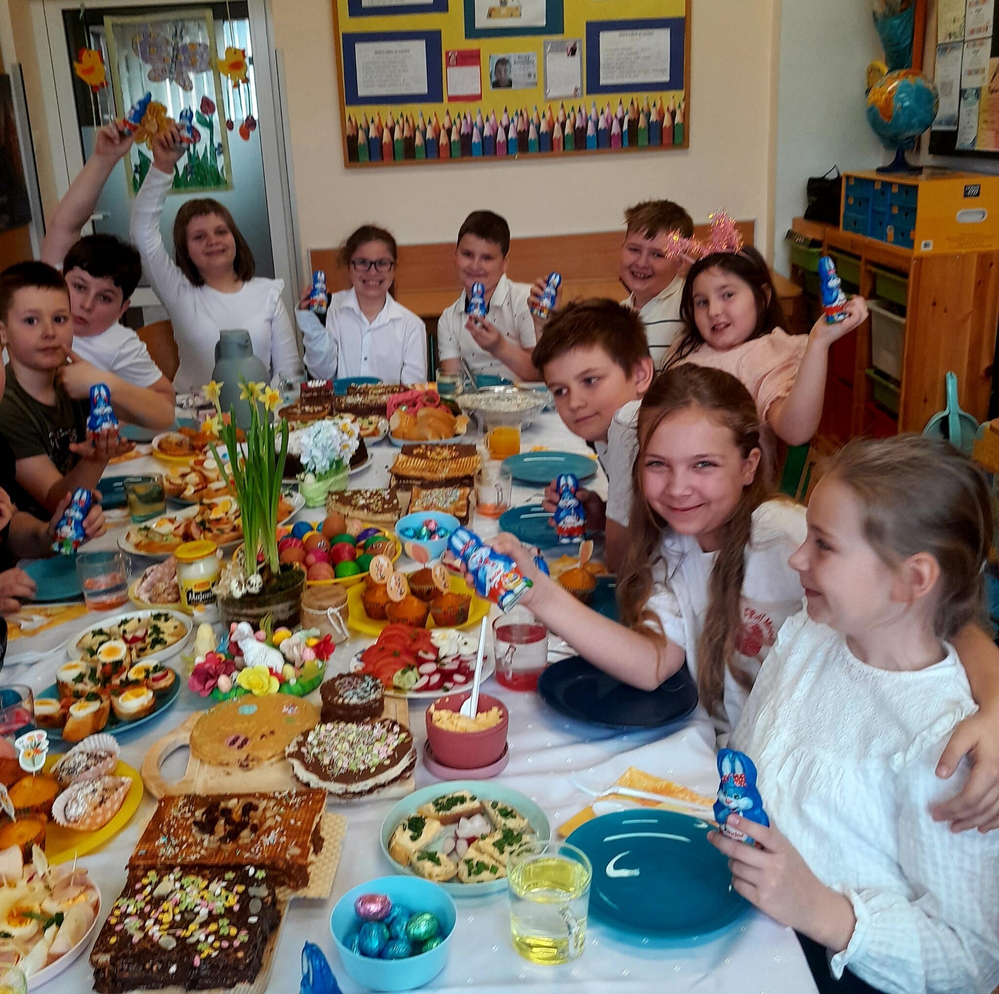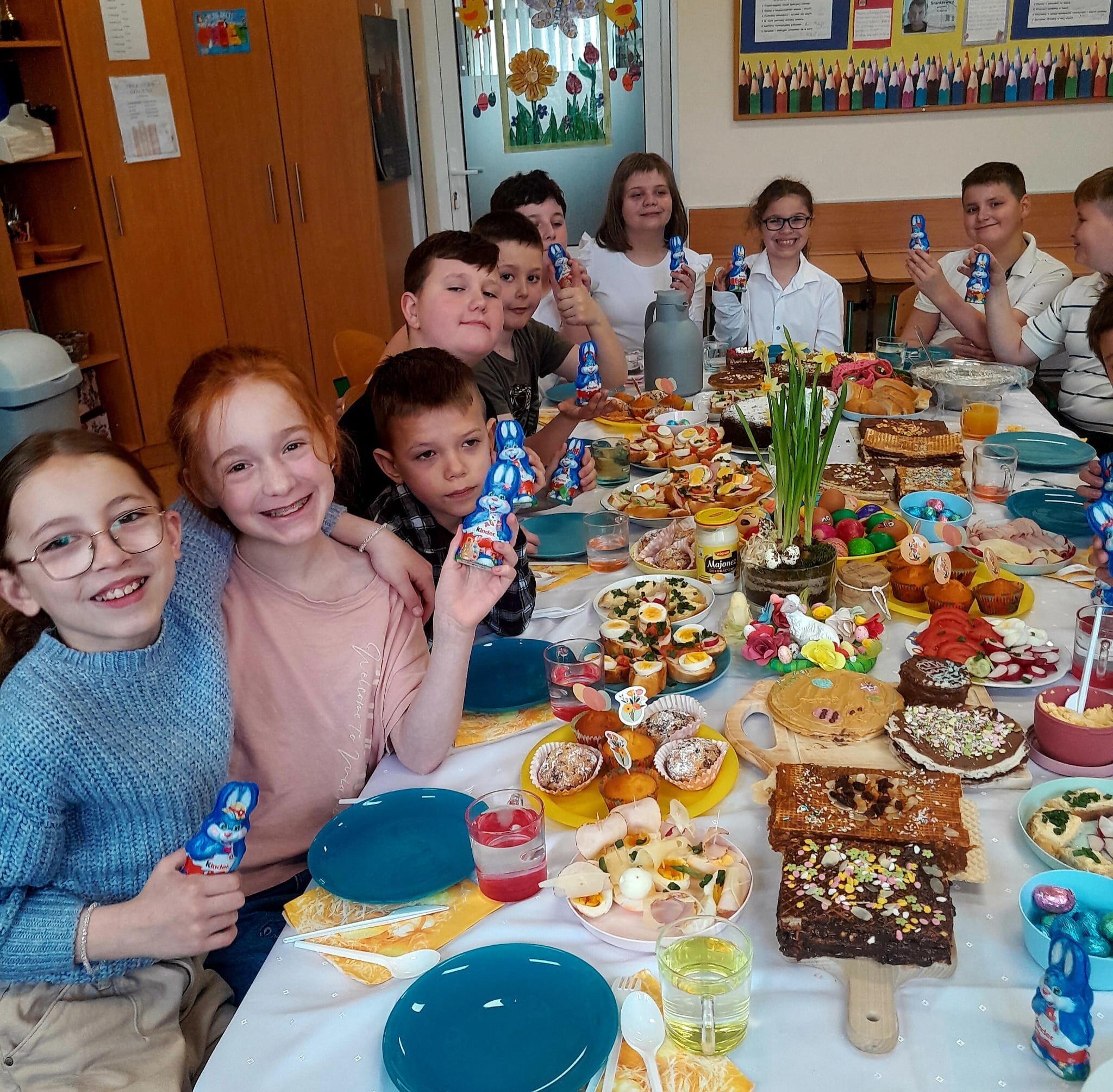Klasa III już rozpoczęła Święta Wielkanocne od wspólnego, wyjątkowego śniadania! Dzieci, z pomocą swoich nauczycieli, przygotowały stół pełen tradycyjnych potraw wielkanocnych. Były kolorowe jajka, pyszne mazurki, chrupiące babki i wiele innych smakołyków. Wszyscy z apetytem zajadali się świątecznymi przysmakami, dzieląc się przy tym jajkiem i składając sobie życzenia.