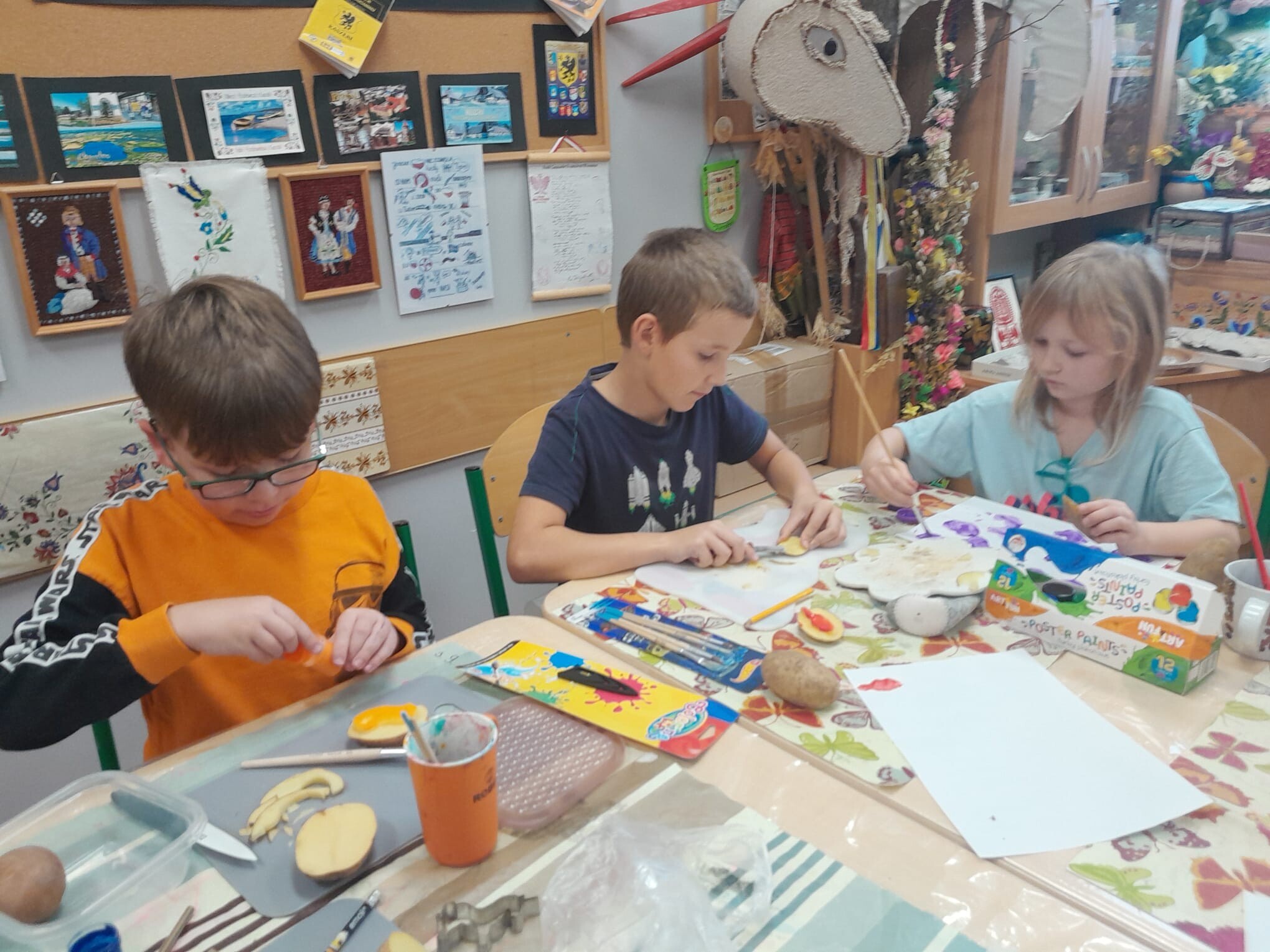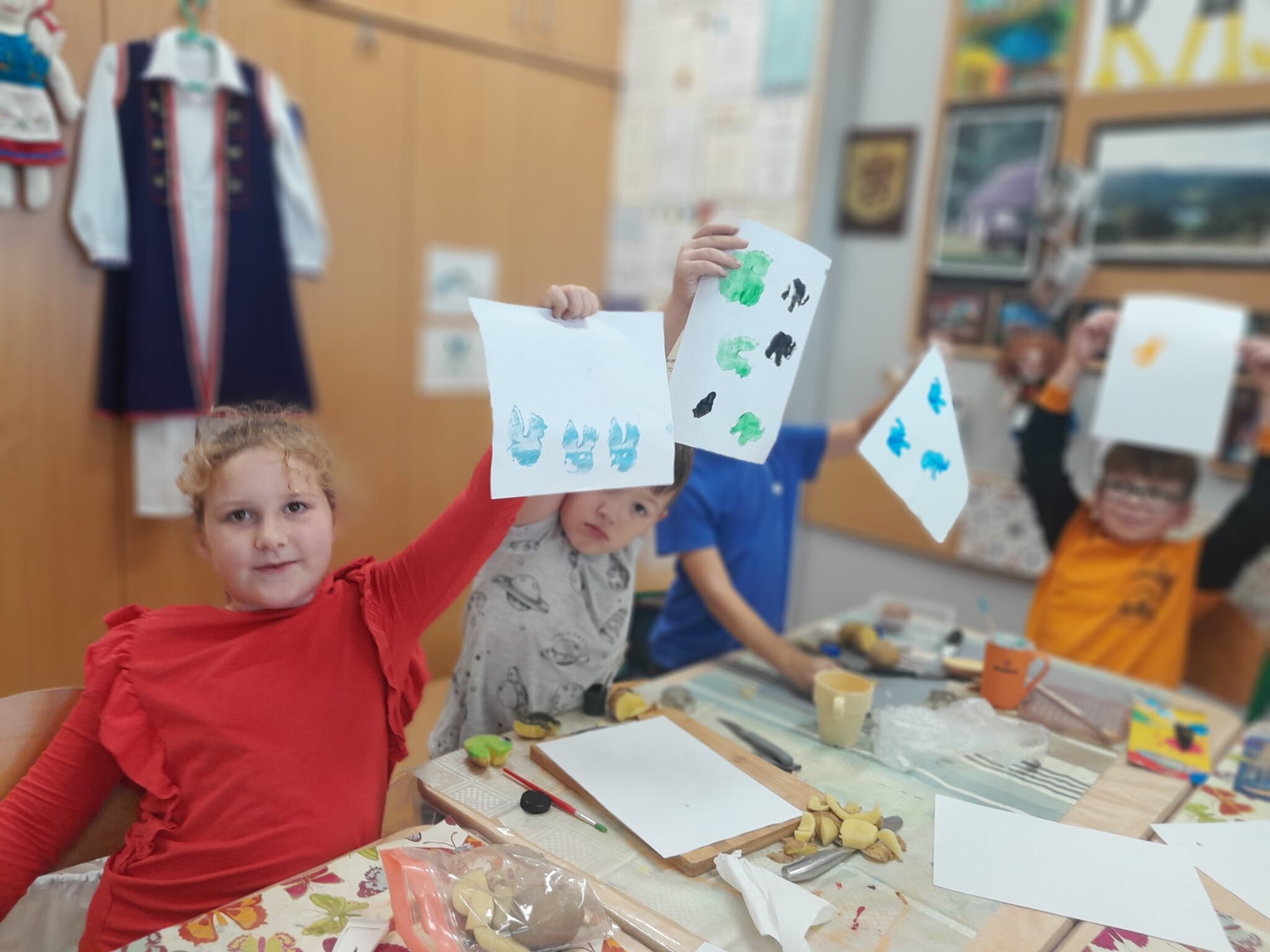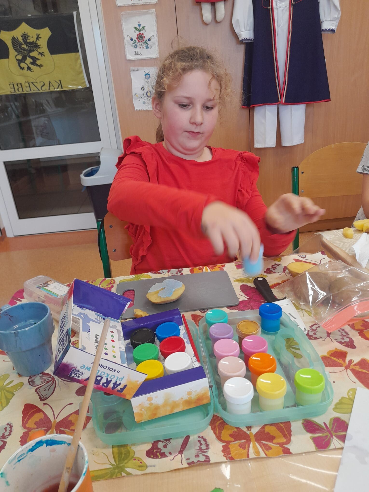 Dzieci z klasy IIa, w ramach zajęć języka kaszubskiego, wykonały ciekawe stempelki z ziemniaków. Było to podsumowanie lekcji o jesiennych pracach gospodarskich na Kaszubach,a w szczególności o tzw.wykopkach,czyli zbiorze ziemniaków i świętowaniu Dnia Pieczonego Ziemniaka.