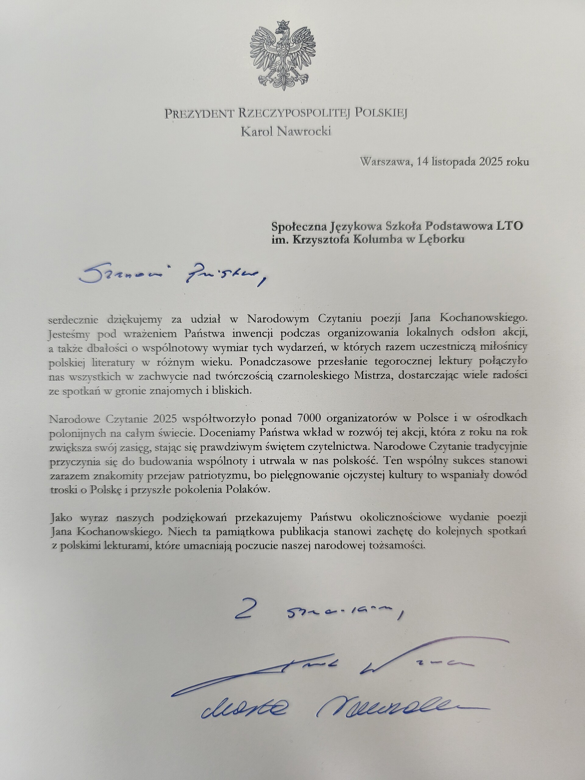 Dotarło do nas oficjalne podziękowanie od Pary Prezydenckiej Rzeczypospolitej Polskiej za nasz wkład i zaangażowanie w organizację Narodowe Czytanie 2025 twórczości Jana Kochanowskiego.