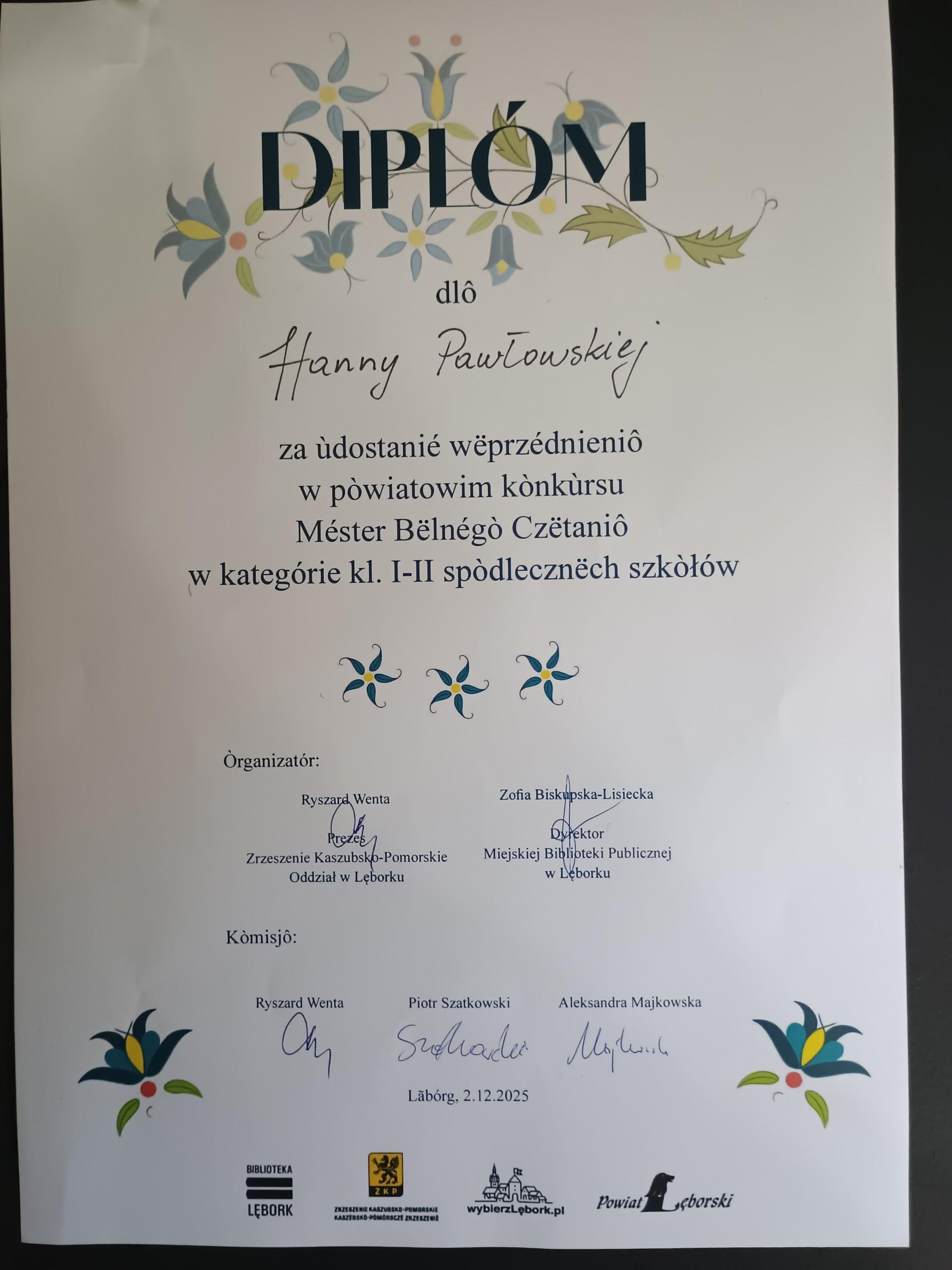 2 grudnia 2025 r. uczennice naszej Szkoły uczęszczające na lekcje języka kaszubskiego wzięły udział w Powiatowych Eliminacjach do XII Regionalnego Konkursu MÉSTER BËLNÉGÒ CZËTANIÔ PÒ KASZËBSKÙ.