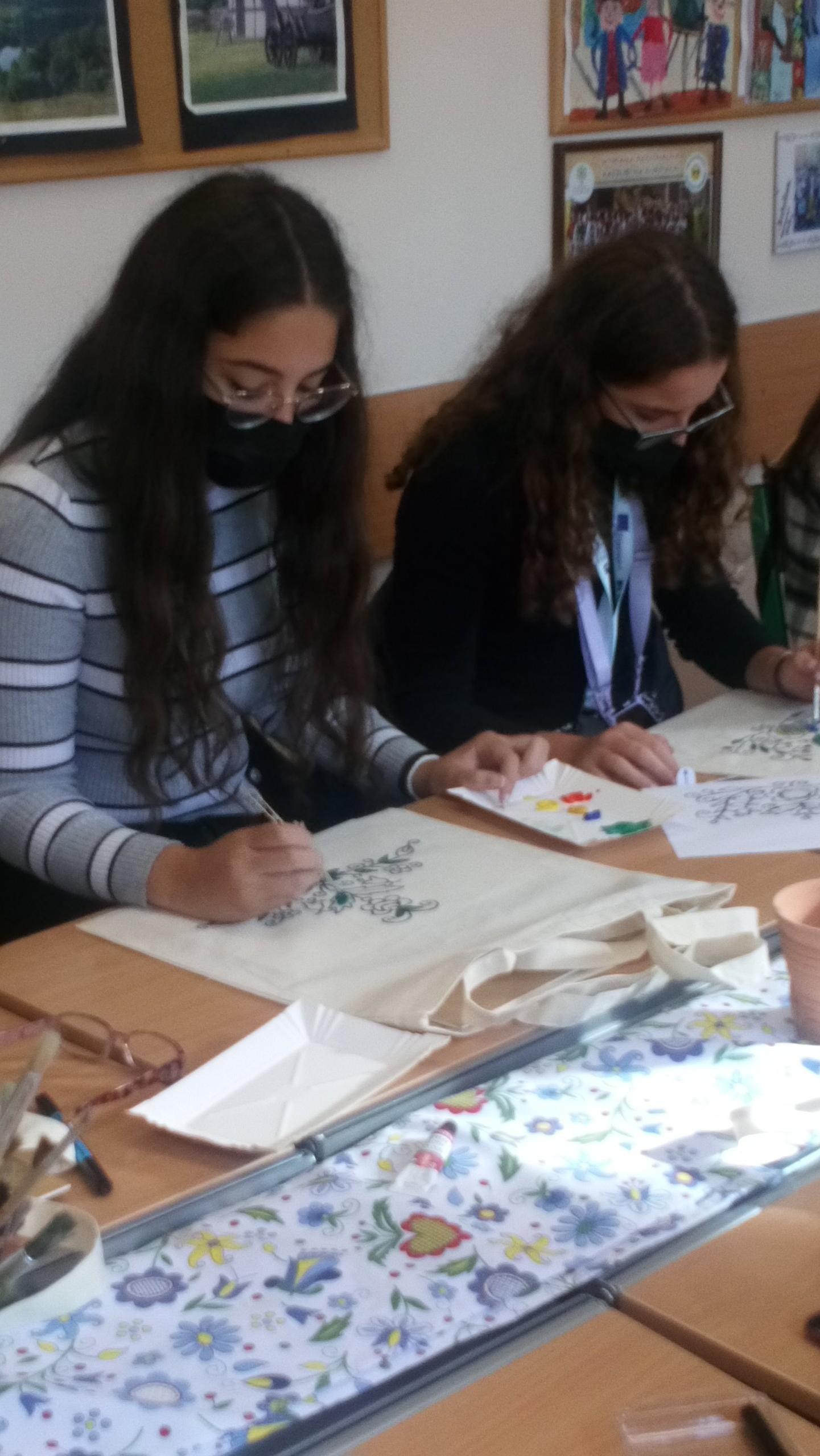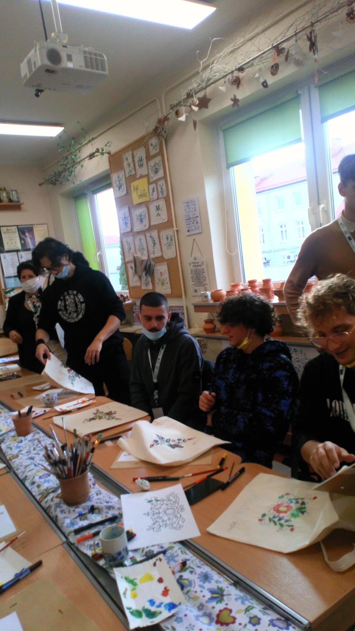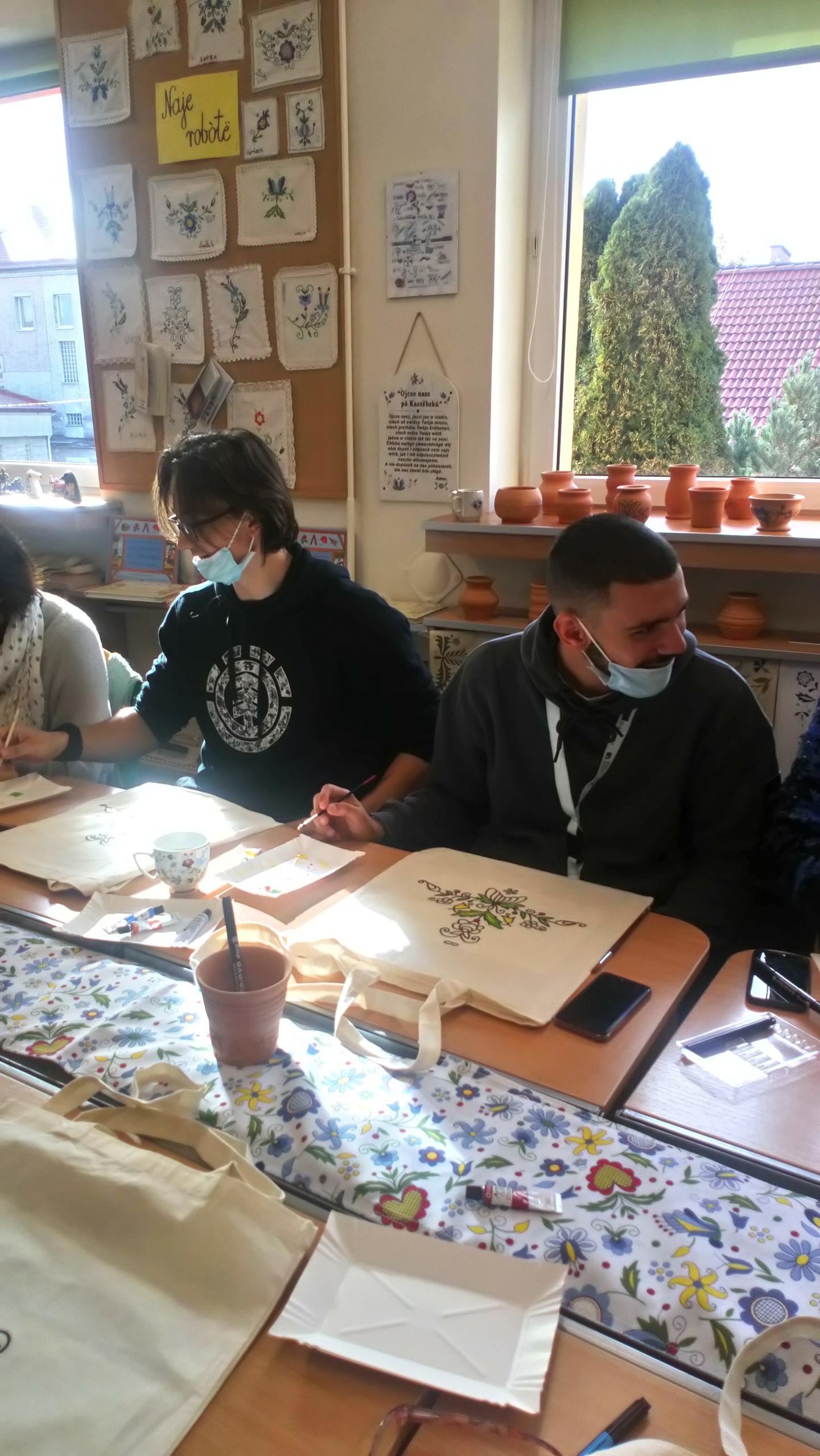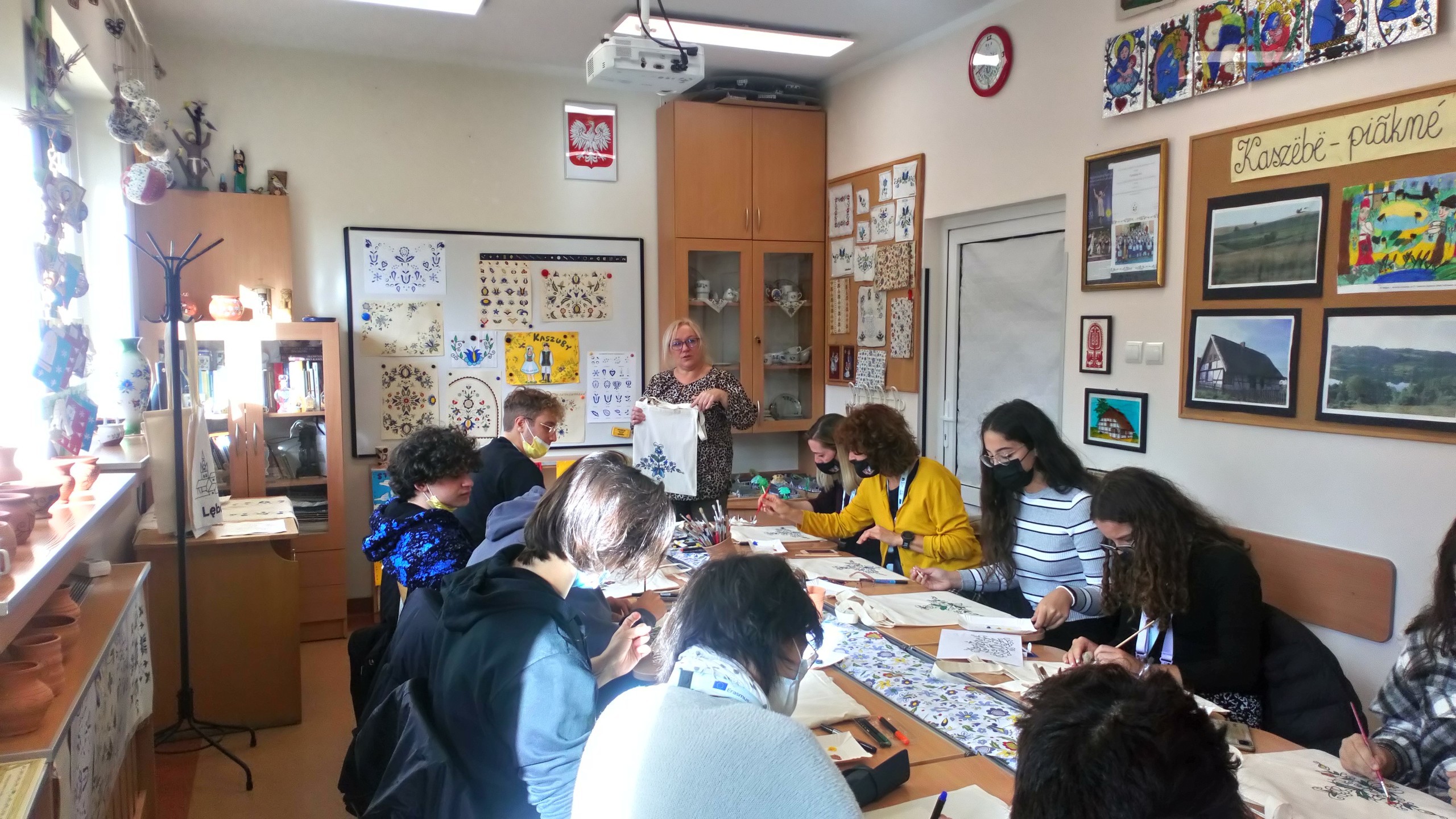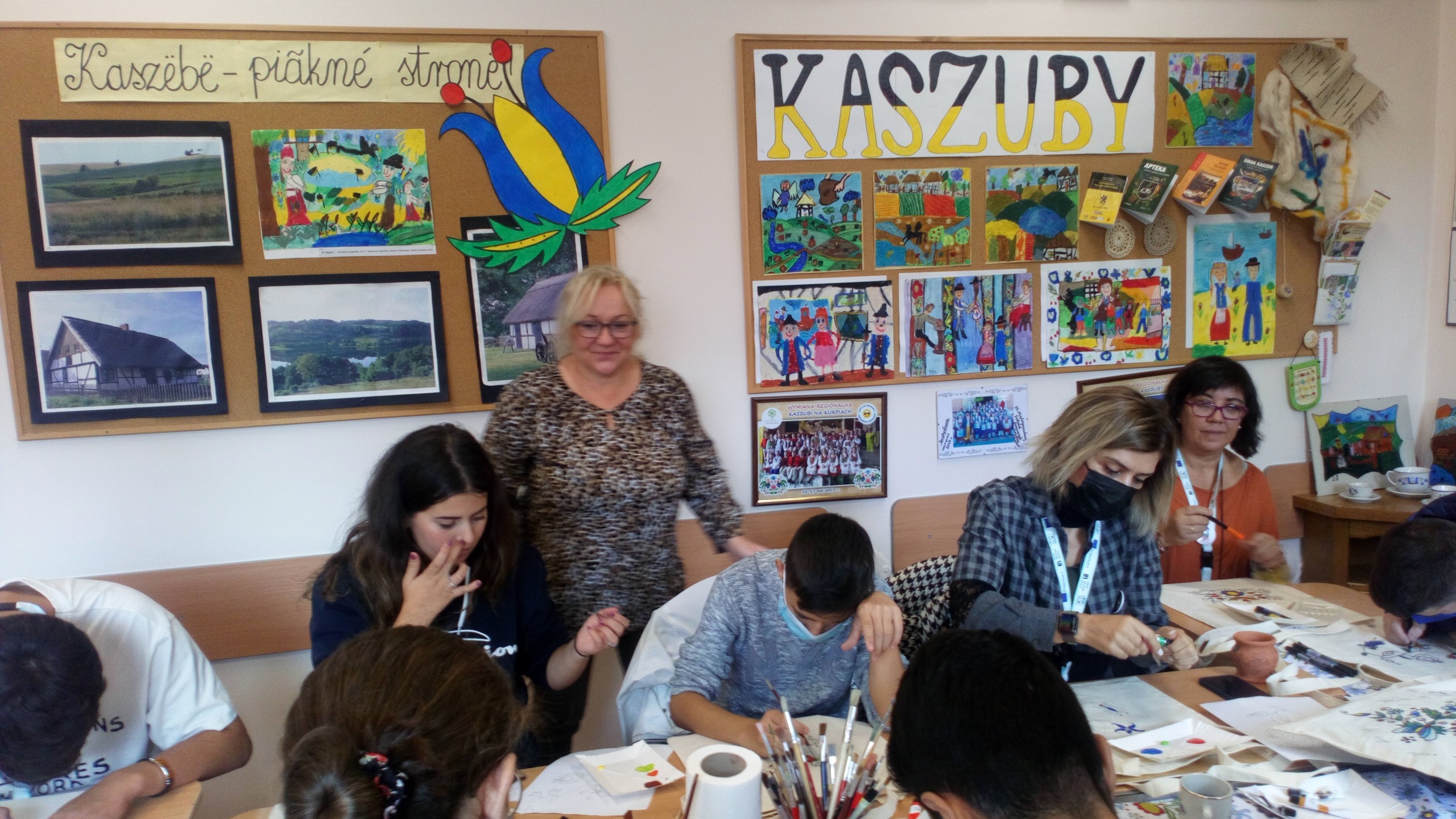 W piątek, 24 września 2021 roku, odbyły się warsztaty kaszubskie dla grupy młodzieży z pięciu krajów: Włoch, Hiszpanii, Portugalii, Grecji i Turcji. Przyjechali oni do Społecznego Liceum Ogólnokształcącego w Lęborku, w ramach programu Erasmus+. Koordynatorem akcji była p. Joanna Woźniakowska. Goście spotkali się z panią vicedyrektor Anetą Cichowlas, która pokazała im całą szkołę. Poznali folklor kaszubski, stroje i muzykę Kaszub dzięki warsztatom muzycznym prowadzonym przez lęborski zespół muzyczny ,,Frantówka” pod kierownictwem p. Reginy Szczupaczyńskiej. W warsztatach aktywnie uczestniczyli również uczniowie naszej szkoły, reprezentujący szkolny zespół ,,Lęborskie Słoneczka”. Natomiast w ramach warsztatów plastycznych prowadzonych przez p. Bożenę Siuta, nauczyciela języka kaszubskiego, młodzieży został przybliżony haft kaszubski. Mieli oni okazję ozdobić płócienne torby wybranymi motywami regionalnymi. Spotkanie przebiegało w bardzo miłej atmosferze i pozwoliło w atrakcyjny sposób przybliżyć gościom z innych krajów, chociażby w zarysie, różnorodność kulturową naszego regionu.