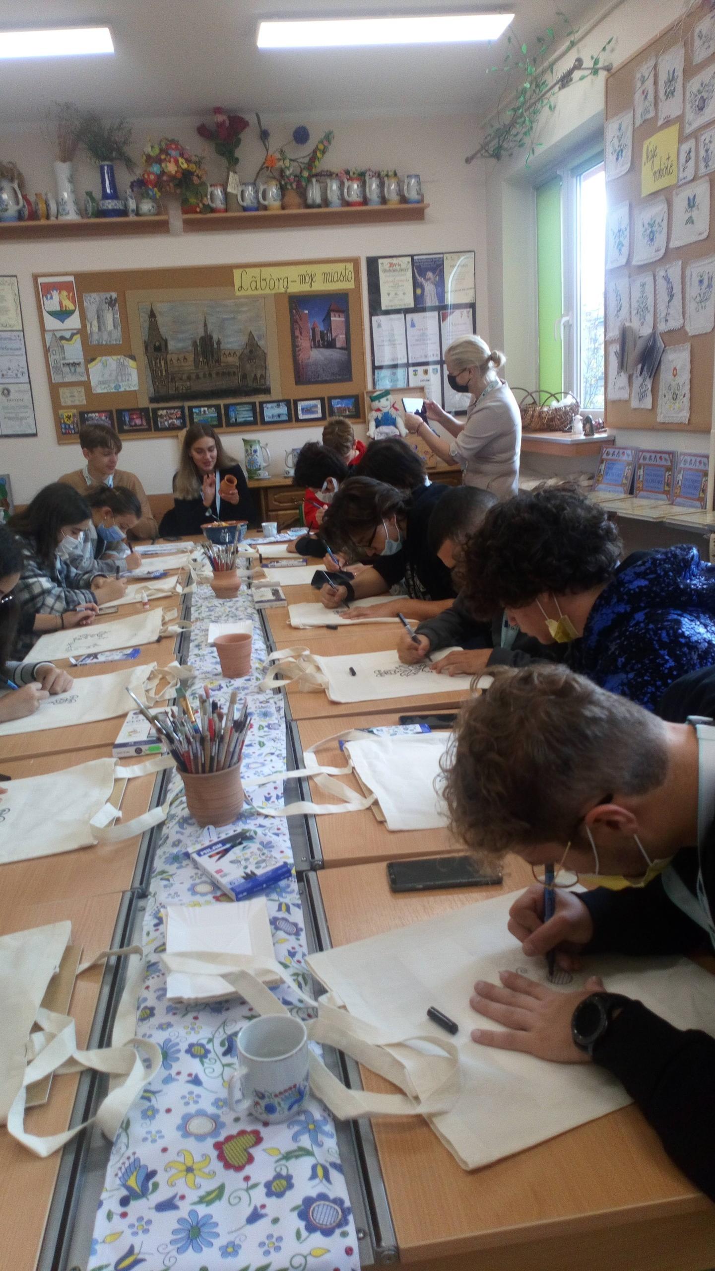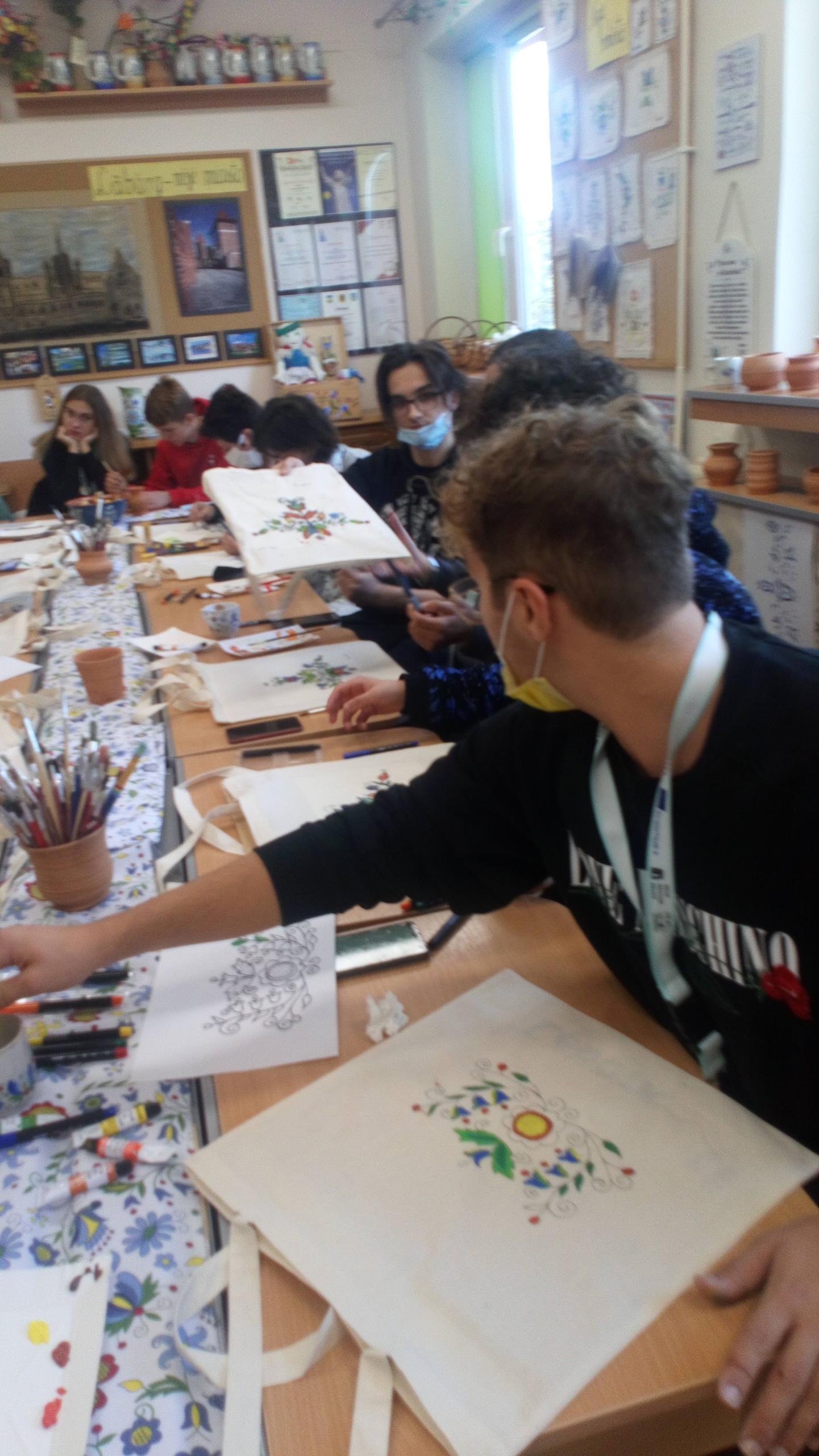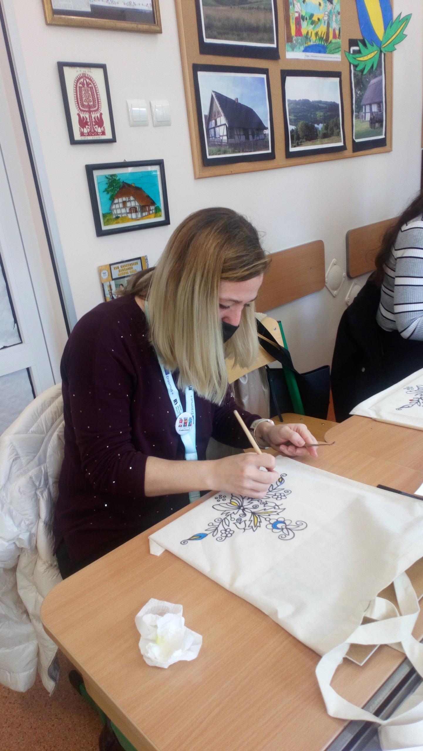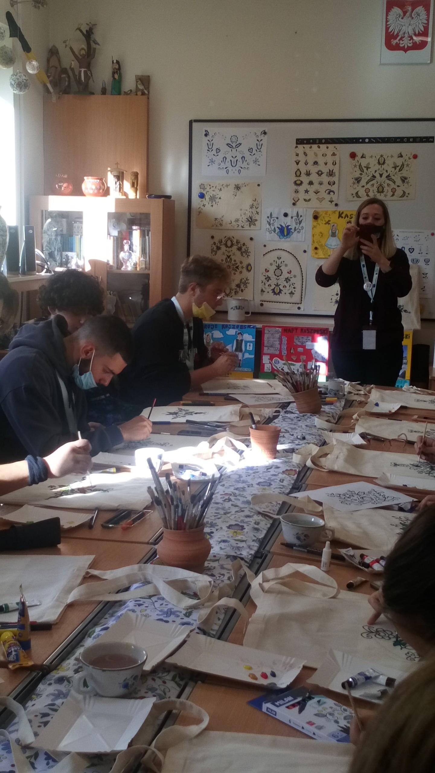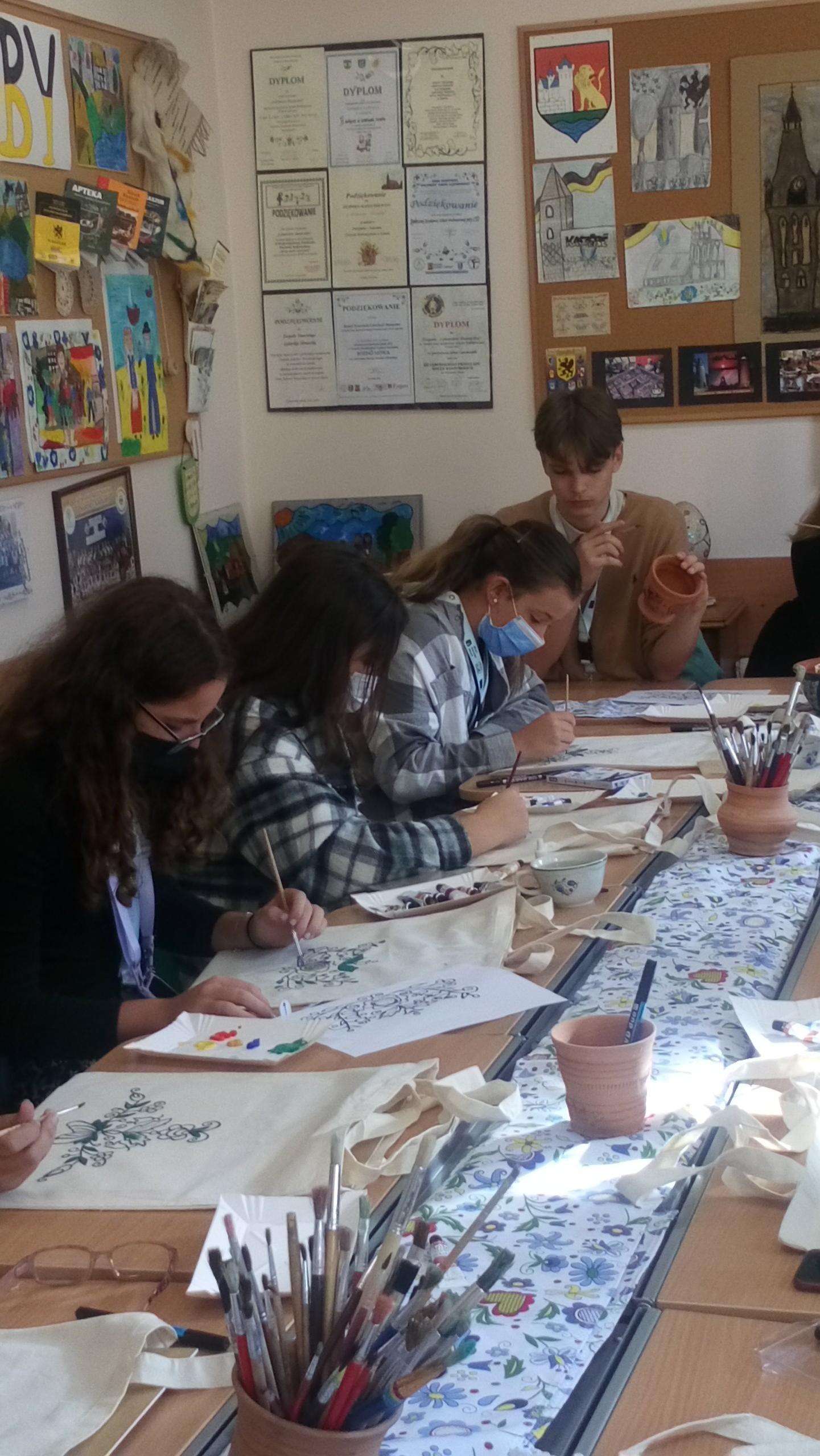 W piątek, 24 września 2021 roku, odbyły się warsztaty kaszubskie dla grupy młodzieży z pięciu krajów: Włoch, Hiszpanii, Portugalii, Grecji i Turcji. Przyjechali oni do Społecznego Liceum Ogólnokształcącego w Lęborku, w ramach programu Erasmus+. Koordynatorem akcji była p. Joanna Woźniakowska. Goście spotkali się z panią vicedyrektor Anetą Cichowlas, która pokazała im całą szkołę. Poznali folklor kaszubski, stroje i muzykę Kaszub dzięki warsztatom muzycznym prowadzonym przez lęborski zespół muzyczny ,,Frantówka” pod kierownictwem p. Reginy Szczupaczyńskiej. W warsztatach aktywnie uczestniczyli również uczniowie naszej szkoły, reprezentujący szkolny zespół ,,Lęborskie Słoneczka”. Natomiast w ramach warsztatów plastycznych prowadzonych przez p. Bożenę Siuta, nauczyciela języka kaszubskiego, młodzieży został przybliżony haft kaszubski. Mieli oni okazję ozdobić płócienne torby wybranymi motywami regionalnymi. Spotkanie przebiegało w bardzo miłej atmosferze i pozwoliło w atrakcyjny sposób przybliżyć gościom z innych krajów, chociażby w zarysie, różnorodność kulturową naszego regionu.
