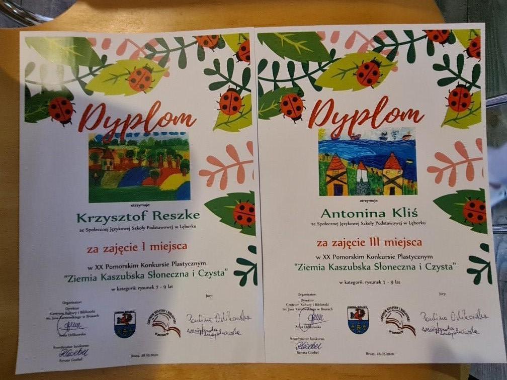 Z ogromną przyjemnością informujemy, że w XX Pomorskim Konkursie Plastycznym ,,Ziemia Kaszubska Słoneczna i Czysta", organizowanym przez Centrum Kultury i Biblioteki Biblioteki w Brusach, I miejsce zajął KRZYSZTOF RESZKE - kl.I A oraz III miejsce ANTONINA KLIŚ - kl.I A ( opiekun artystyczny - p.Bożena Siuta). Konkurs pozwolił podzielić się w plastycznej formie odkryciami i spostrzeżeniami dotyczącymi pięknego regionu, jakim bez wątpienia są Kaszuby, od morza poprzez jeziora i lasy, po piaski i łąki.