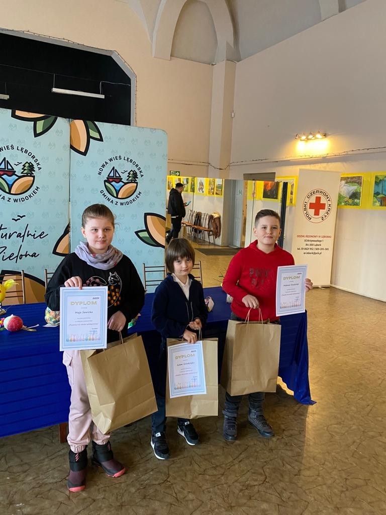 Miło nam poinformować, że wśród laureatów Powiatowego Konkursu Plastycznego ,,Pisanka lub stroik wielkanocny”, organizowanego przez GOK w Nowej Wsi Lęborskiej, znaleźli się uczniowie klasy trzeciej: Adam Gniedziejko, Maja Sawicka – Bąba oraz Mateusz Studziński. Prace zostały wykonane pod kierunkiem p. Bożeny Siuta. Uroczyste wręczenie nagród połączone z wystawą prac odbyło się 8 kwietnia 2022 r. Gratulacje!