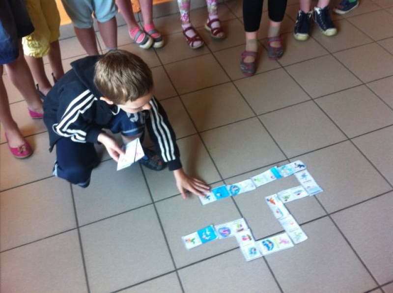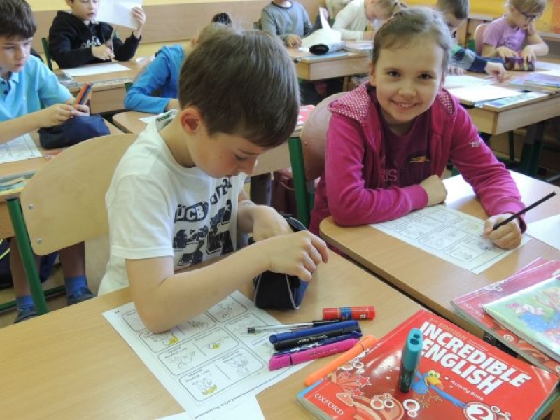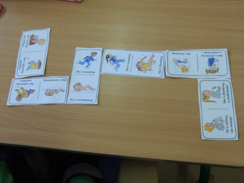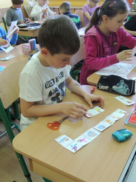 W zeszłym tygodniu na zajęciach języka angielskiego uczniowie klas drugich przygotowywali karty do gry w domino. Nie były to jednak zwyczajne karty, na każdej z nich widniały zdania w języku angielskim, dzięki którym dzieci mogły powtórzyć gramatykę i użycie czasu Present Continous.