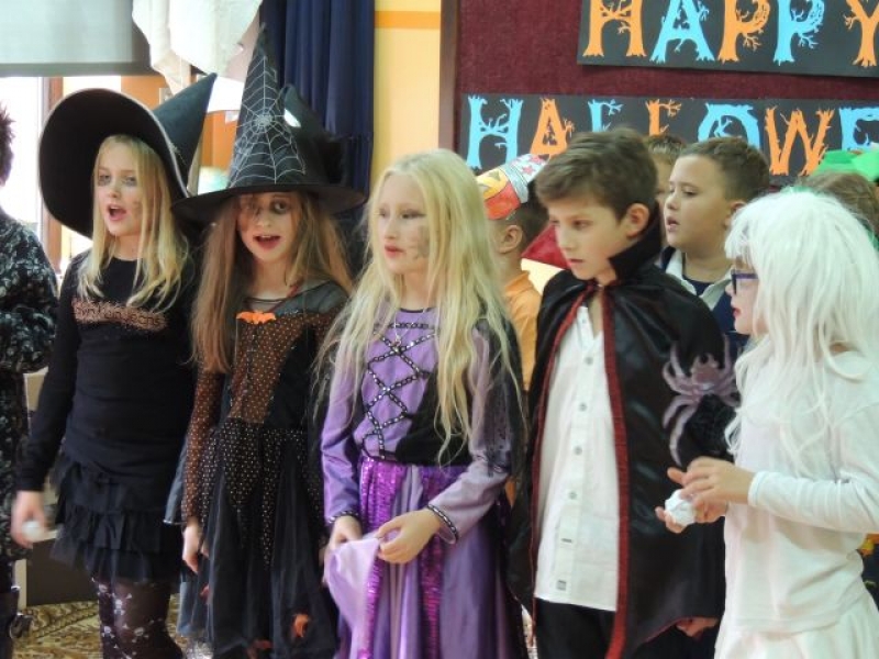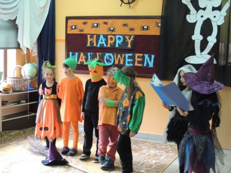 Szkolna grupa teatralna, Happy Kids, w zupełnie nowym składzie, przygotowała występ dotyczącay święta Halloween. Na scenie pojawiły się dynie, czarownice i duchy, które opowiadały dzieciom o historii Halloween i obowiązujących tego dnia zabawach. Uczniowie dowiedzieli się między innymi, że święto, które przybyło do nas z Ameryki, wbrew pozorom wcale nie pochodzi stamtąd a z obecnych terenów Anglii, Irlandii, Szkocji, Walii i północnej Francji. Tego dnia dzieci przebierają się za czarownice, chochliki, duchy lub wróżki i chodzą od domu do domu mówiąc „Trick or treat!”.