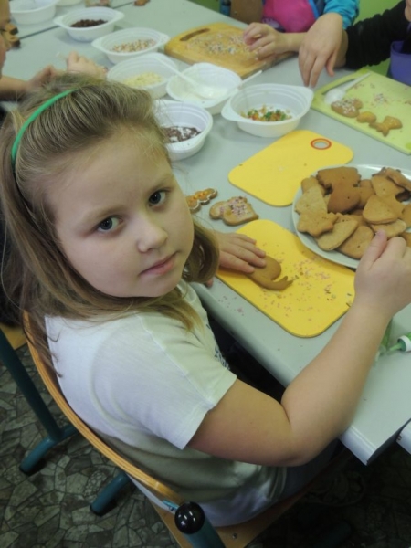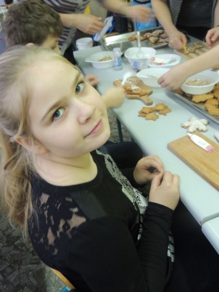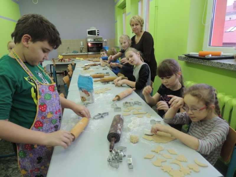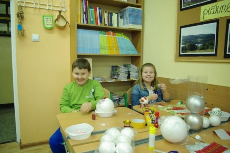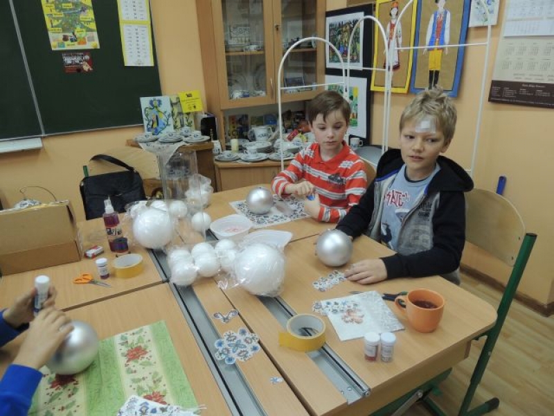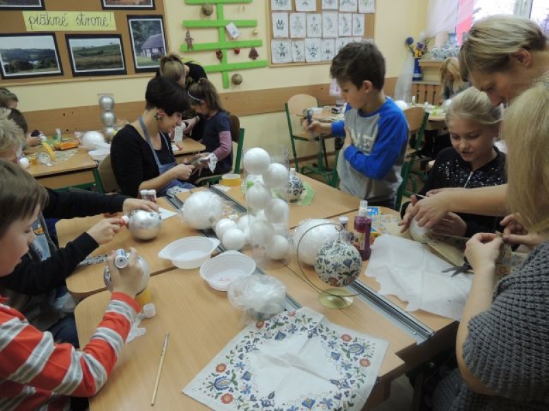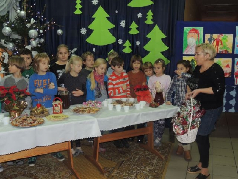 W sobotę, 14 grudnia 2013 r., w naszej szkole odbyły się nietypowe ,,lekcje. Były to zajęcia warsztatowe poświęcone przygotowaniom do świąt pod hasłem ,,Boże Narodzenie na Kaszubach (w ramach realizacji języka kaszubskiego w klasach II - IV). Zajęcia obejmowały warsztaty muzyczne, plastyczne i kulinarne. Dzieci miały okazję zaśpiewać kolędy polskie, kaszubskie i angielskie przy wtórze pianina i gitary. Dużą atrakcją było wycinanie, pieczenie i ozdabianie pierników. Uczniowie mogli też wykazać się dużą kreatywnością podczas samodzielnego wykonywania bombki świątecznej wykorzystując technikę zdobniczą polegającą na przyklejaniu wzoru wyciętego z serwetki papierowej, zwaną decoupage. Przygotowane przez dzieci bombki zostały zawieszone wraz z aromatycznymi pierniczkami i plastrami pomarańczy na świątecznym parawanie, który stanowi teraz niepowtarzalną dekorację holu głównego szkoły. Na zakończenie warsztatów odbyła się degustacja pierników i wspólne kolędowanie. W ten magiczny sposób w naszej szkole już poczuliśmy Święta Bożego Narodzenia.