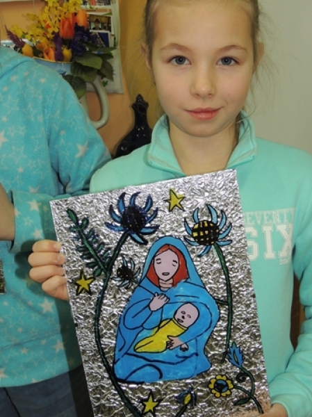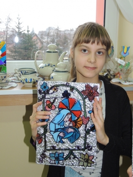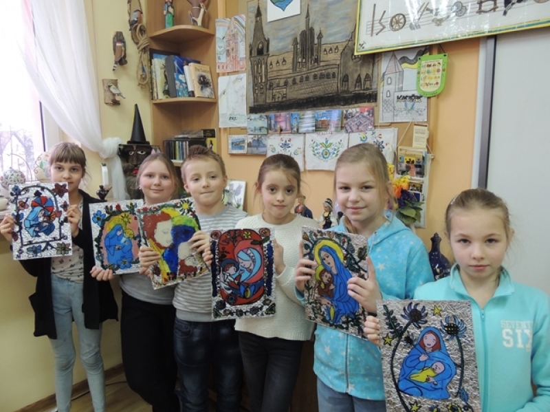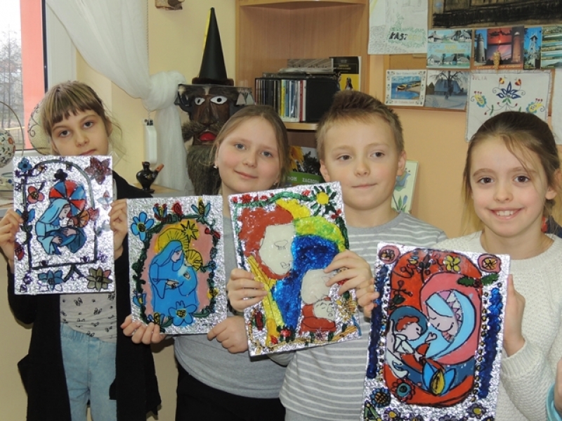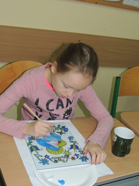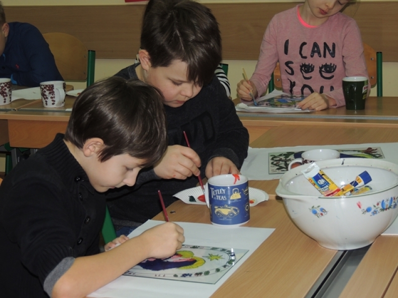 Styczniowe zajęcia języka kaszubskiego w klasach trzecich miały formę warsztatową. Uczniowie w aktywny sposób zapoznali się z kaszubską tradycją ludową jaką jest malarstwo na szkle. W pierwszej fazie pracy dzieci wykonały projekty, w których samodzielnie opracowały ornamentykę kwiatową. Następnie przeniosły te kontury na szkło, aby wypełnić je kolorem. Trzecioklasiści włożyli w te warsztaty dużo wysiłku. Ich kreatywność i i zaangażowanie przyniosło wspaniałe efekty w postaci niepowtarzalnych obrazków na szkle. Taka forma zajęć sprawiła dzieciom mnóstwo przyjemności.
