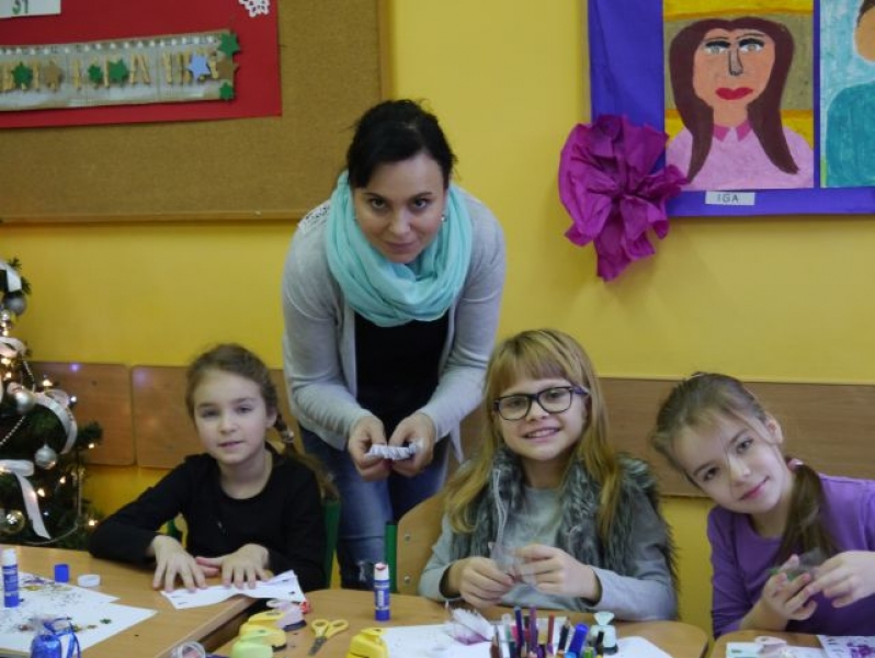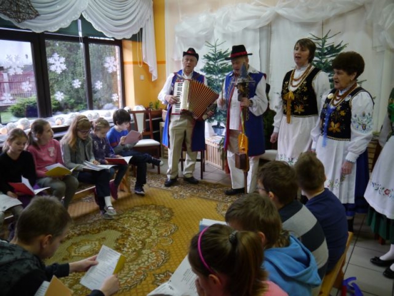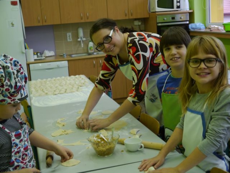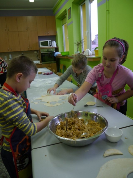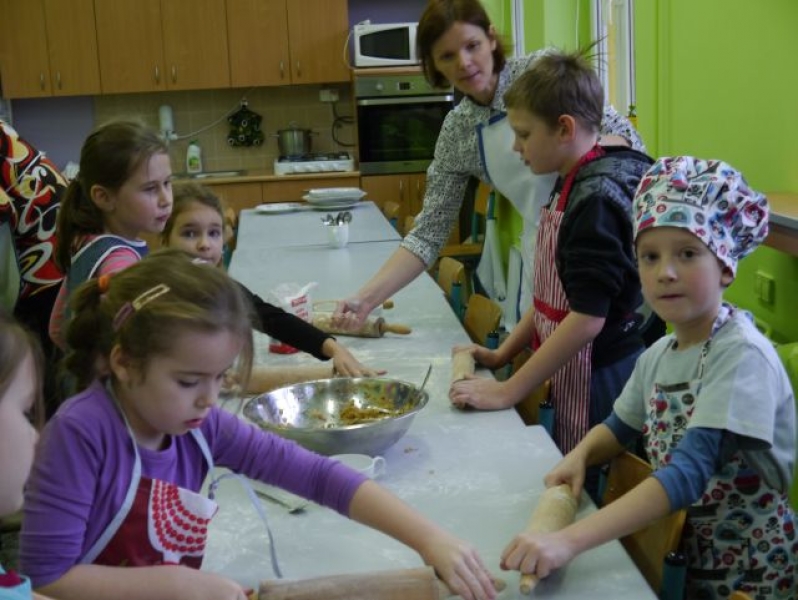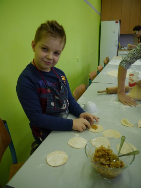 13 grudnia 2014r., w sobotnie przedpołudnie, dzieci z klas drugich i trzecich, w ramach realizacji języka kaszubskiego, uczestniczyły w warsztatach świątecznych poświęconych Bożemu Narodzeniu na Kaszubach. Uczniowie mieli okazję zaśpiewać poznane na zajęciach kolędy i pastorałki kaszubskie z towarzyszeniem lęborskiego zespołu „Levino”. W ramach warsztatów kulinarnych dzieci samodzielnie przygotowywały tradycyjne, wigilijne danie: pierogi z kapustą i grzybami. Przy wtórze kolęd śpiewanych przez zespół „Levino” drugo – i trzecioklasiści z wielkim zapałem wykonywali ozdoby świąteczne. Były to aniołki gliniane lub papierowe oraz bombki kaszubskie (wykonane techniką oklejania, czyli tzw. decuopage). Miłym zakończeniem zajęć była wspólna degustacja pierogów. Nie mogło tu też zabraknąć barszczu czerwonego. Było zatem przepysznie!
