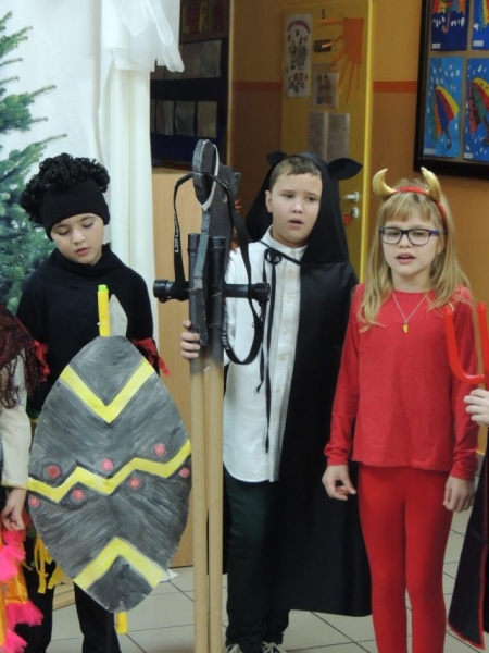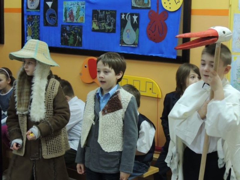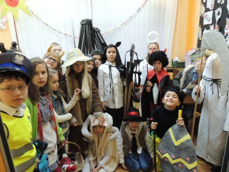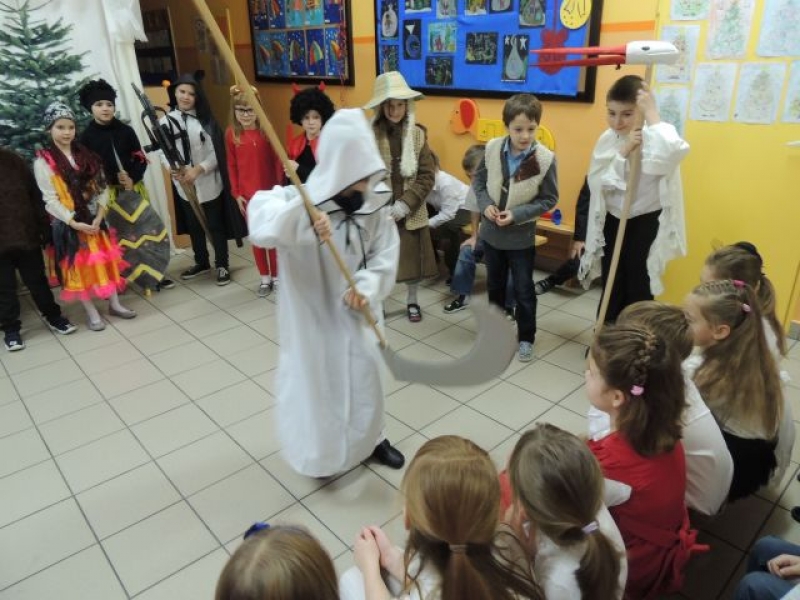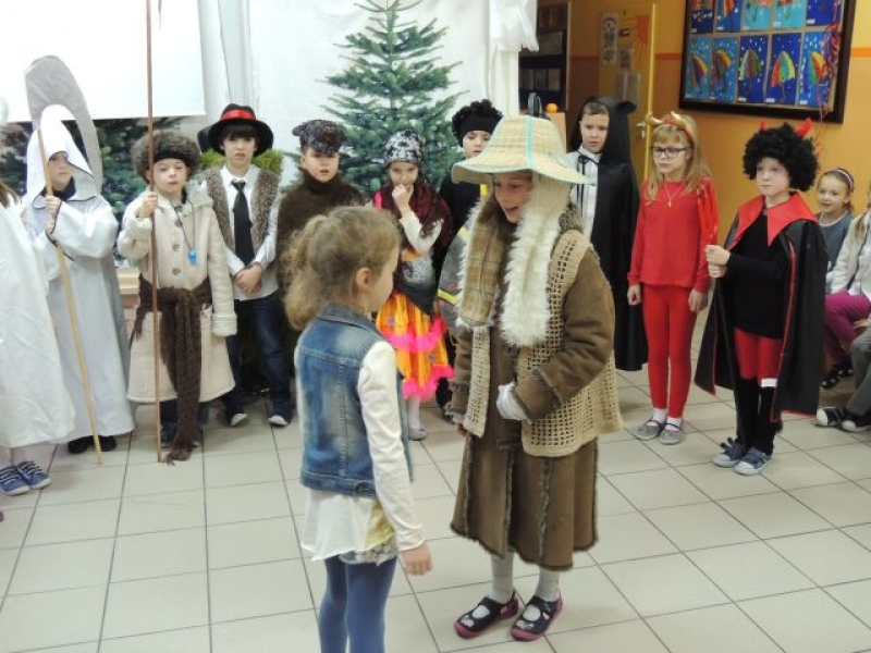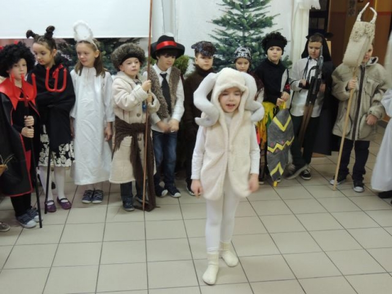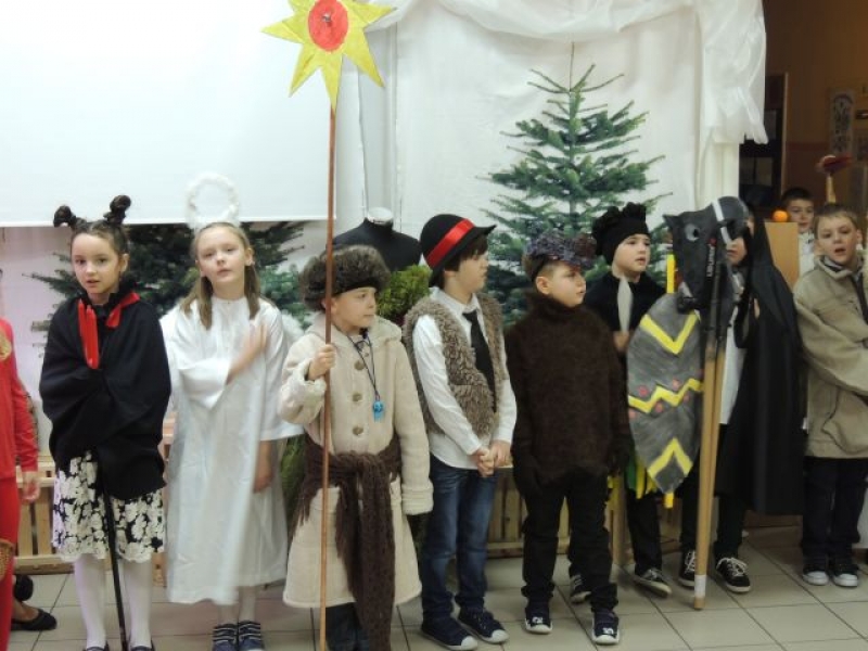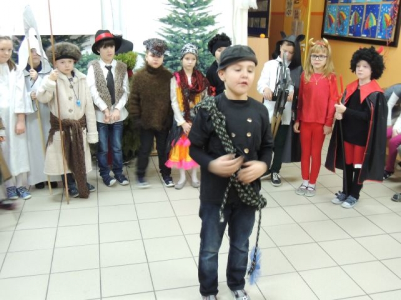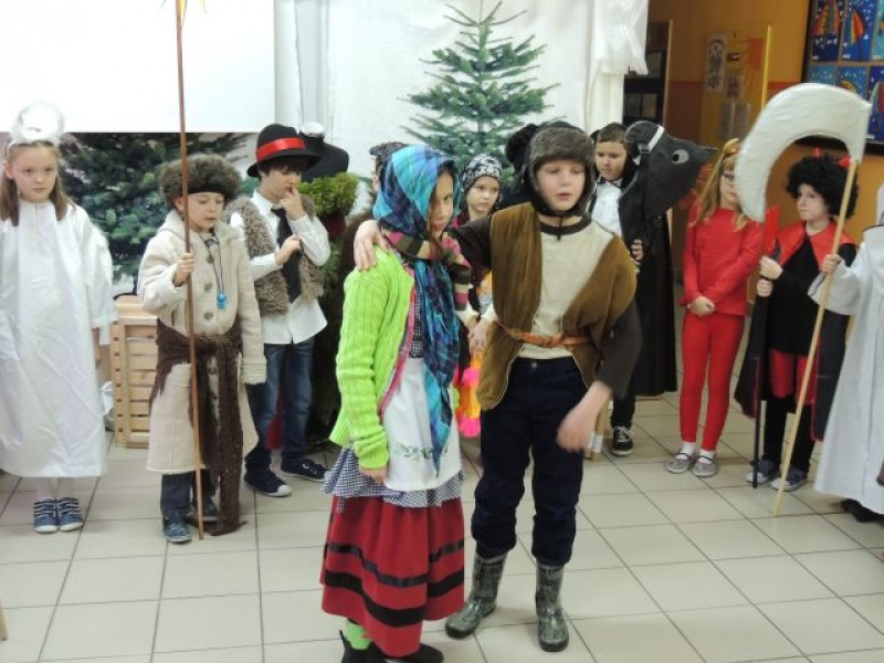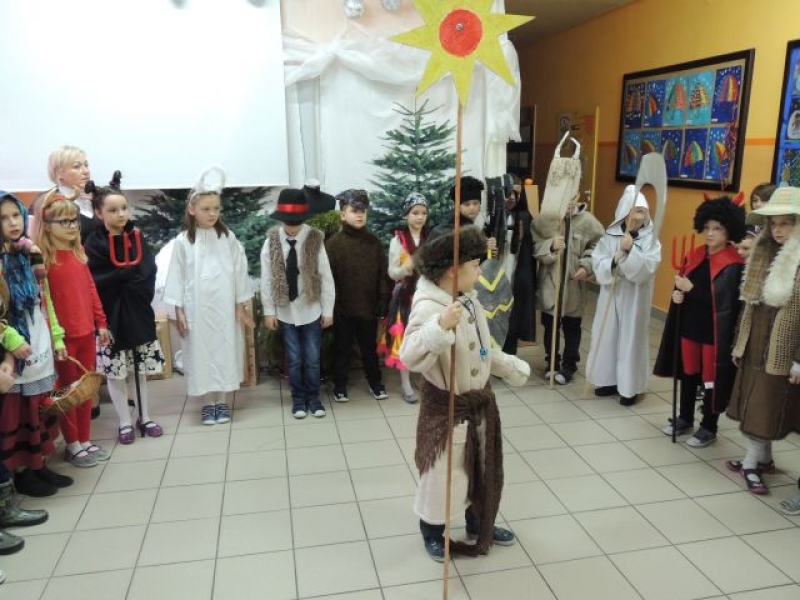 Dawniej na Kaszubach, w okresie bożonarodzeniowym z życzeniami i przyśpiewkami, chodziła „po domach” grupa kolędnicza zwana „gwiôzdką” lub „gwiżdżami”. Aby przybliżyć ten zwyczaj, uczniowie klas drugich, przygotowali przedstawienie kaszubskie pt. „Gwiôzdka jidzë”. W korowodzie przebierańców pojawili się: baba z chłopem, diabeł, bocian, śmierć, stróż zwany gwiżdżem, gwiazdka, cyganka, policjant, kominiarz, murzyn, kozioł, baran, koń, niedźwiedź. Były kaszubskie życzenia, kolędy i tańce. Pozostali uczniowie z uwagą przyglądali się wspaniałej grze aktorskiej dzieci z klas drugich. W ten łatwy i przyjemny sposób utrwalili swoją wiedzę o tradycjach regionalnych w okresie Bożego Narodzenia. Występ bardzo się wszystkim spodobał.