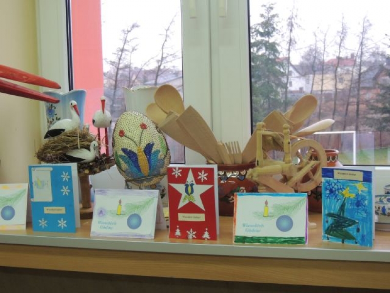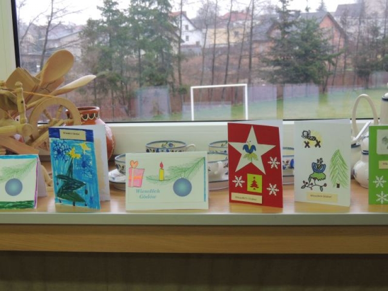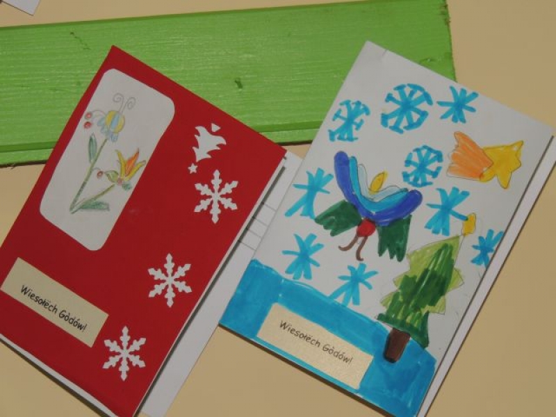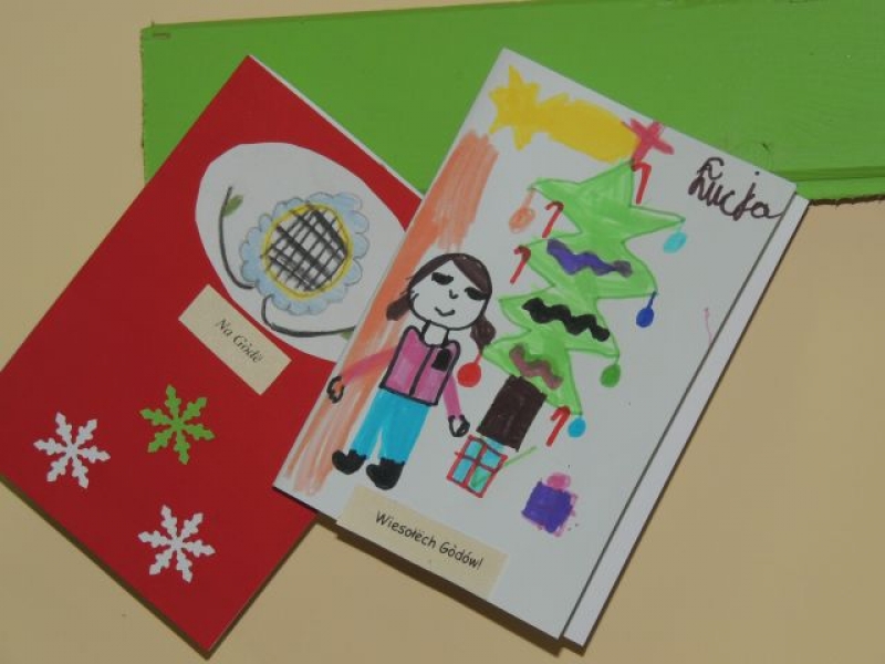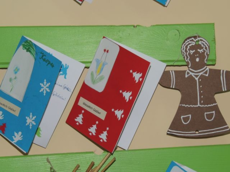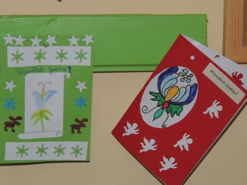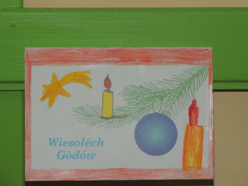 Ostatnio na lekcjach języka kaszubskiego uczniowie wykonywali ciekawe kartki świąteczne. Dzieci, przy okazji omawiania zwyczajów bożonarodzeniowych na Kaszubach, miały możliwość ćwiczyć też pisanie życzeń świątecznych po kaszubsku. Kartki wykonane przez dzieci zostały zawieszone na nietypowej choince w sali kaszubskiej i stanowią piękną dekorację klasy na Gòdë.