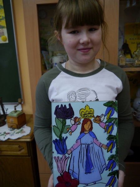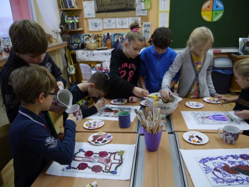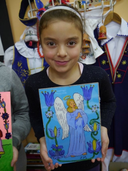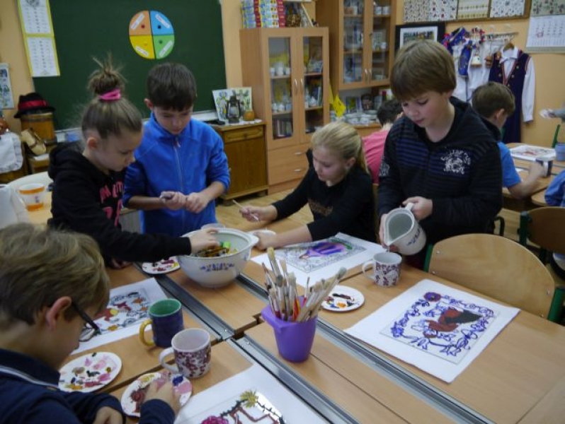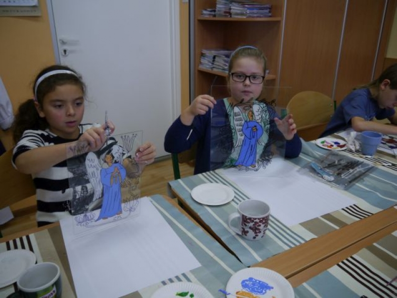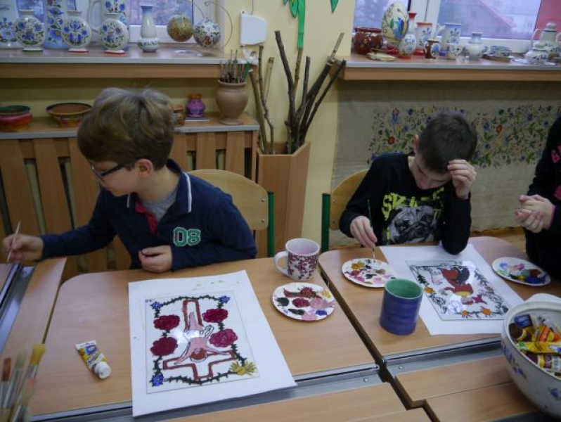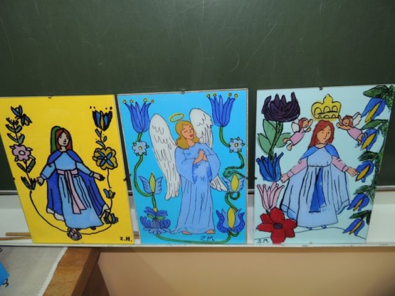 Na przełomie listopada i grudnia 2014r. uczniowie klas trzecich, w ramach zajęć języka kaszubskiego, zajmowali się kaszubskim, ludowym malarstwem na szkle. Uczniowie dowiedzieli się, że Kaszubi malowali wyłącznie tylko to, co im odpowiadało, a postacie świętych zaczerpywali z drzeworytu ludowego. Całe jednak malarstwo kaszubskie polegało na radosnym uwidacznianiu ornamentyki. Zajęcia te miały praktyczny charakter. Odbyły się w formie warsztatów malarskich. Uczniowie najpierw wykonali projekt, według własnego pomysłu, potem przenieśli go na szybę, aby ostatecznie wypełnić kontury odpowiednimi kolorami z zastosowaniem farb. Obrazy zostały oprawione w antyramy i stanowią piękna ozdobę sali kaszubskiej.
