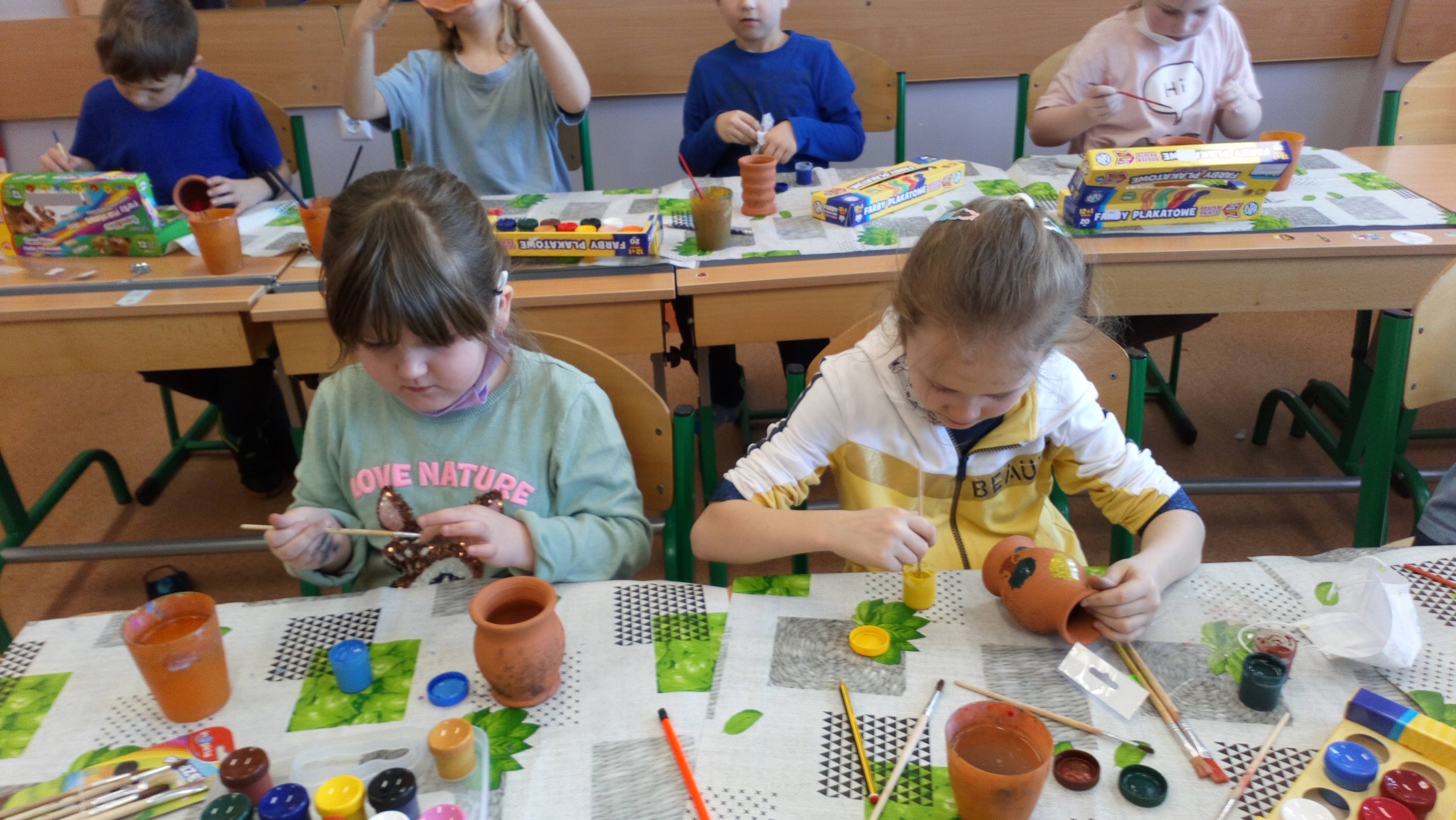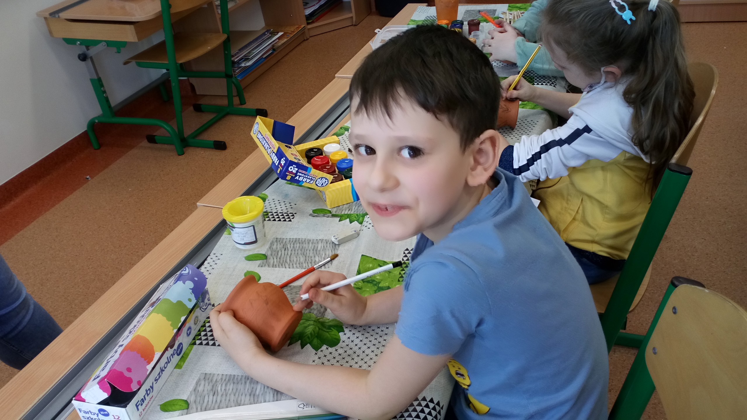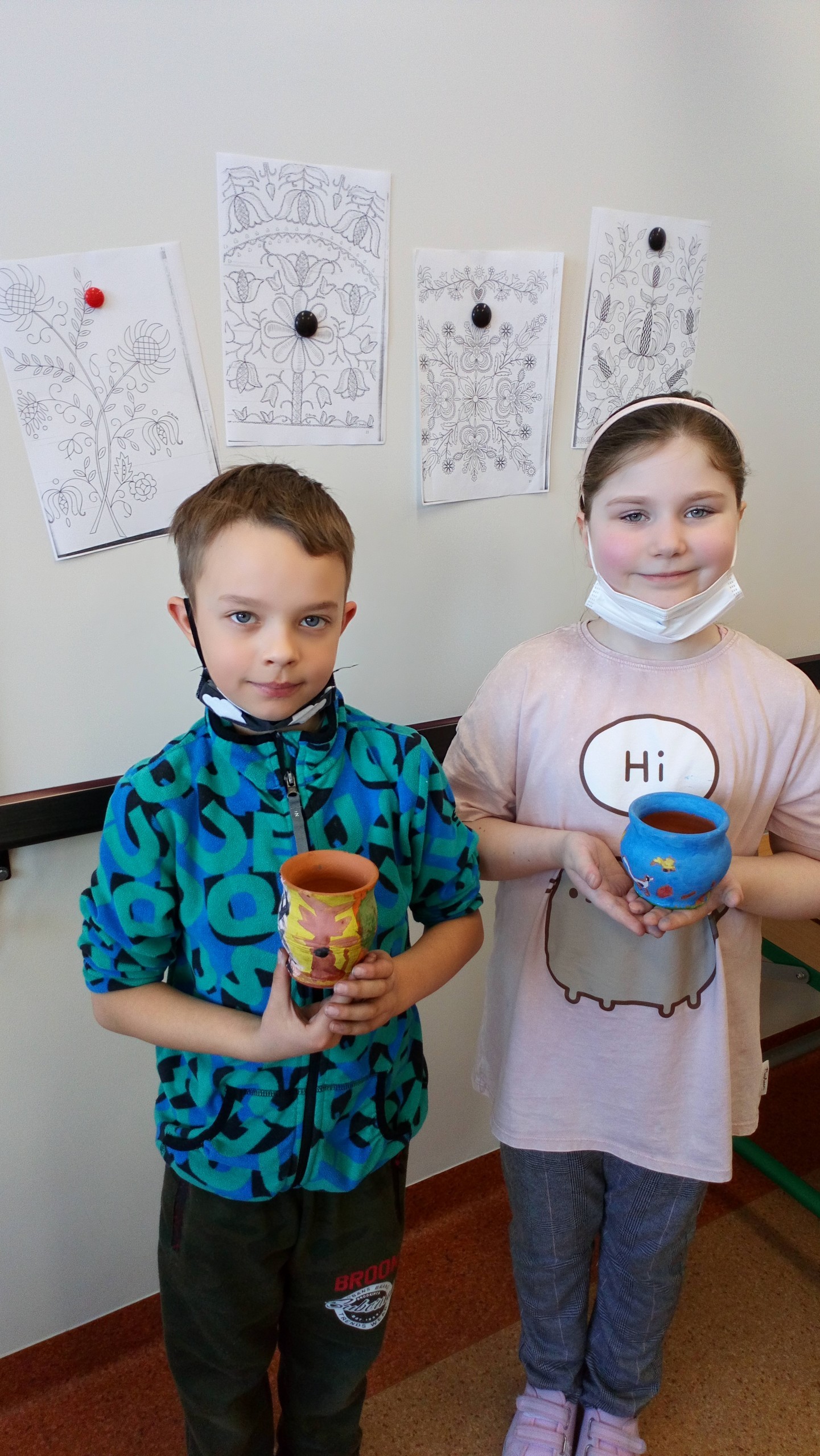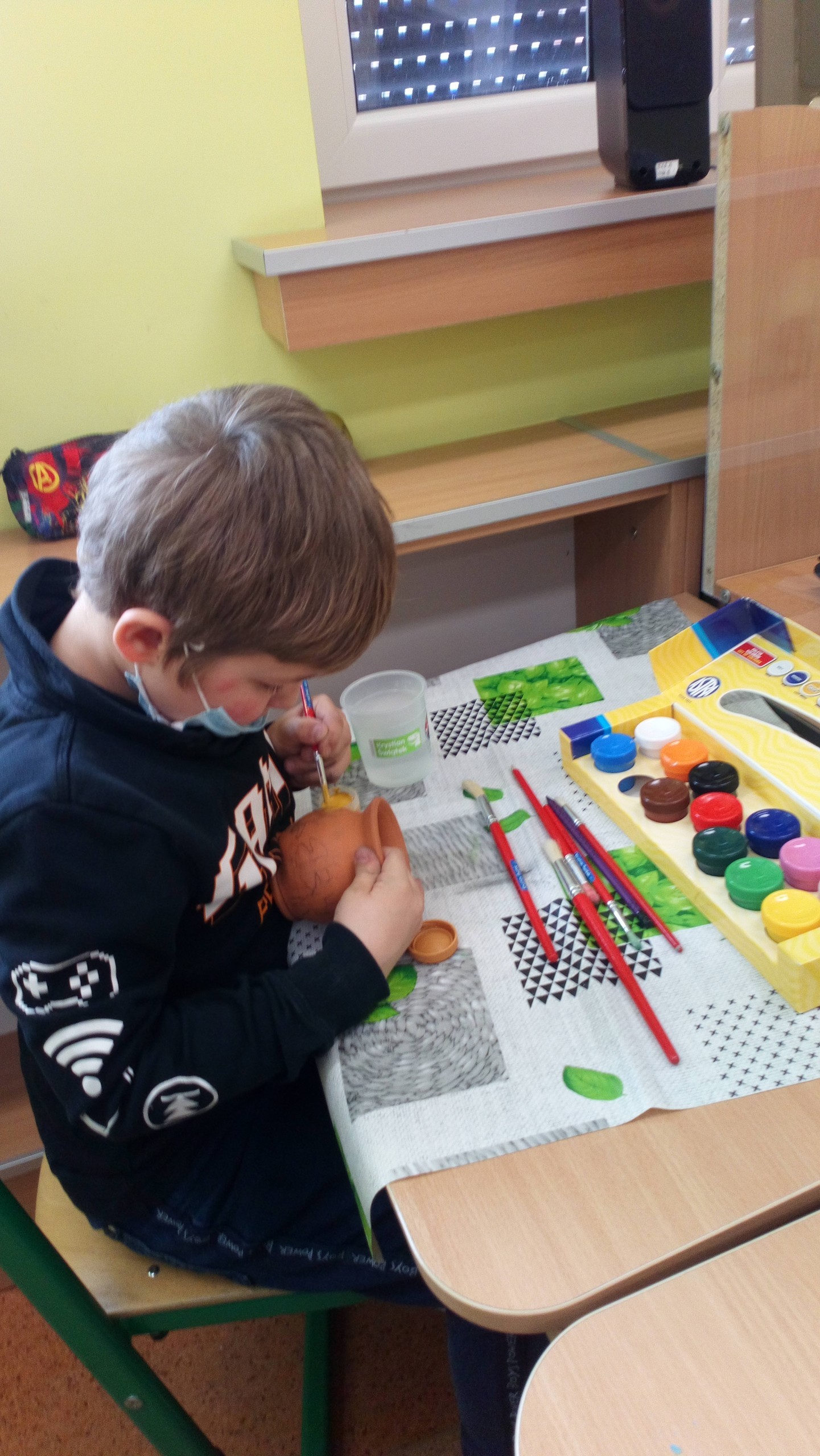 19 marca 2021 r. odbyły się warsztaty kaszubskie dla klas pierwszych, realizowane w ramach nauki języka kaszubskiego. Podczas tych zajęć dzieci ozdabiały wyroby z gliny, wykonane jesienią podczas warsztatów garncarskich. Inspiracją dla pierwszoklasistów były motywy wiosenne. Uczniowie pomalowali przepięknie swoje wazoniki i miseczki. Udział w warsztatach sprawił im ogromna radość.
