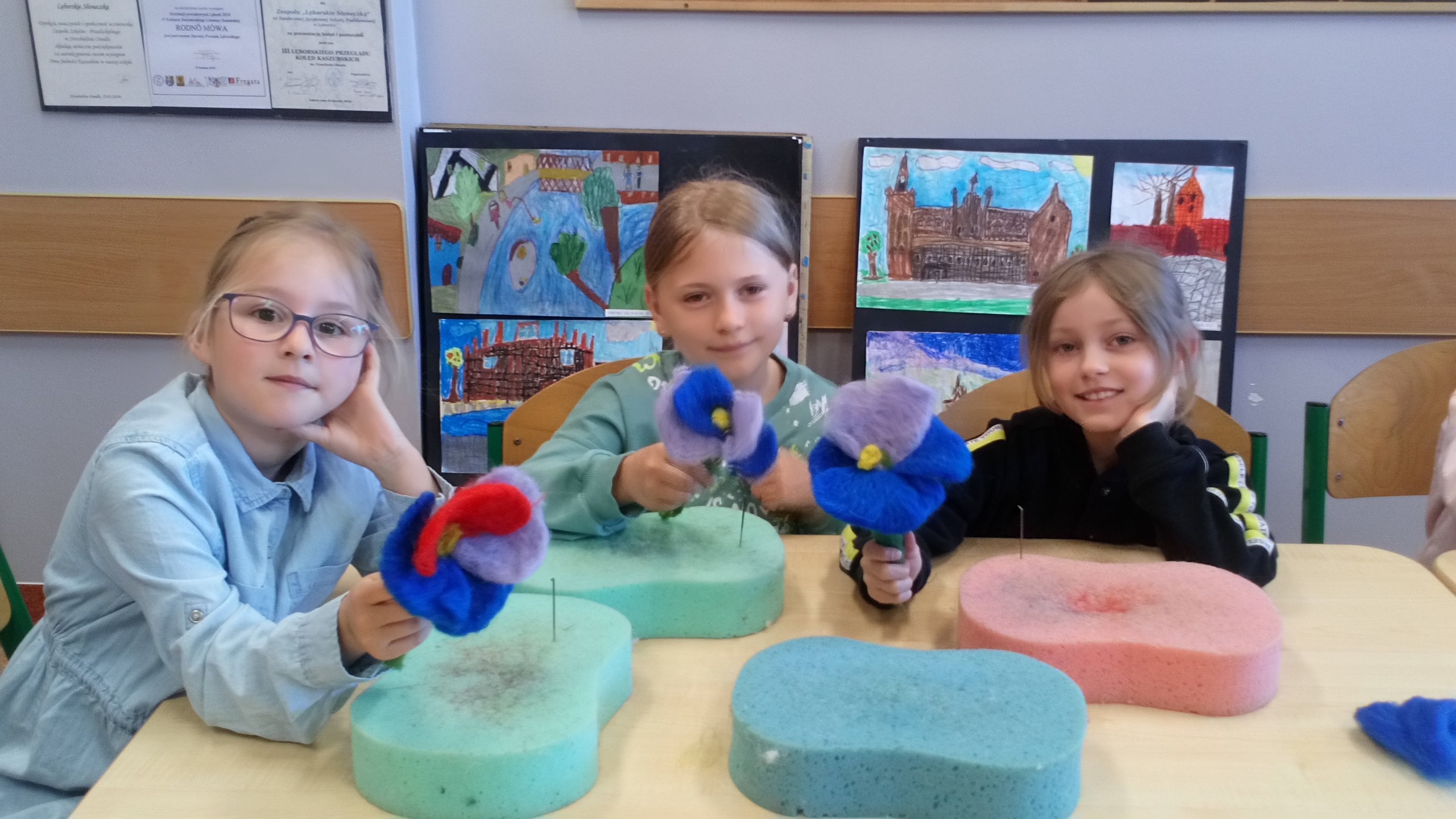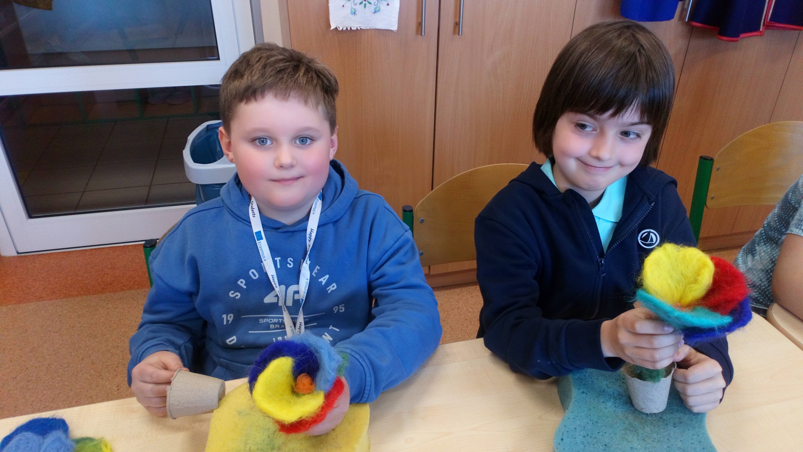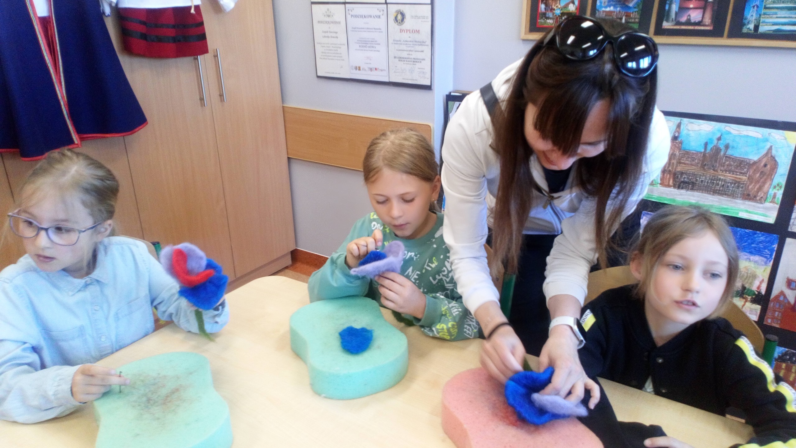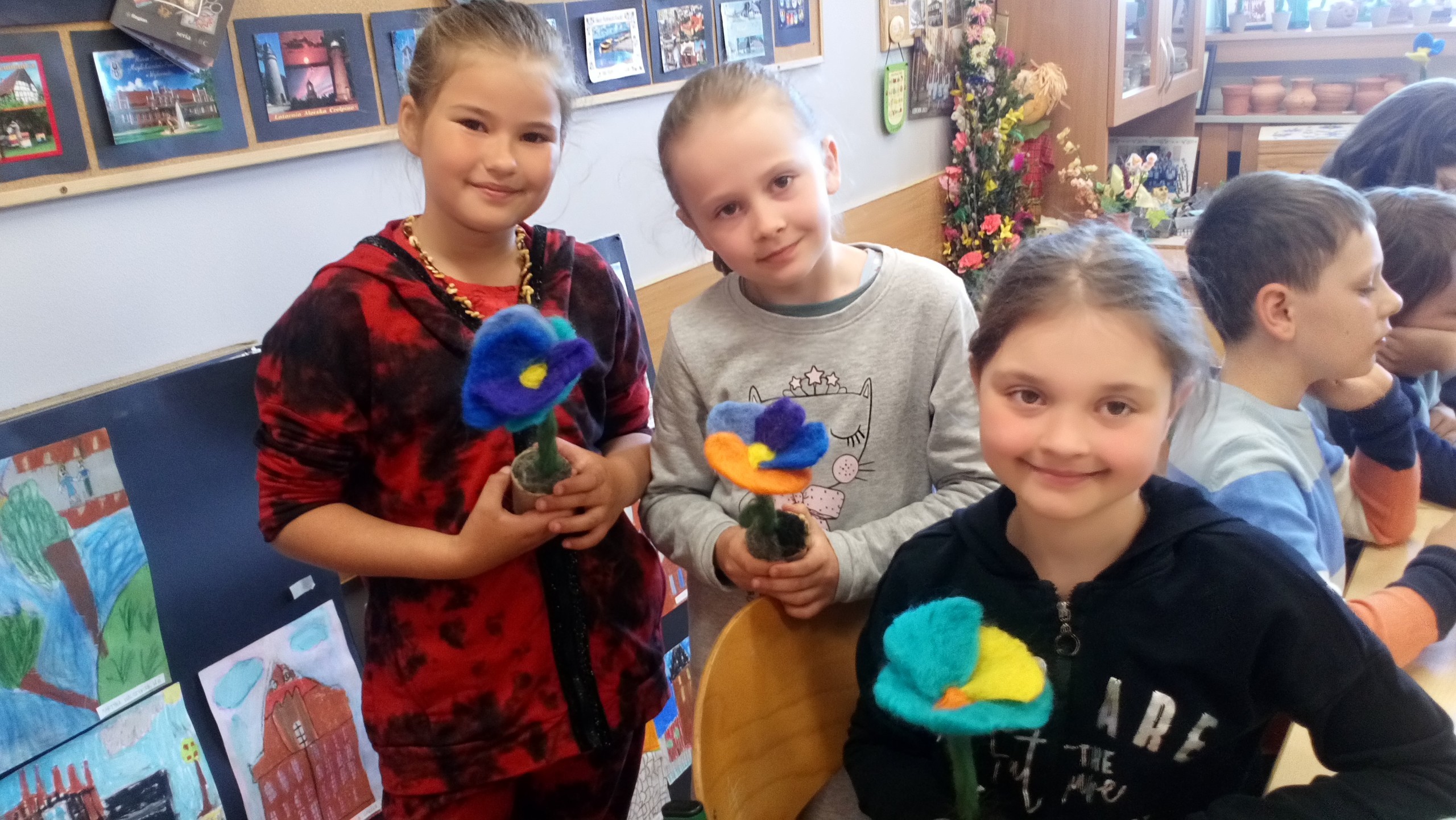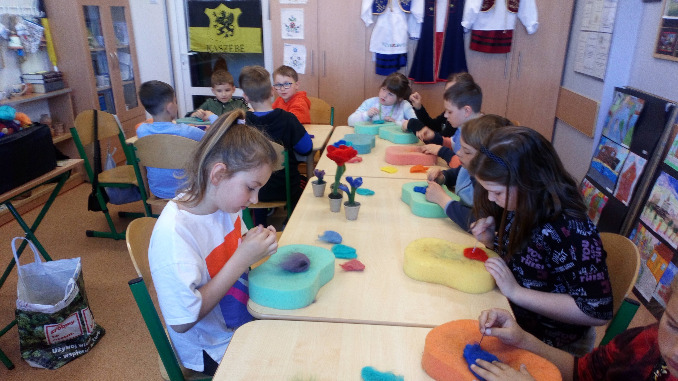 Uczniowie klas I – III , w ramach realizacji języka kaszubskiego, uczestniczyli w maju w warsztatach rękodzieła – filcowanie na sucho. Warsztaty poprowadziła p.Tatiana Słojka ze Słupska. Dzieci miały okazję wykonać kwiatki przestrzenne z filcu. Zajęcia bardzo się dzieciom podobały, a wytwory ich pracy były przepiękne.