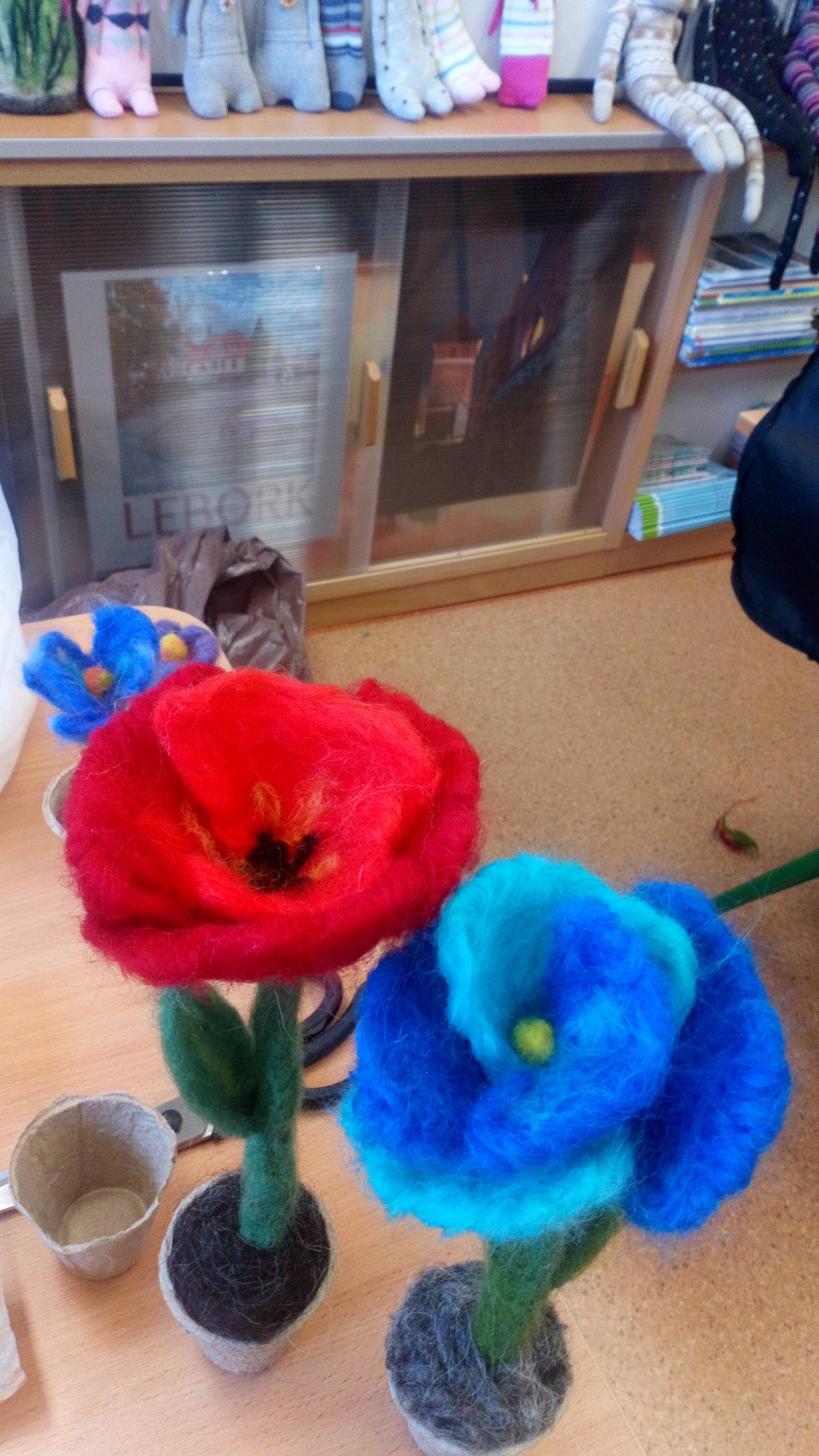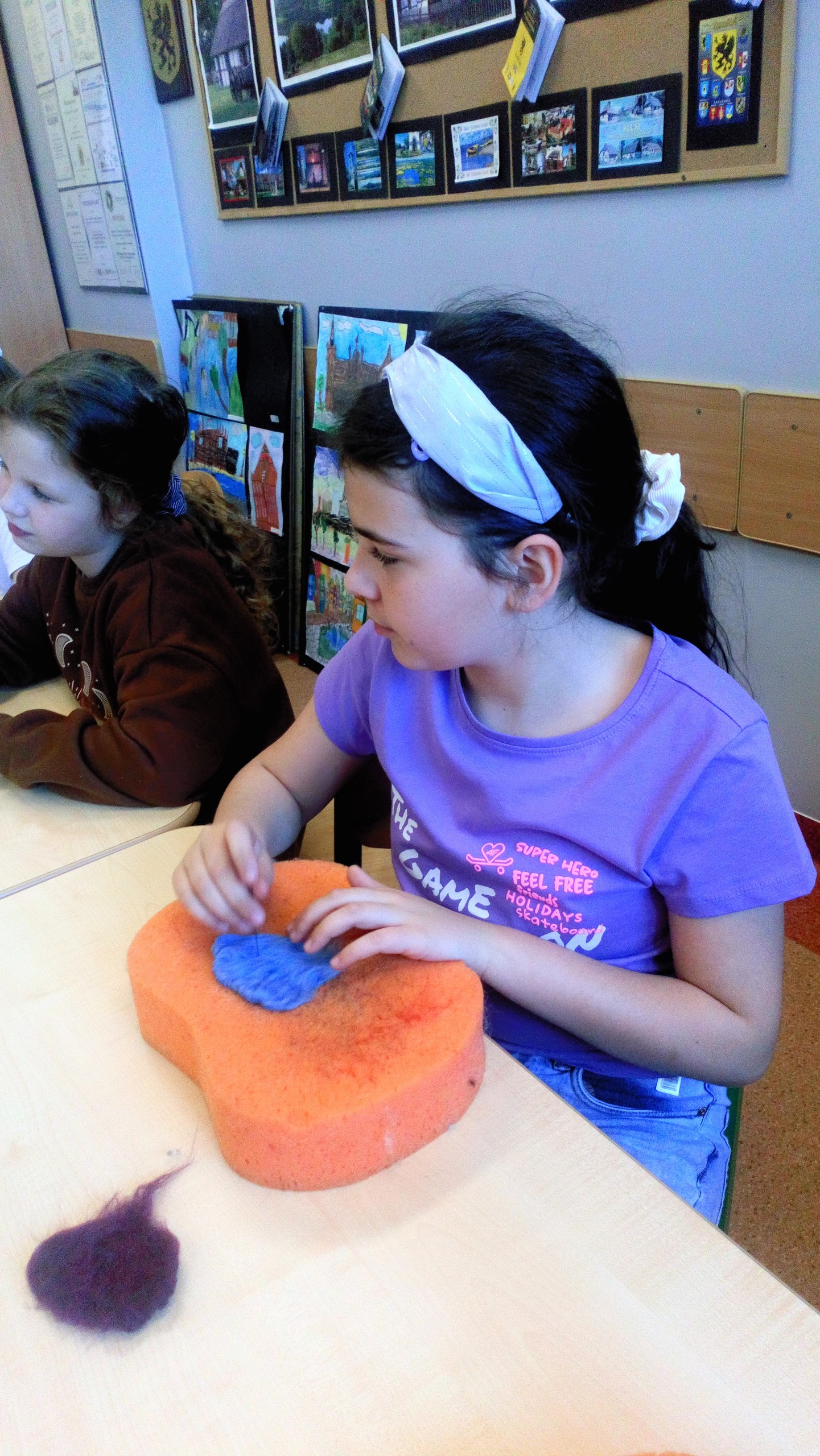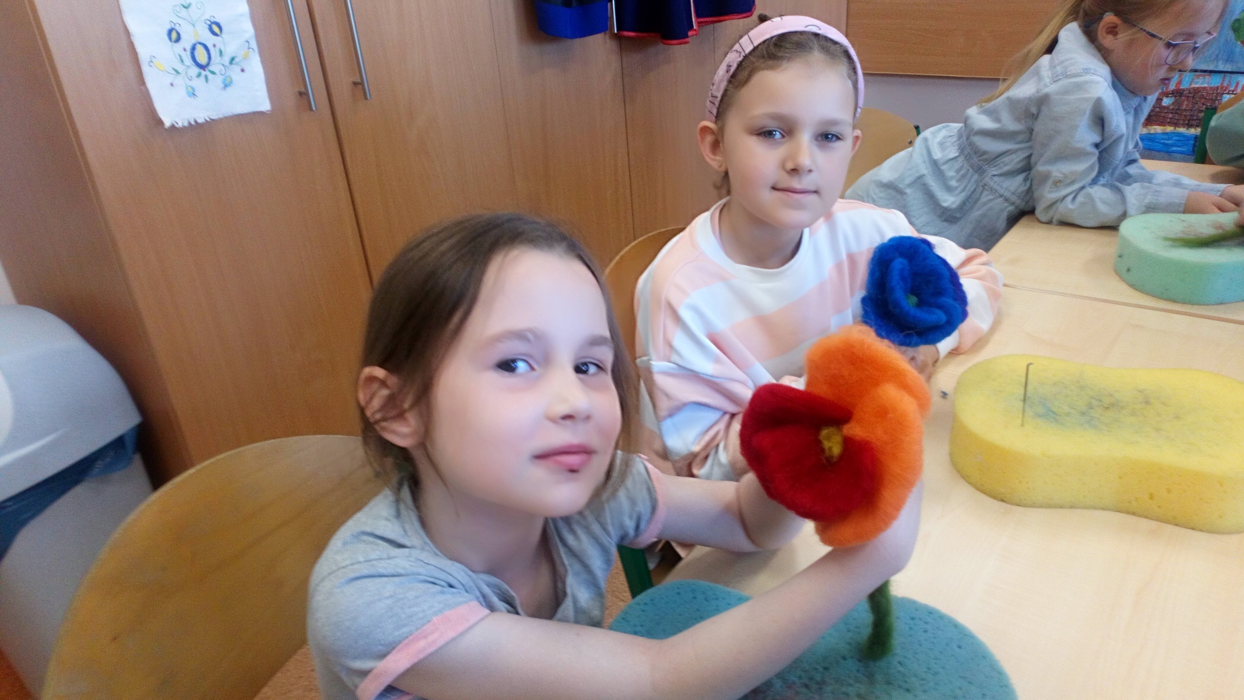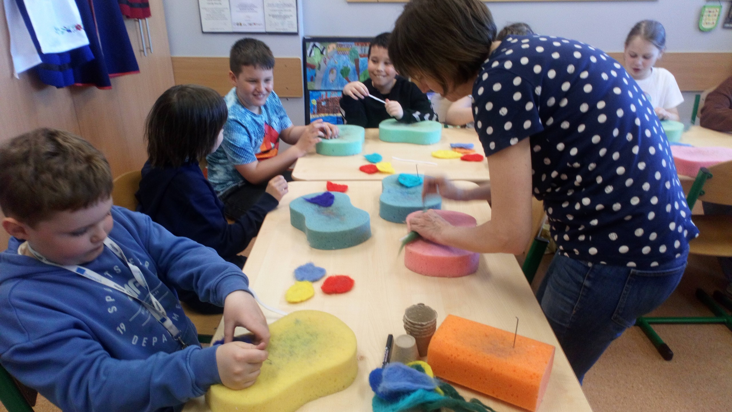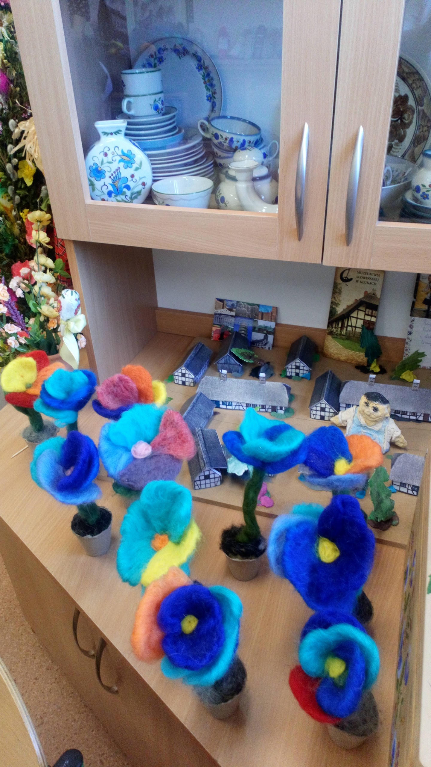 Uczniowie klas I – III , w ramach realizacji języka kaszubskiego, uczestniczyli w maju w warsztatach rękodzieła – filcowanie na sucho. Warsztaty poprowadziła p.Tatiana Słojka ze Słupska. Dzieci miały okazję wykonać kwiatki przestrzenne z filcu. Zajęcia bardzo się dzieciom podobały, a wytwory ich pracy były przepiękne.