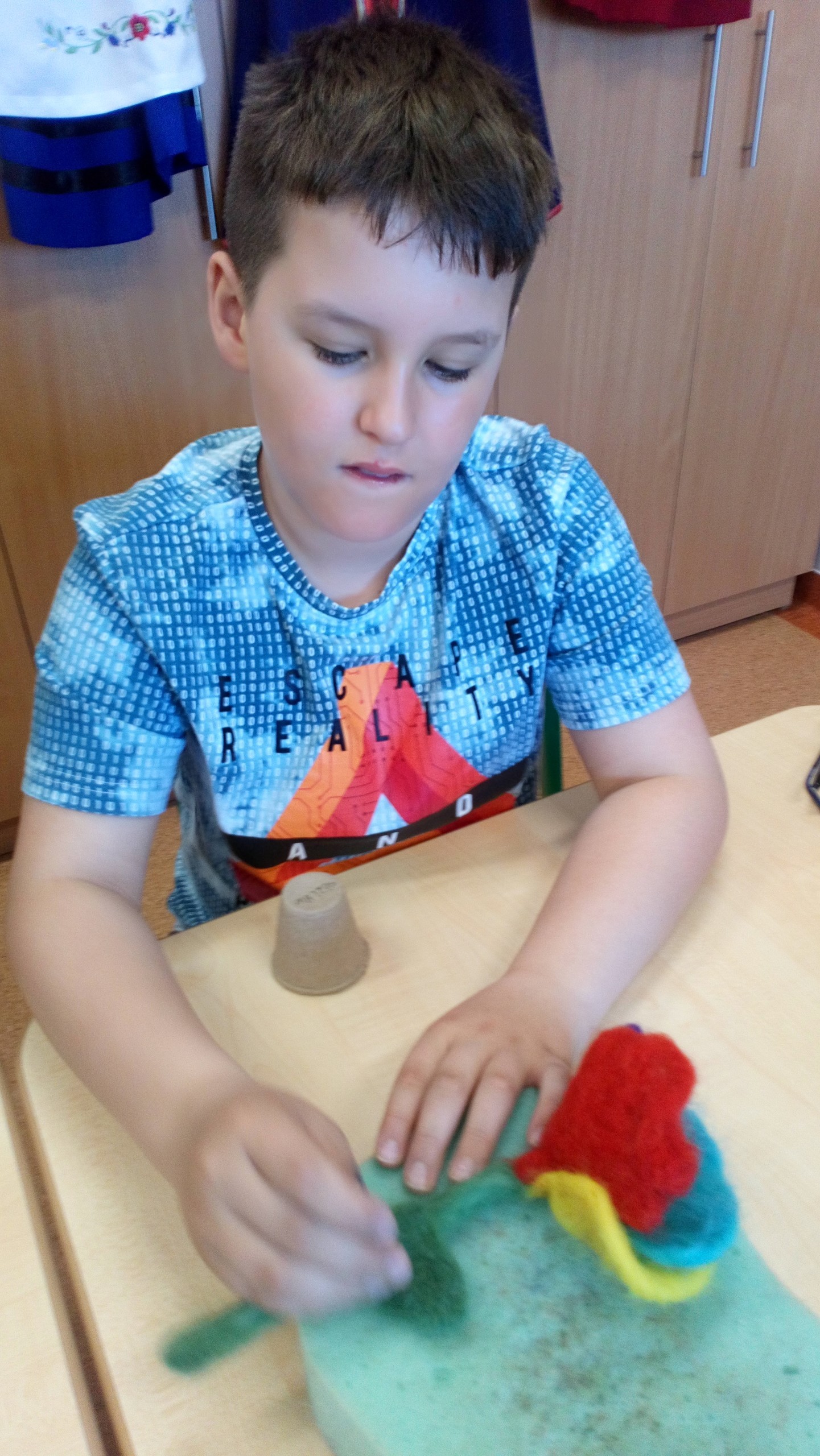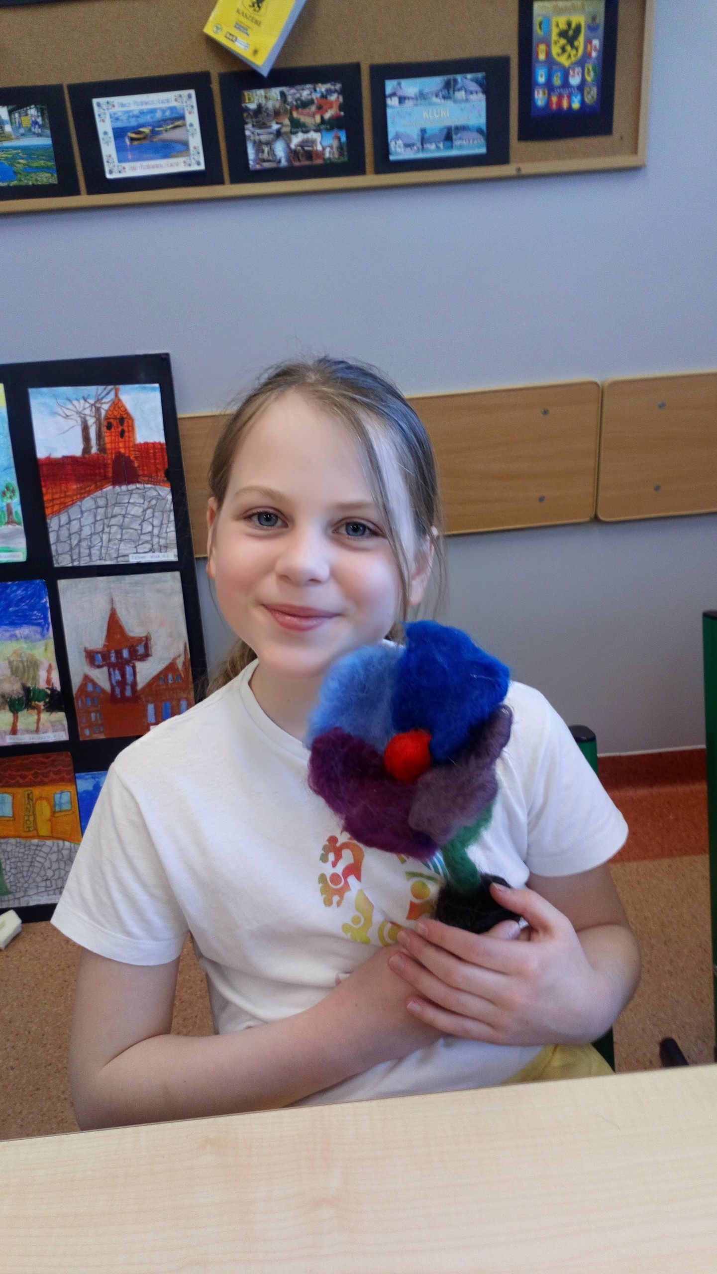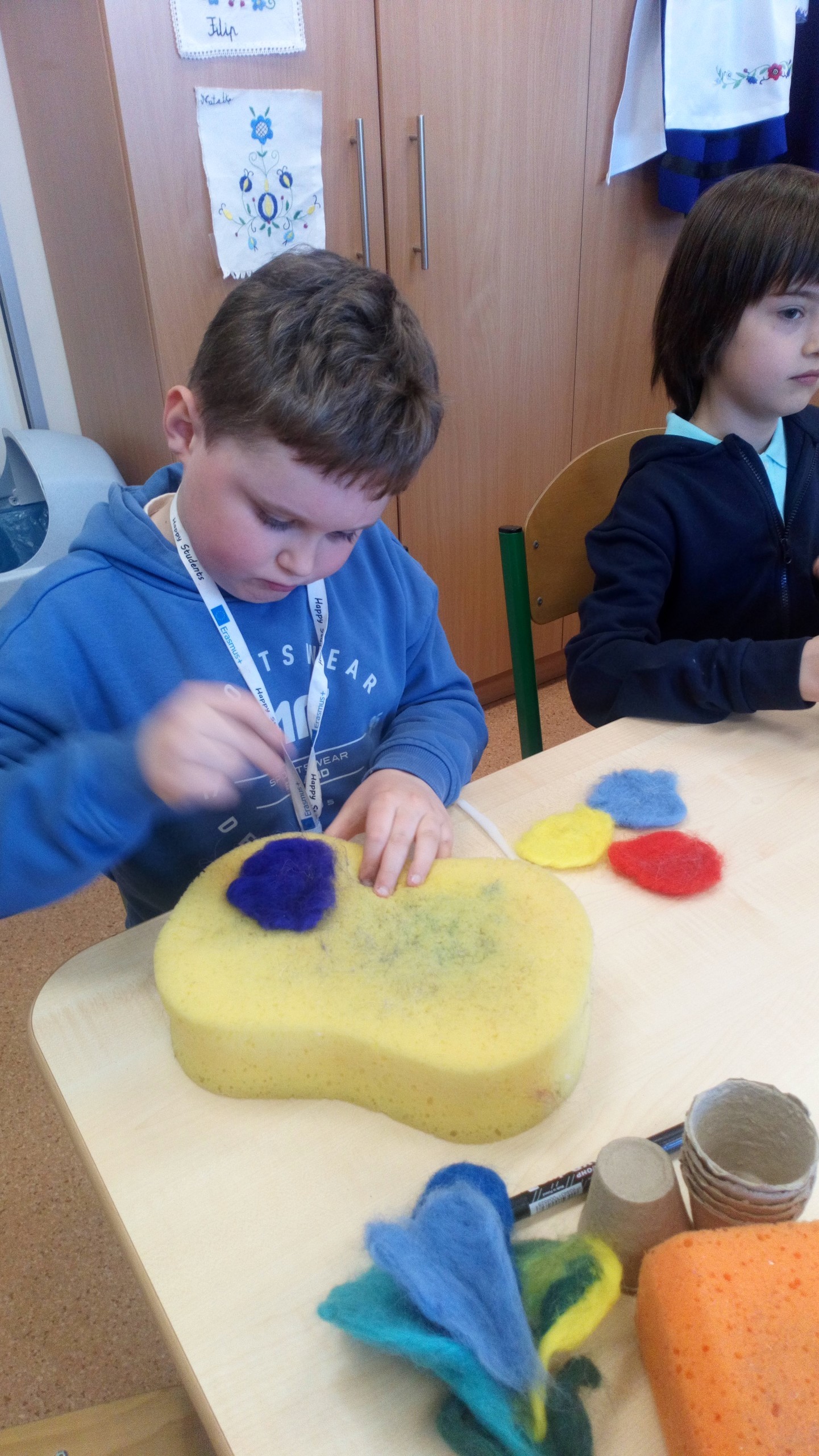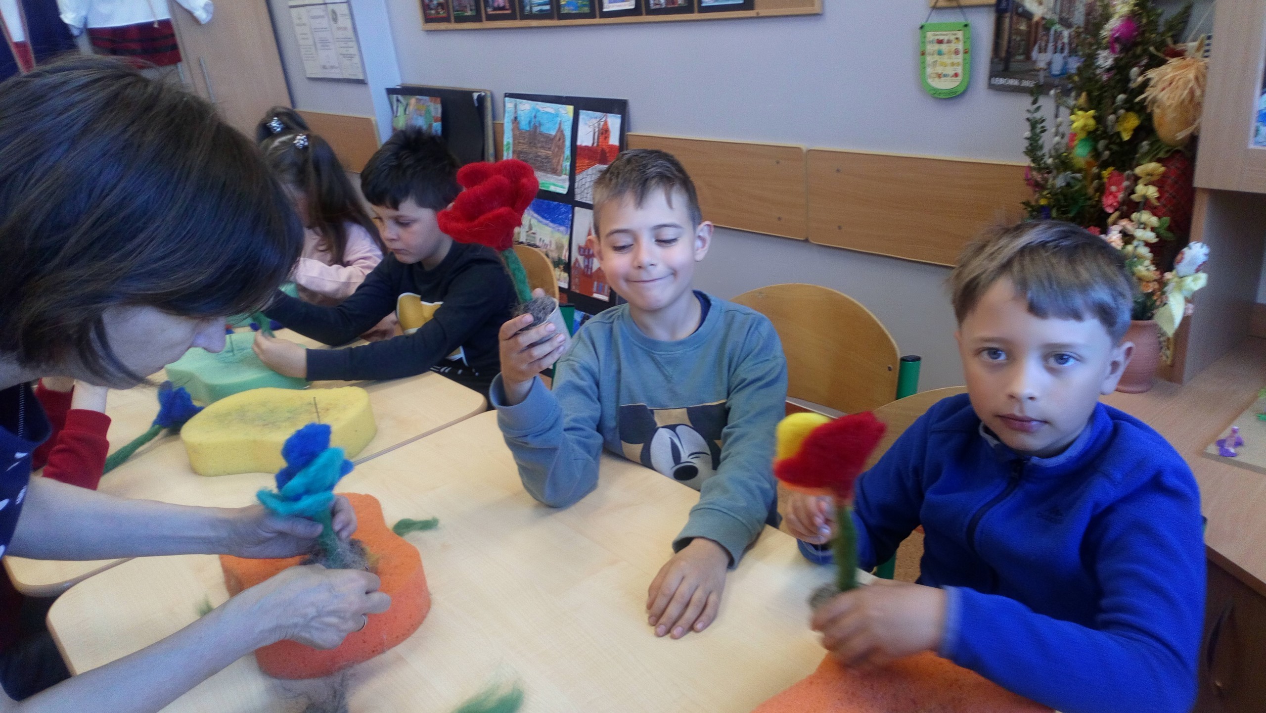 Uczniowie klas I – III , w ramach realizacji języka kaszubskiego, uczestniczyli w maju w warsztatach rękodzieła – filcowanie na sucho. Warsztaty poprowadziła p.Tatiana Słojka ze Słupska. Dzieci miały okazję wykonać kwiatki przestrzenne z filcu. Zajęcia bardzo się dzieciom podobały, a wytwory ich pracy były przepiękne.