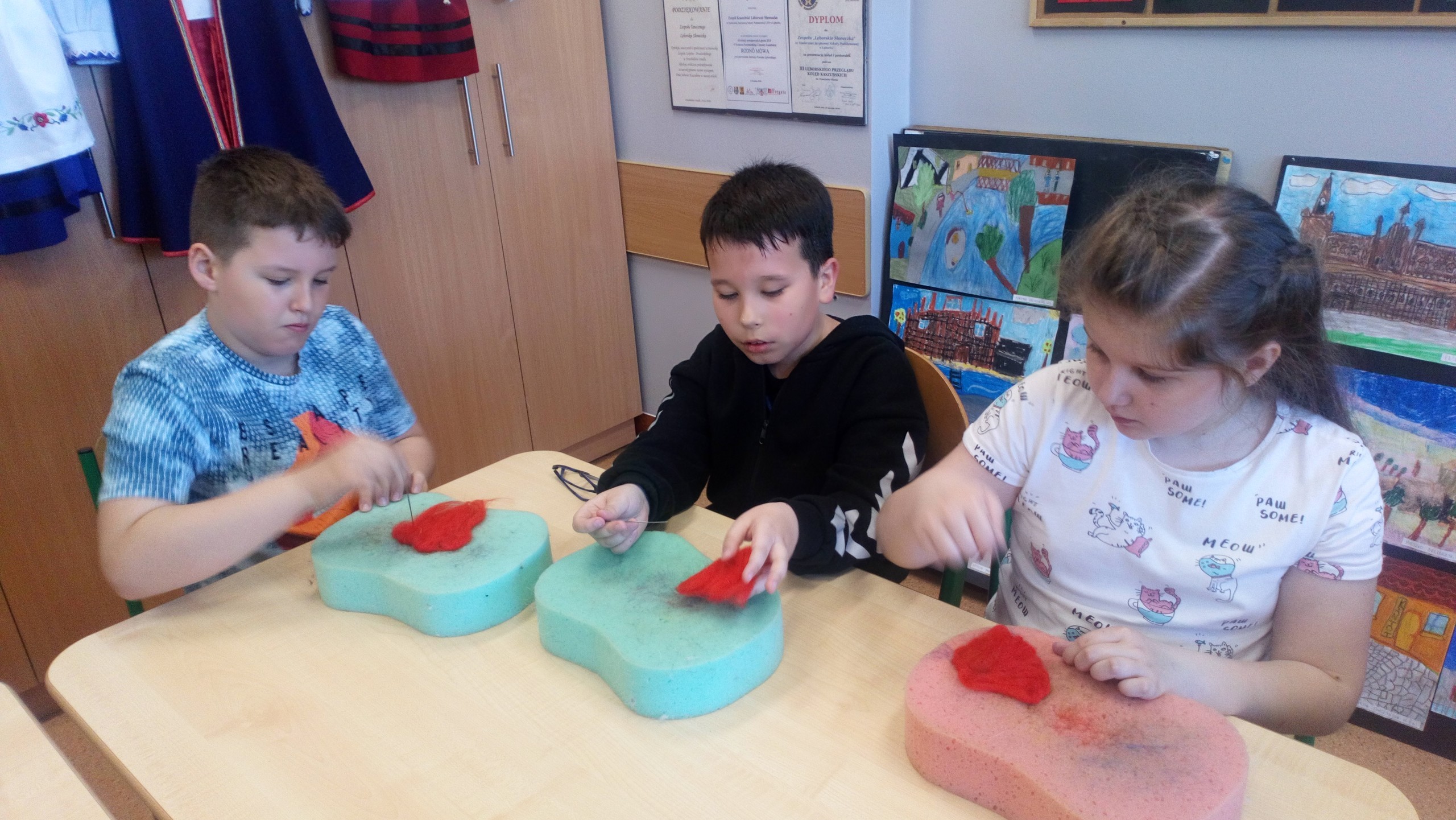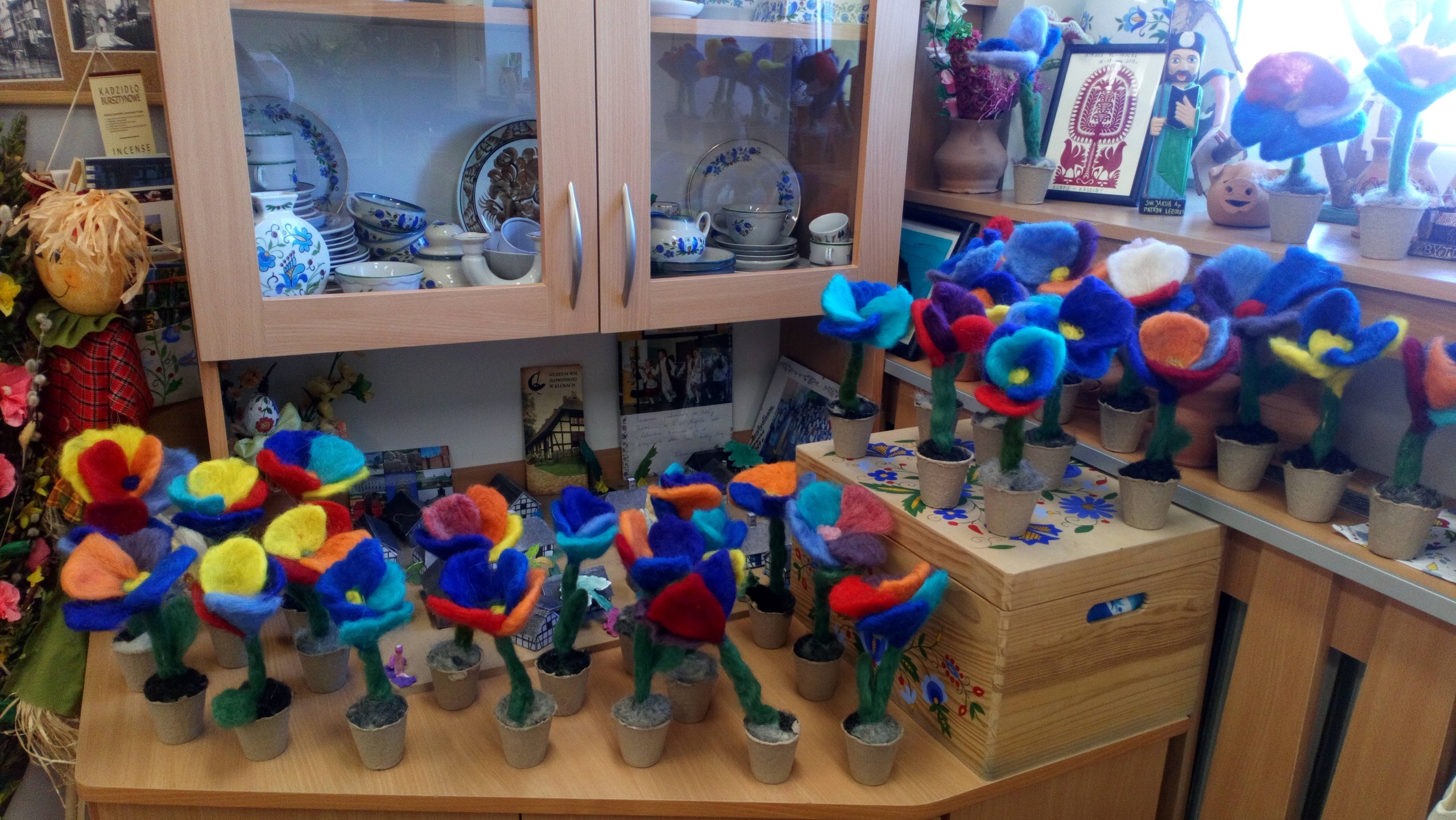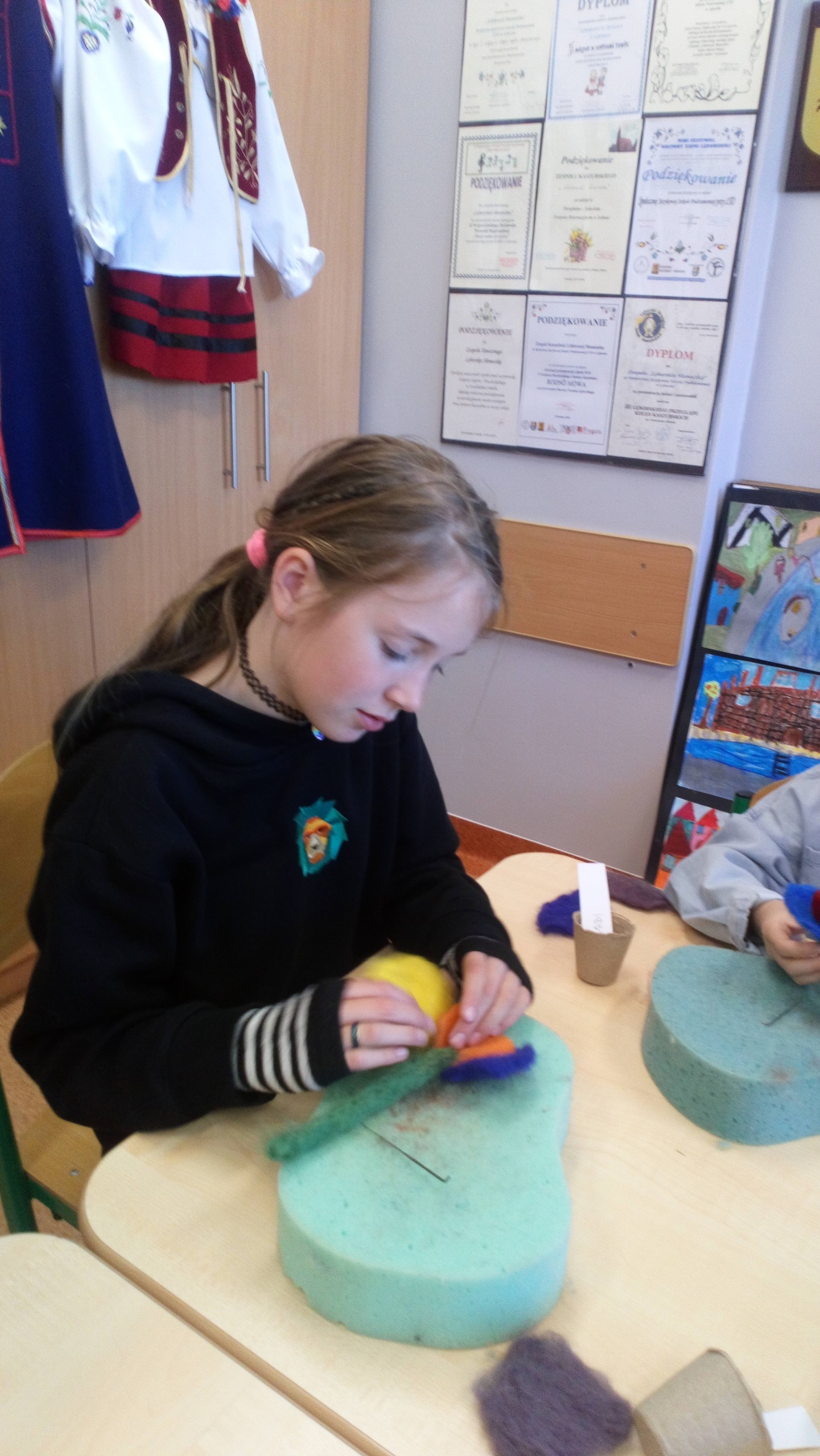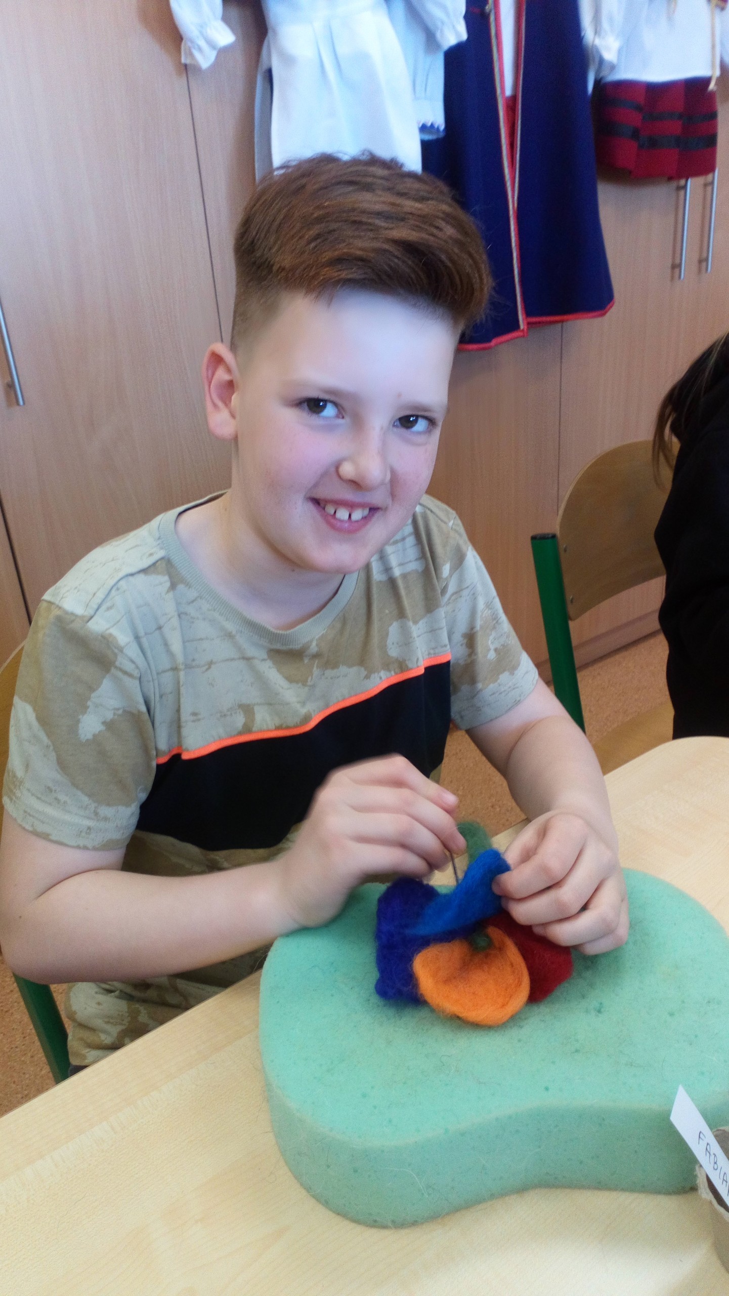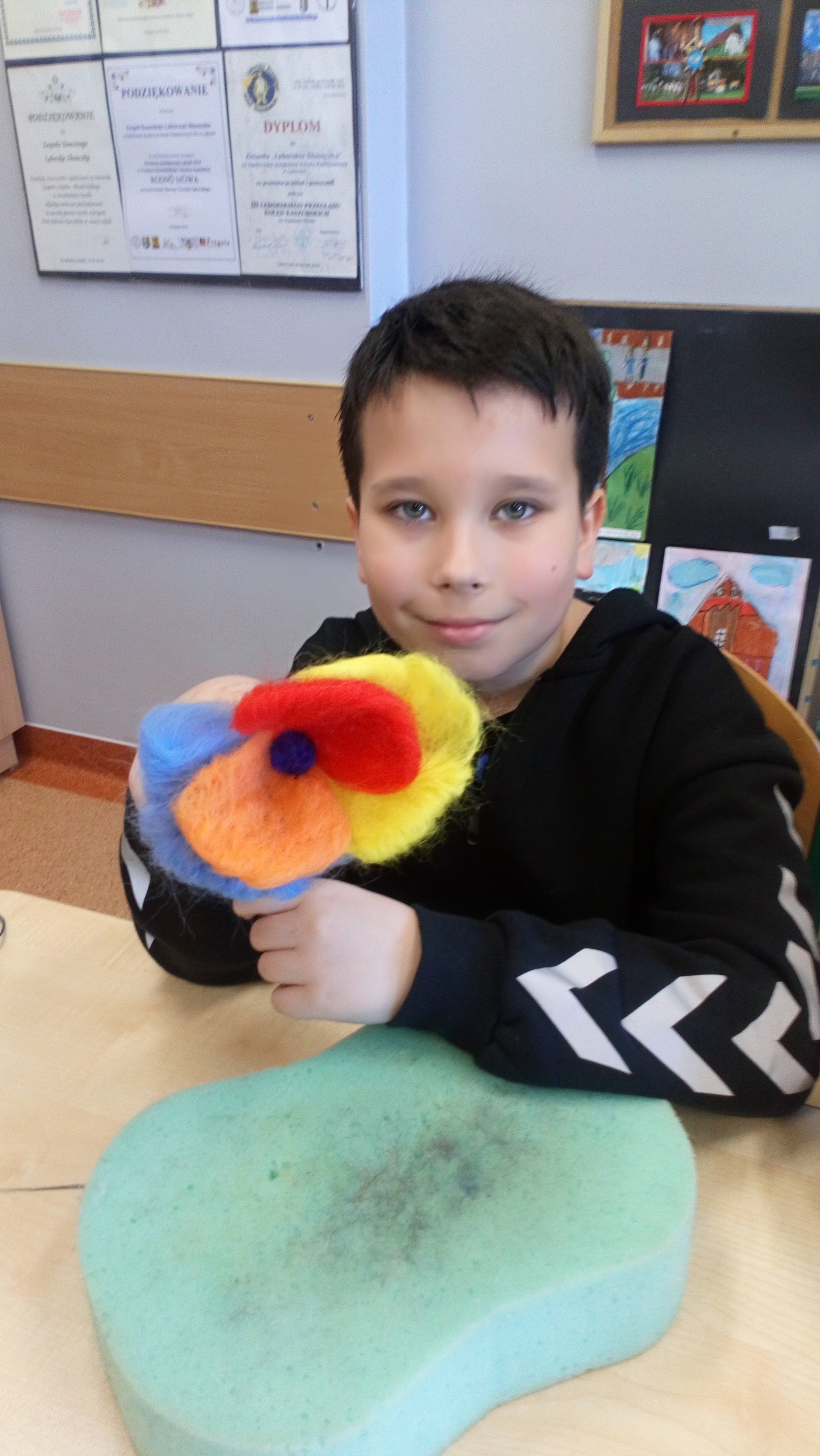 Uczniowie klas I – III , w ramach realizacji języka kaszubskiego, uczestniczyli w maju w warsztatach rękodzieła – filcowanie na sucho. Warsztaty poprowadziła p.Tatiana Słojka ze Słupska. Dzieci miały okazję wykonać kwiatki przestrzenne z filcu. Zajęcia bardzo się dzieciom podobały, a wytwory ich pracy były przepiękne.