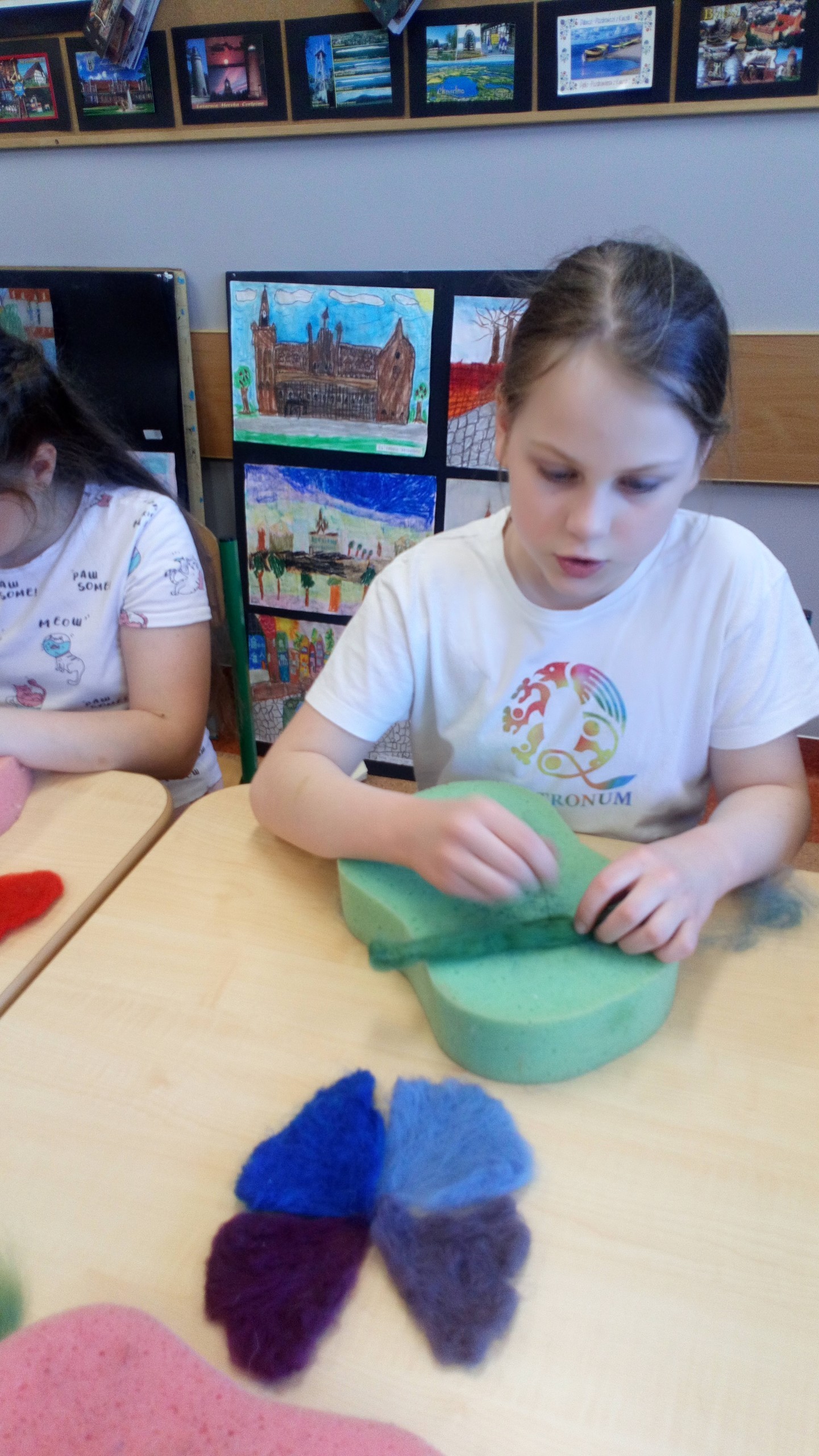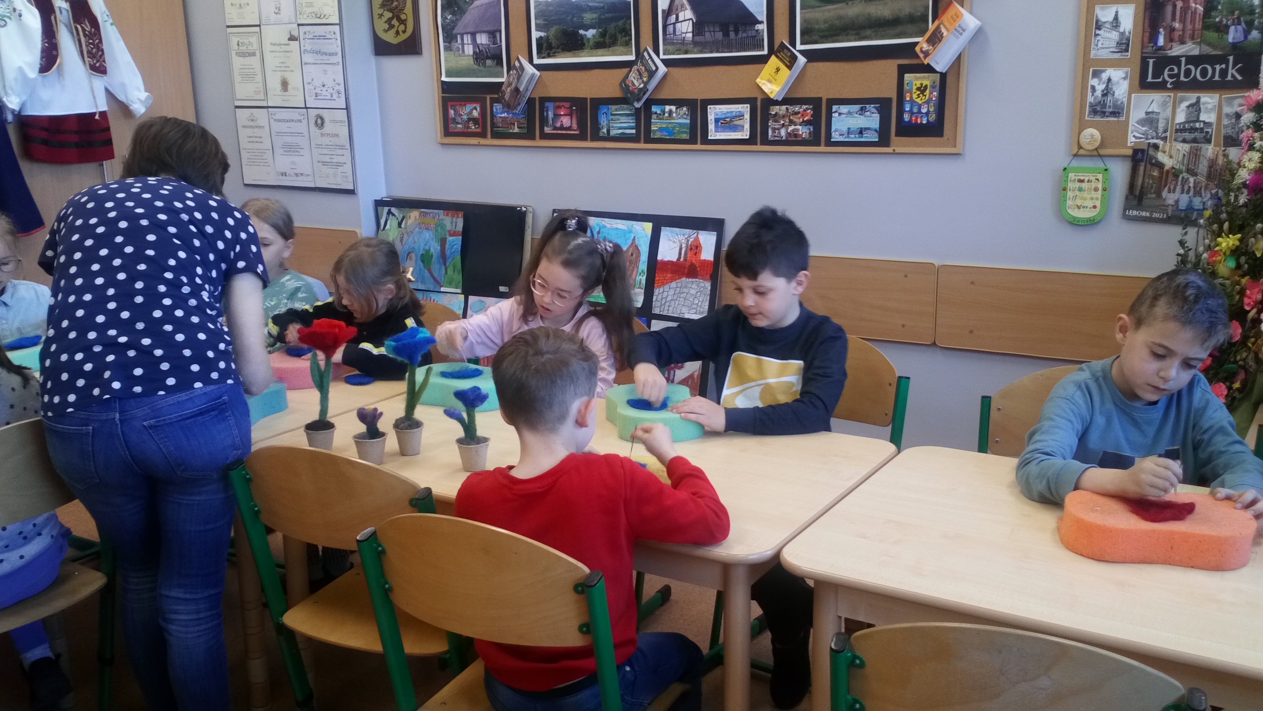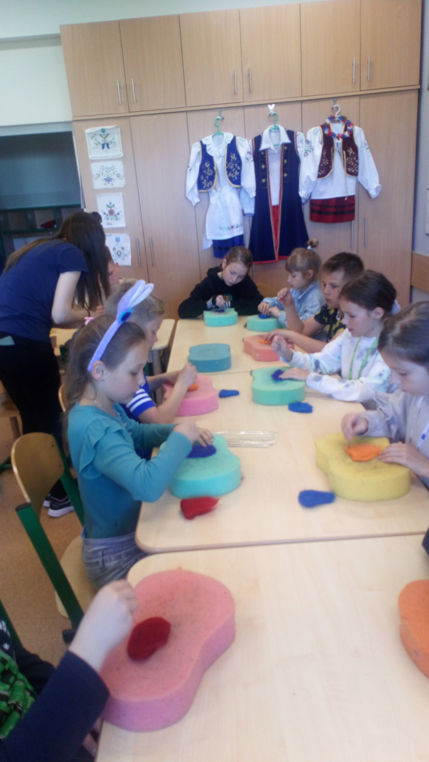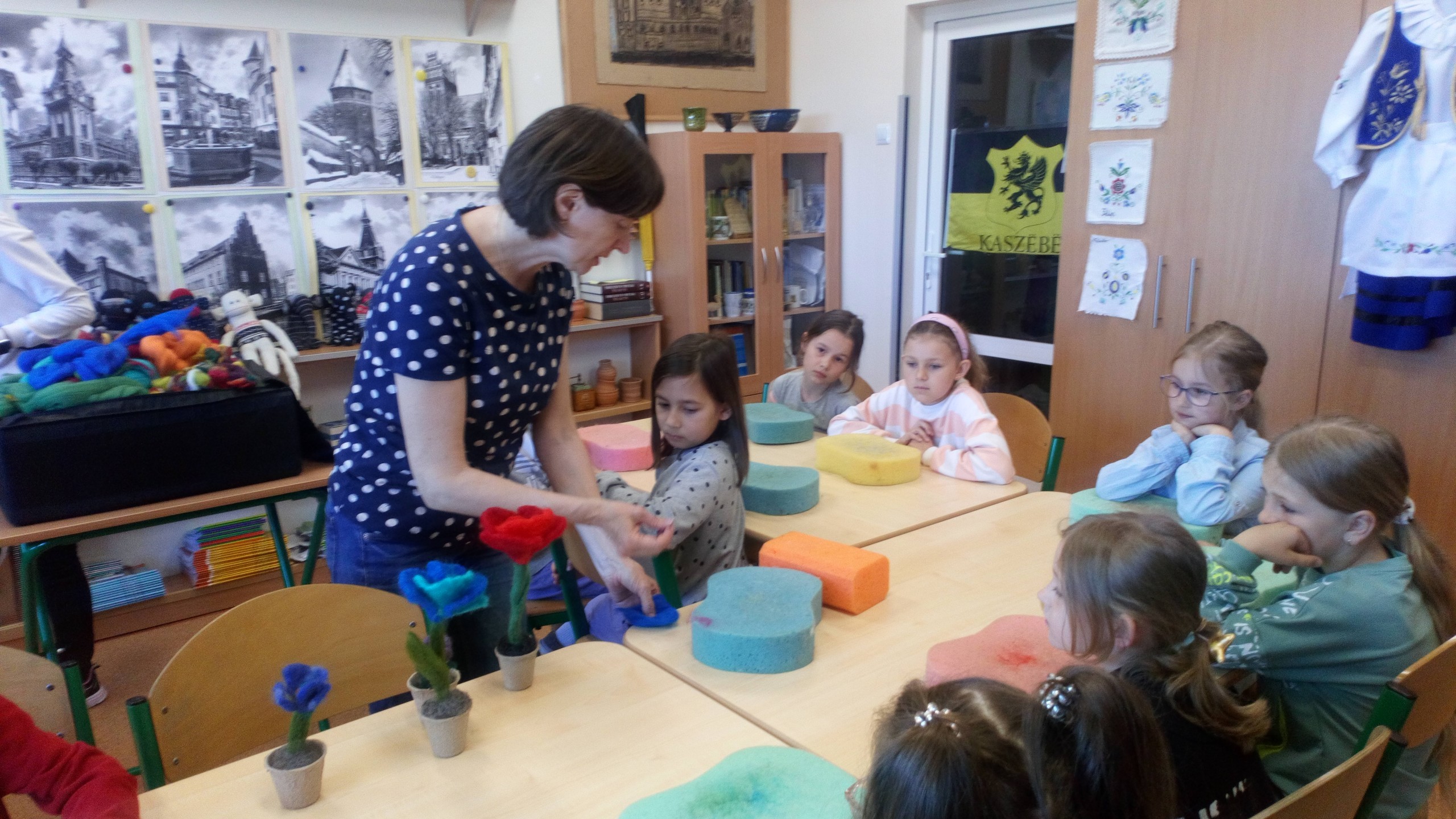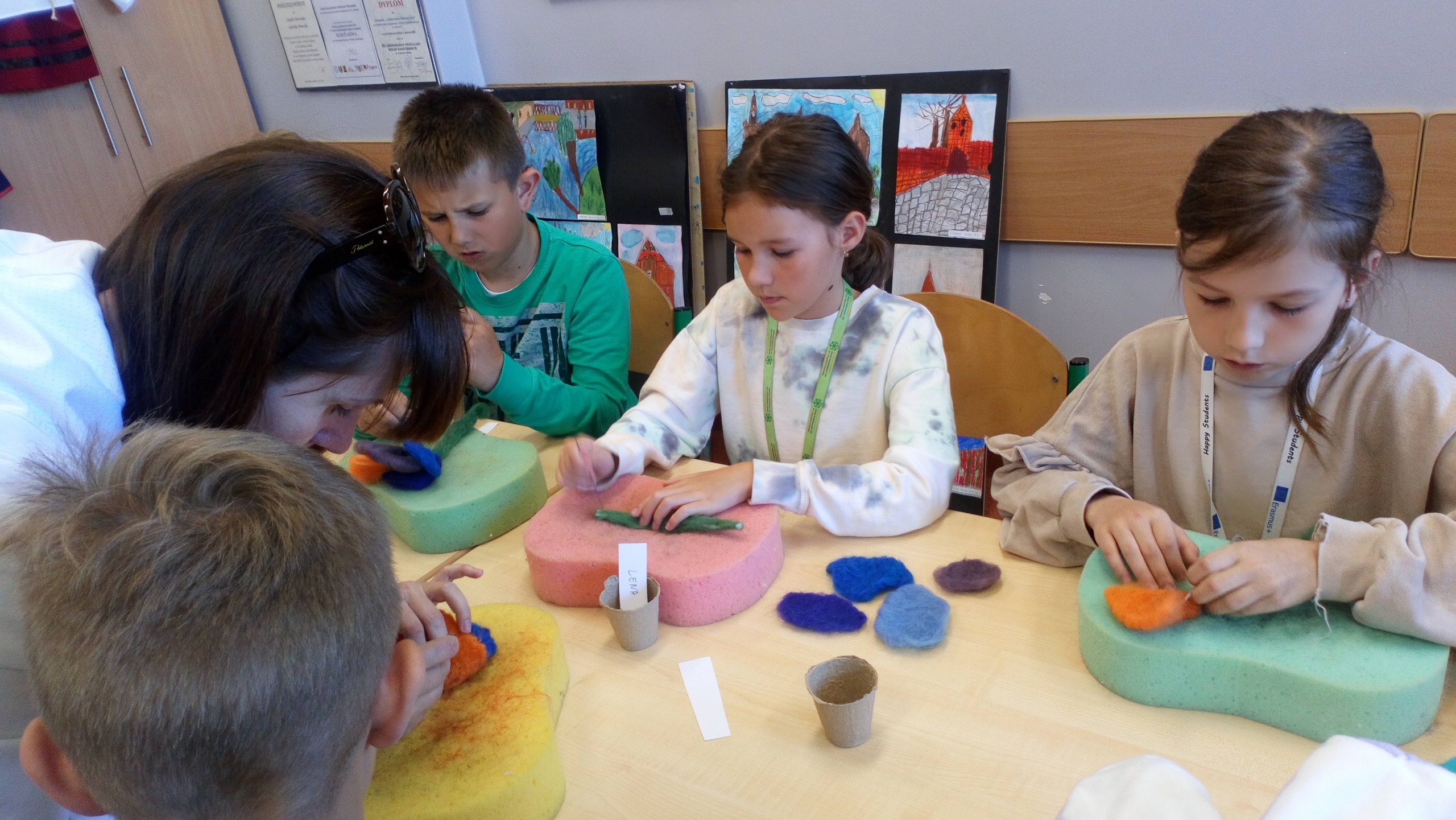 Uczniowie klas I – III , w ramach realizacji języka kaszubskiego, uczestniczyli w maju w warsztatach rękodzieła – filcowanie na sucho. Warsztaty poprowadziła p.Tatiana Słojka ze Słupska. Dzieci miały okazję wykonać kwiatki przestrzenne z filcu. Zajęcia bardzo się dzieciom podobały, a wytwory ich pracy były przepiękne.