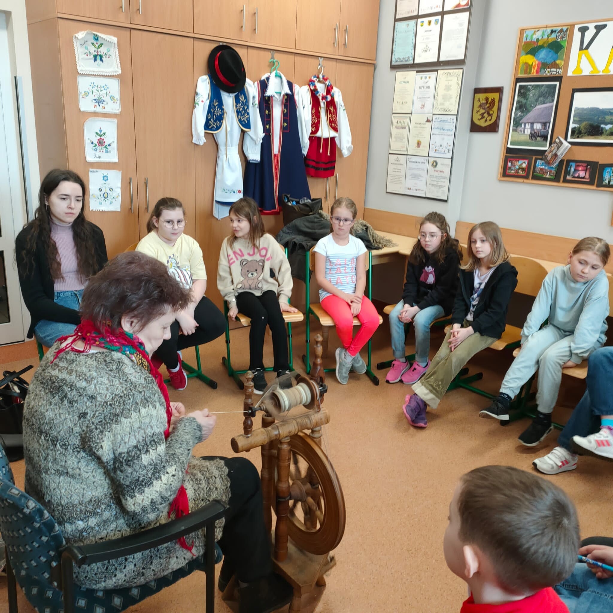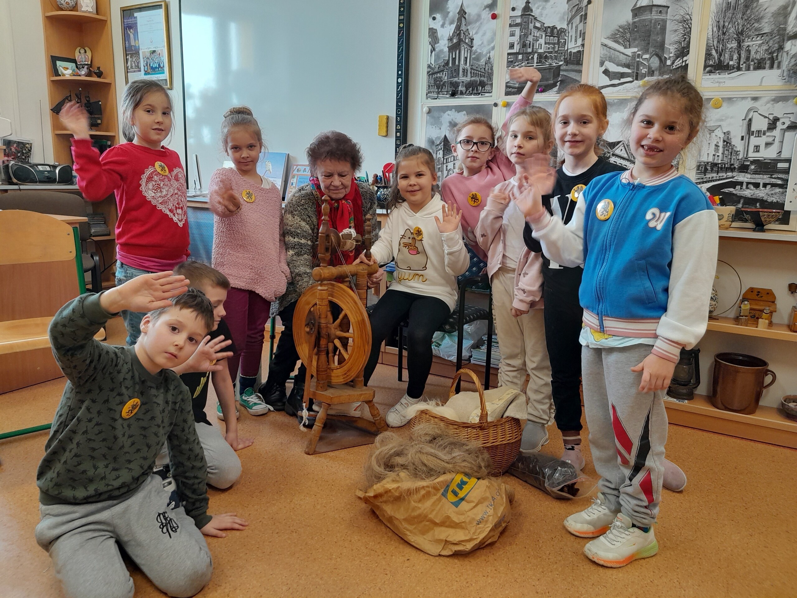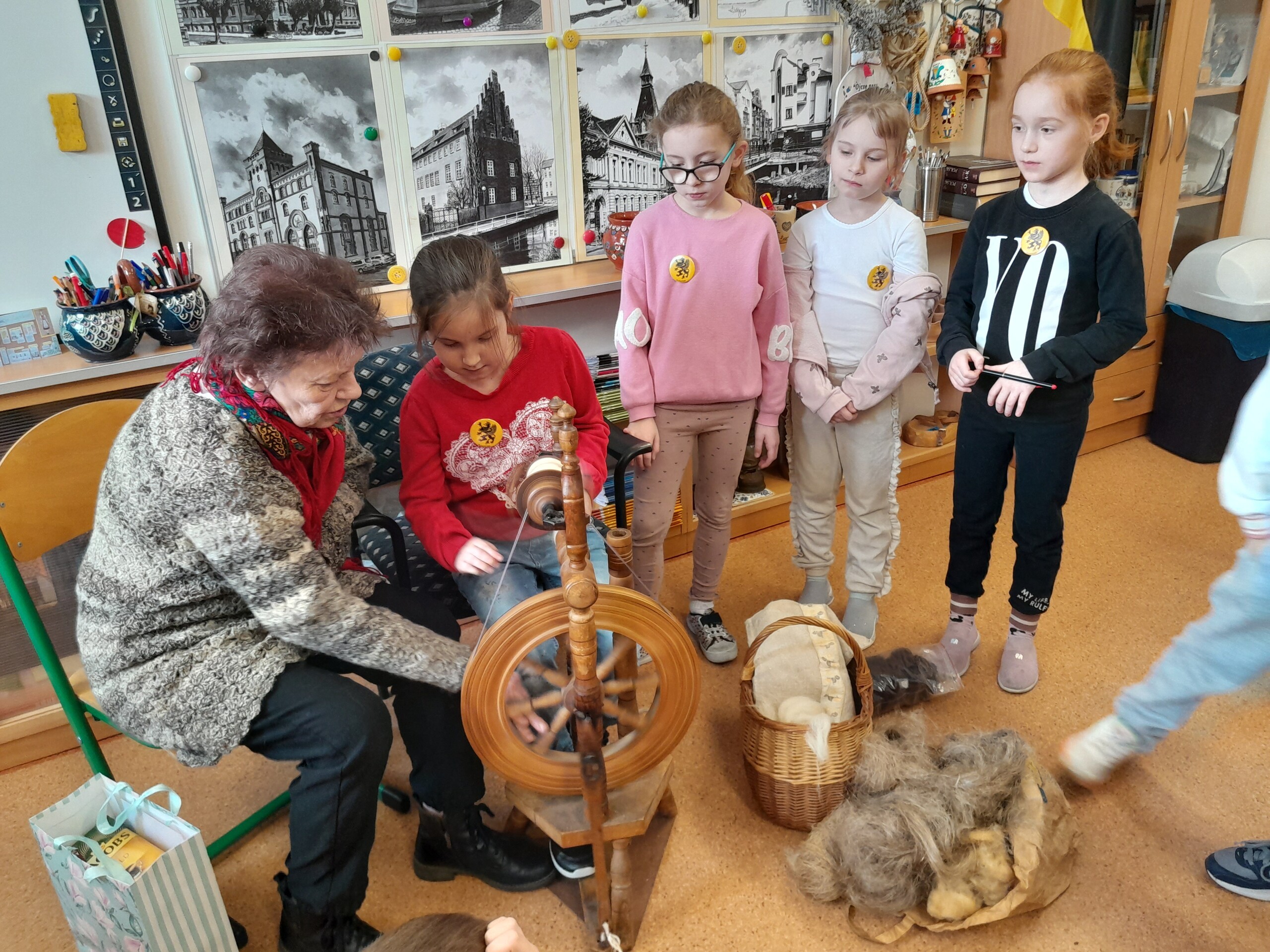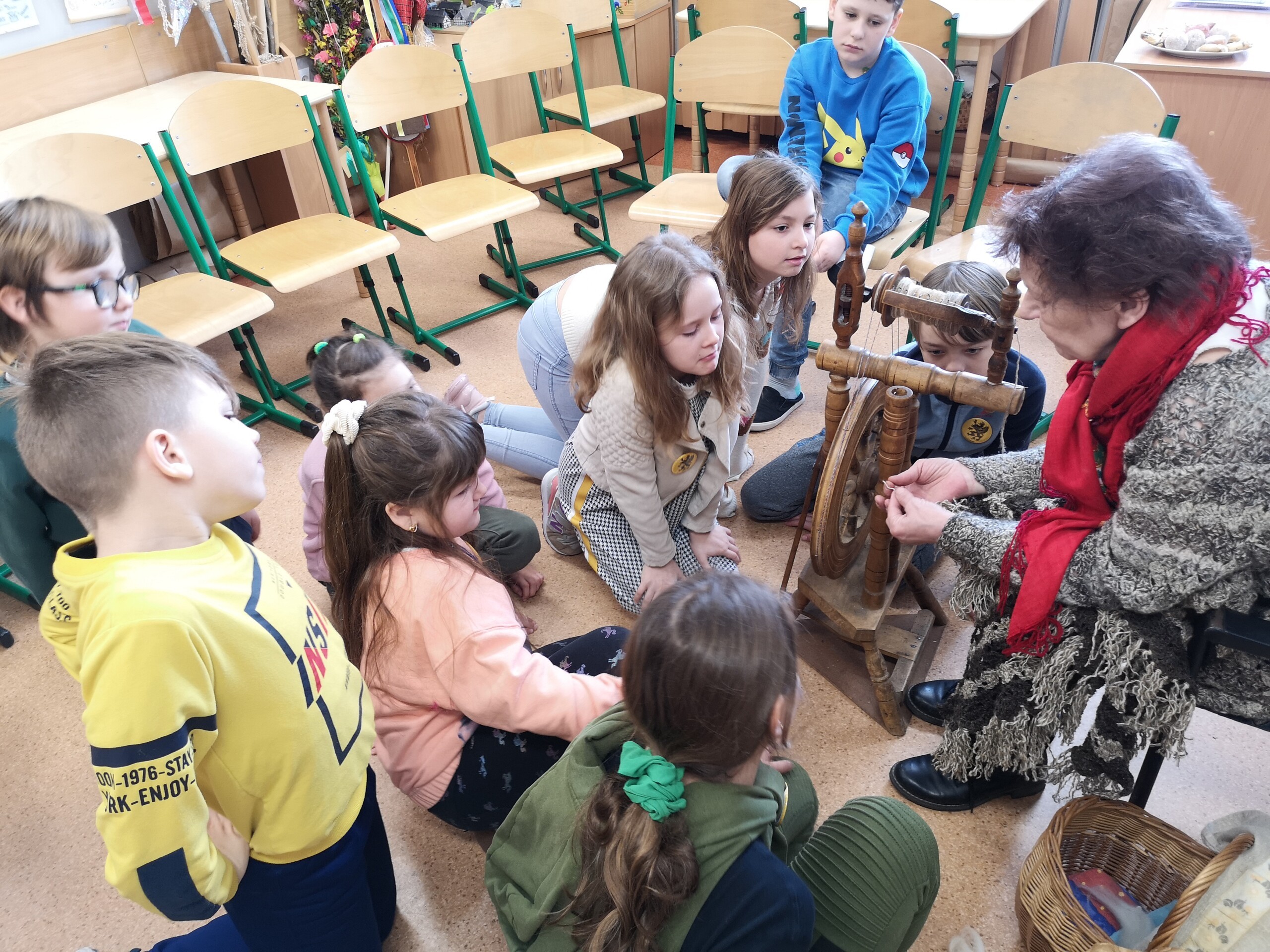 28 marca 2023 r. , w ramach zajęć języka kaszubskiego, w naszej szkole odbyły się warsztaty ręcznego przędzenia wełny na kołowrotku pt.: "Kręć się, kręć, wrzeciono..." dla dzieci z klas I - III. Uczniowie, pod czujnym okiem p.Bożeny Budzeń, prowadzącej warsztaty, mieli okazję usiąść do kołowrotka i spróbować nim pokręcić. Dzieciom bardzo spodobało się to "spotkanie z dawnym rzemiosłem" i, trzeba przyznać, że w większości poszło im znakomicie. W imieniu uczniów i nauczyciela języka kaszubskiego składamy podziękowanie p.Bożenie Budzeń za podzielenie się swoją pasją, wiedzą i doświadczeniem.