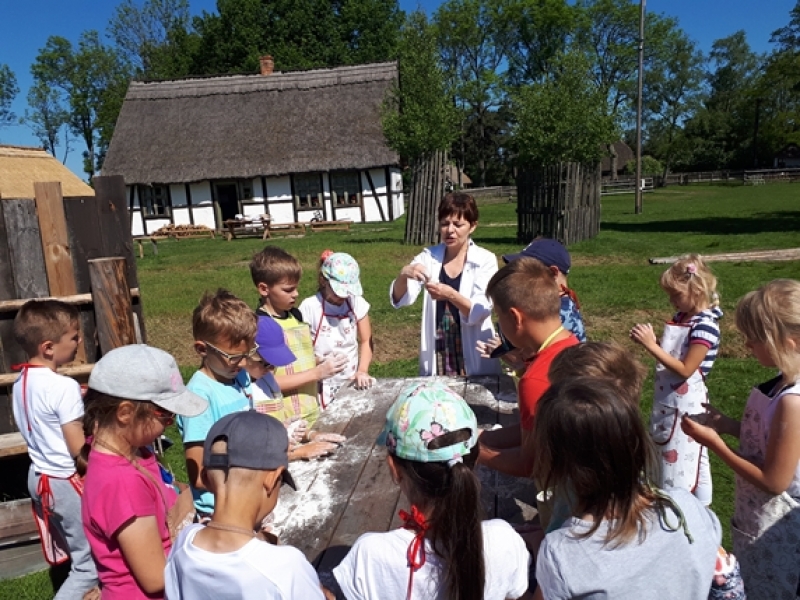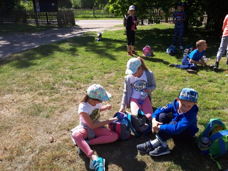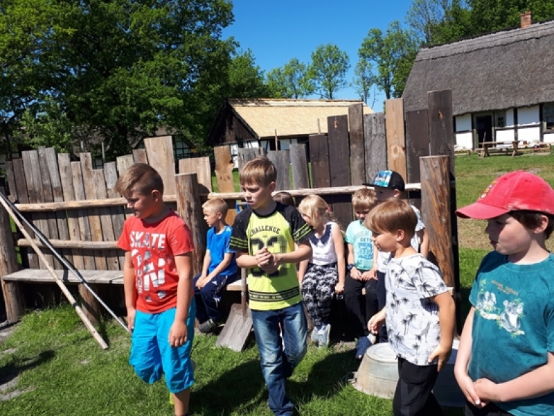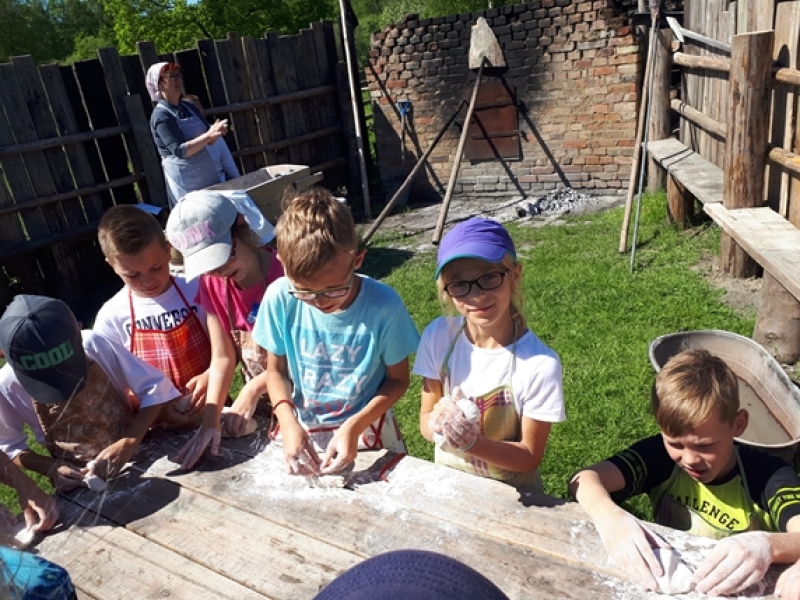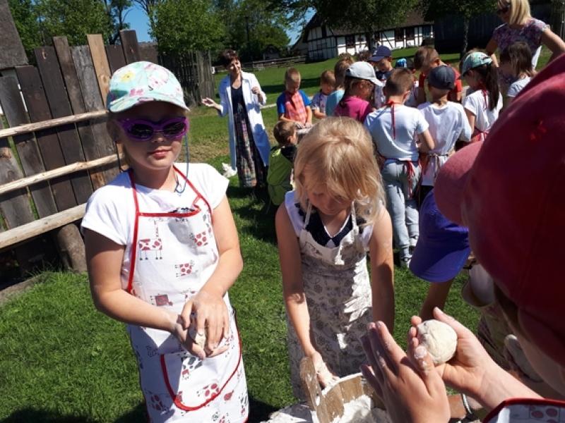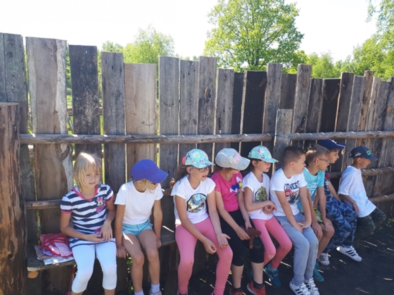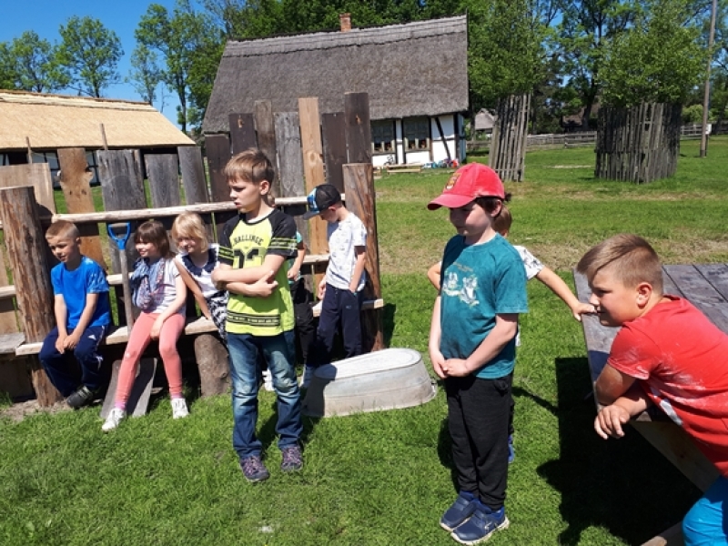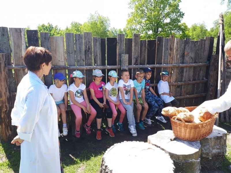 W czwartkowy poranek, 24 maja, uczniowie klas pierwszych wybrali się na wycieczkę kaszubską do Muzeum Wsi Słowińskiej w Klukach. Dzieci miały okazję upiec własny bochenek chleba, śledząc w praktyczny sposób drogę jego powstania od ziarenka do bochenka. Z zaciekawieniem obserwowały one, jak przygotowuje się piec chlebowy do tradycyjnego wypieku, a potem z wielkim apetytem zajadały się kromkami upieczonego, świeżutkiego, pachnącego chleba z masełkiem i dżemem. Pani przewodnik, zapoznając dzieci z zasobami Skansenu, oprowadzała je po chałupach, zagrodach i obiektach wolno stojących, w ciekawy sposób udzielając informacji o wiejskich zajęciach domowych i gospodarskich oraz przedmiotach związanych z tymi zajęciami. Pogoda była doskonała, słoneczko ogrzewało nas swoimi promykami i dawało nam energii do wspaniałej zabawy.