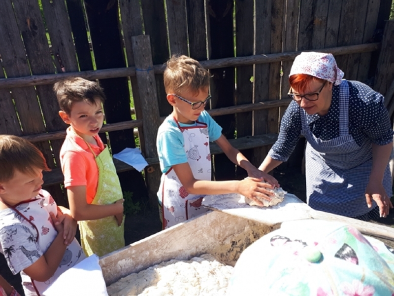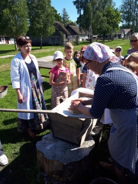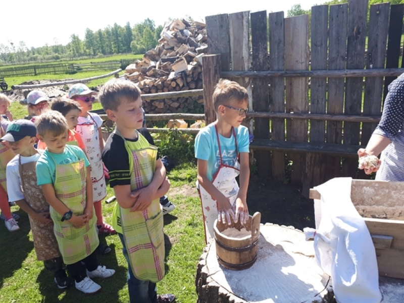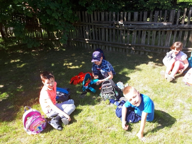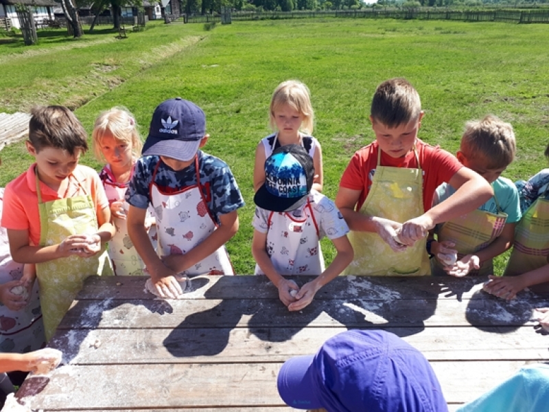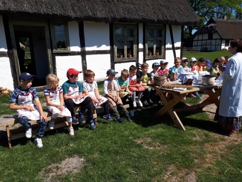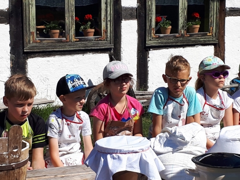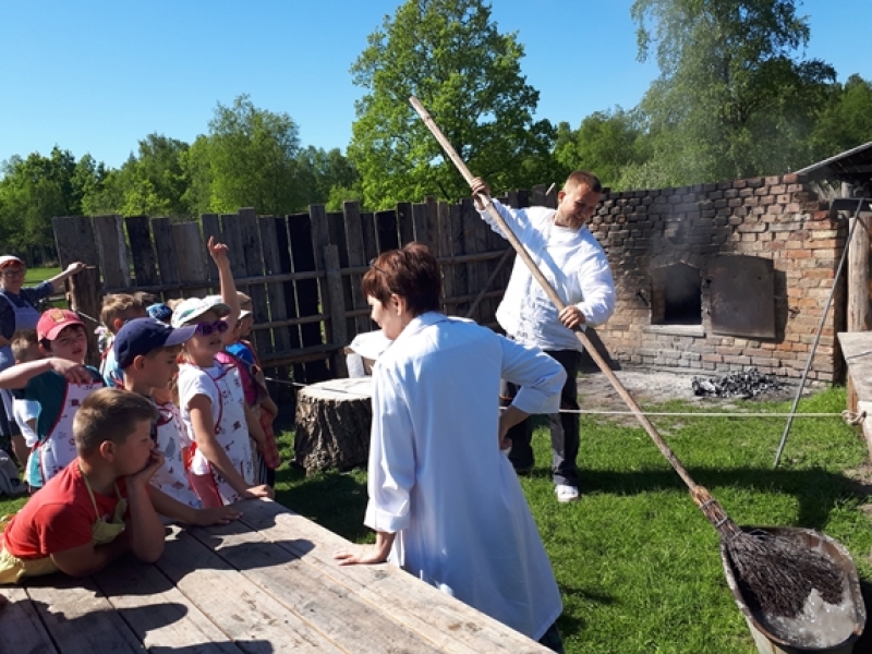 W czwartkowy poranek, 24 maja, uczniowie klas pierwszych wybrali się na wycieczkę kaszubską do Muzeum Wsi Słowińskiej w Klukach. Dzieci miały okazję upiec własny bochenek chleba, śledząc w praktyczny sposób drogę jego powstania od ziarenka do bochenka. Z zaciekawieniem obserwowały one, jak przygotowuje się piec chlebowy do tradycyjnego wypieku, a potem z wielkim apetytem zajadały się kromkami upieczonego, świeżutkiego, pachnącego chleba z masełkiem i dżemem. Pani przewodnik, zapoznając dzieci z zasobami Skansenu, oprowadzała je po chałupach, zagrodach i obiektach wolno stojących, w ciekawy sposób udzielając informacji o wiejskich zajęciach domowych i gospodarskich oraz przedmiotach związanych z tymi zajęciami. Pogoda była doskonała, słoneczko ogrzewało nas swoimi promykami i dawało nam energii do wspaniałej zabawy.