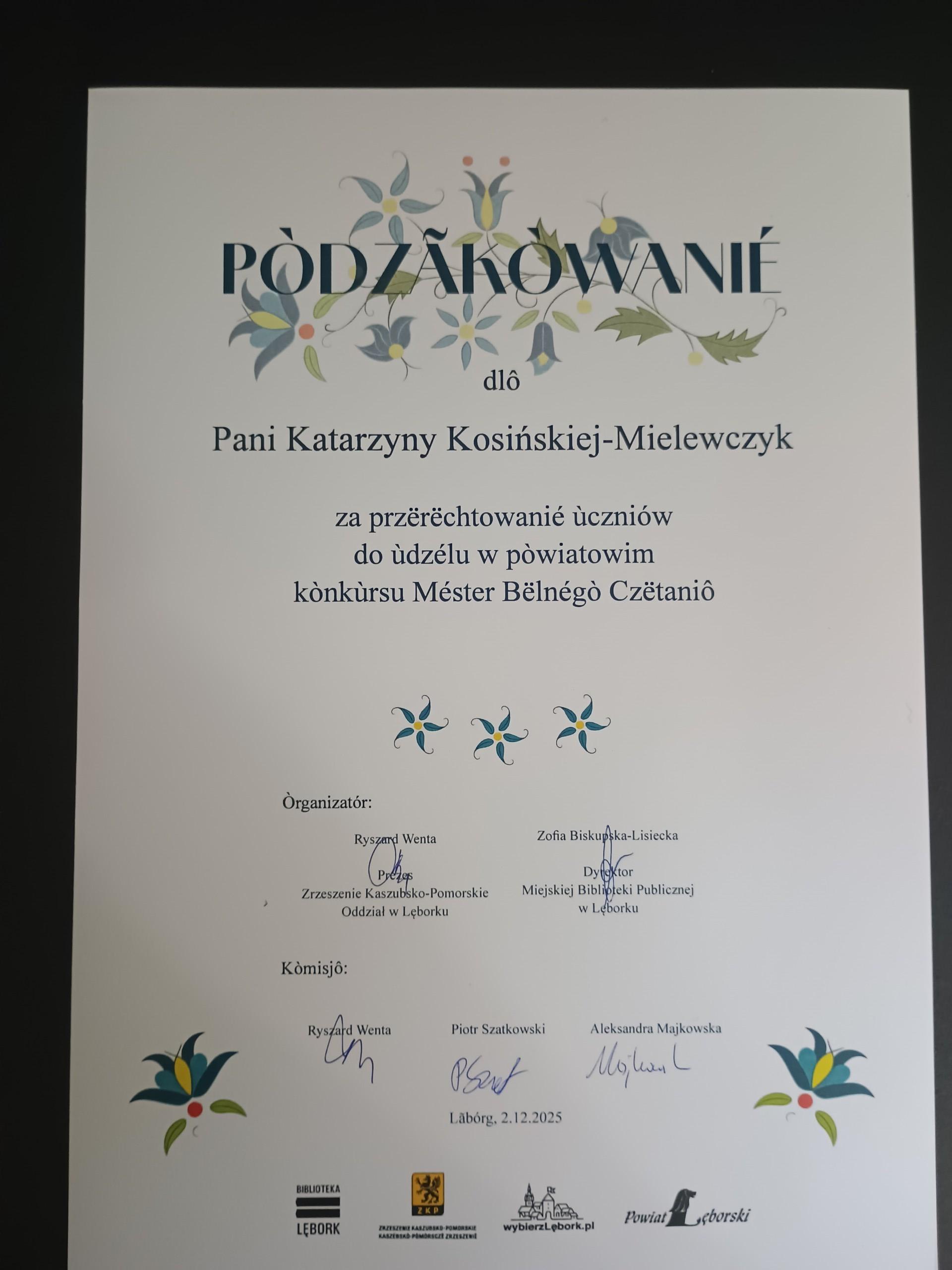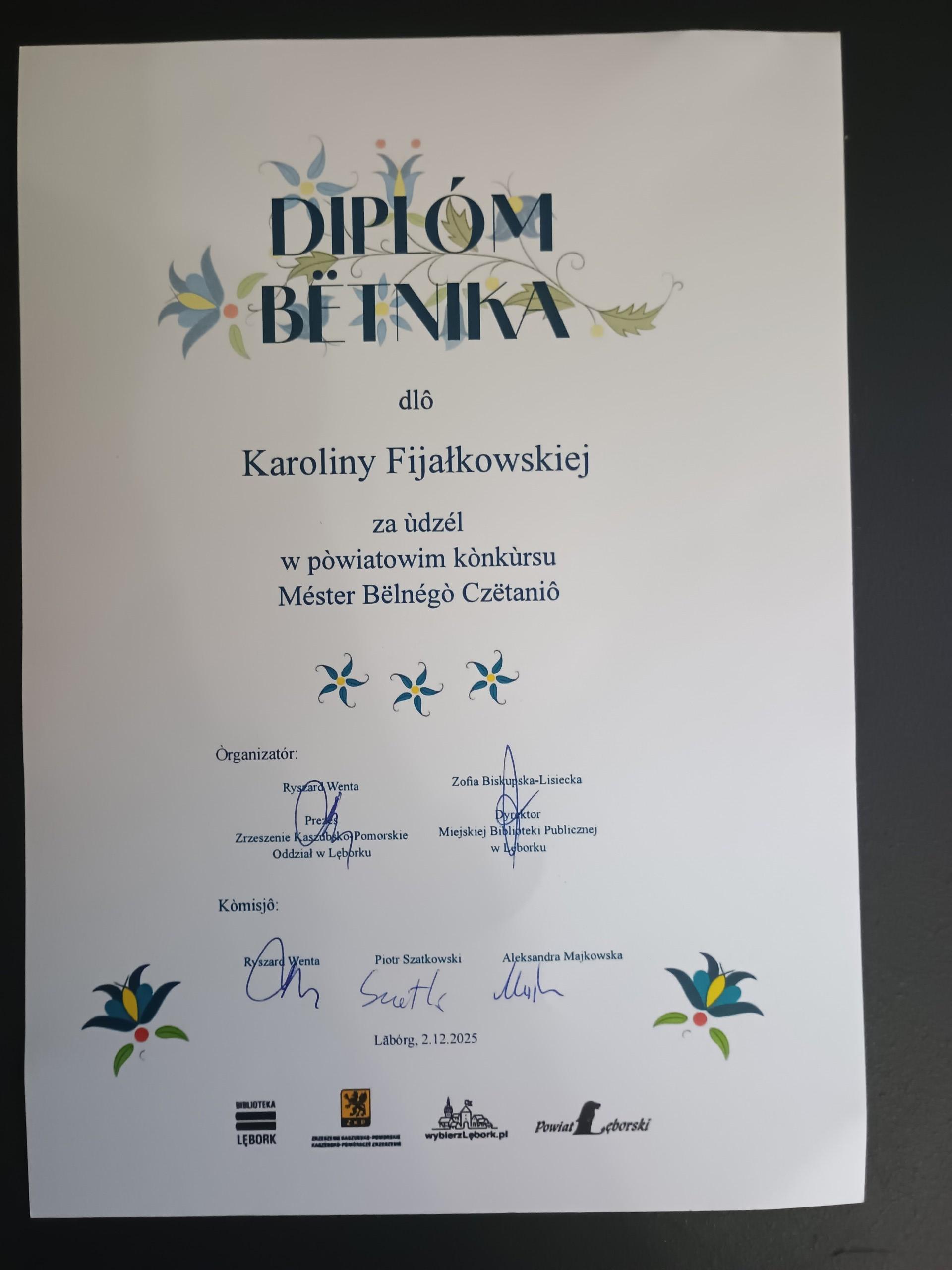 2 grudnia 2025 r. uczennice naszej Szkoły uczęszczające na lekcje języka kaszubskiego wzięły udział w Powiatowych Eliminacjach do XII Regionalnego Konkursu MÉSTER BËLNÉGÒ CZËTANIÔ PÒ KASZËBSKÙ.
