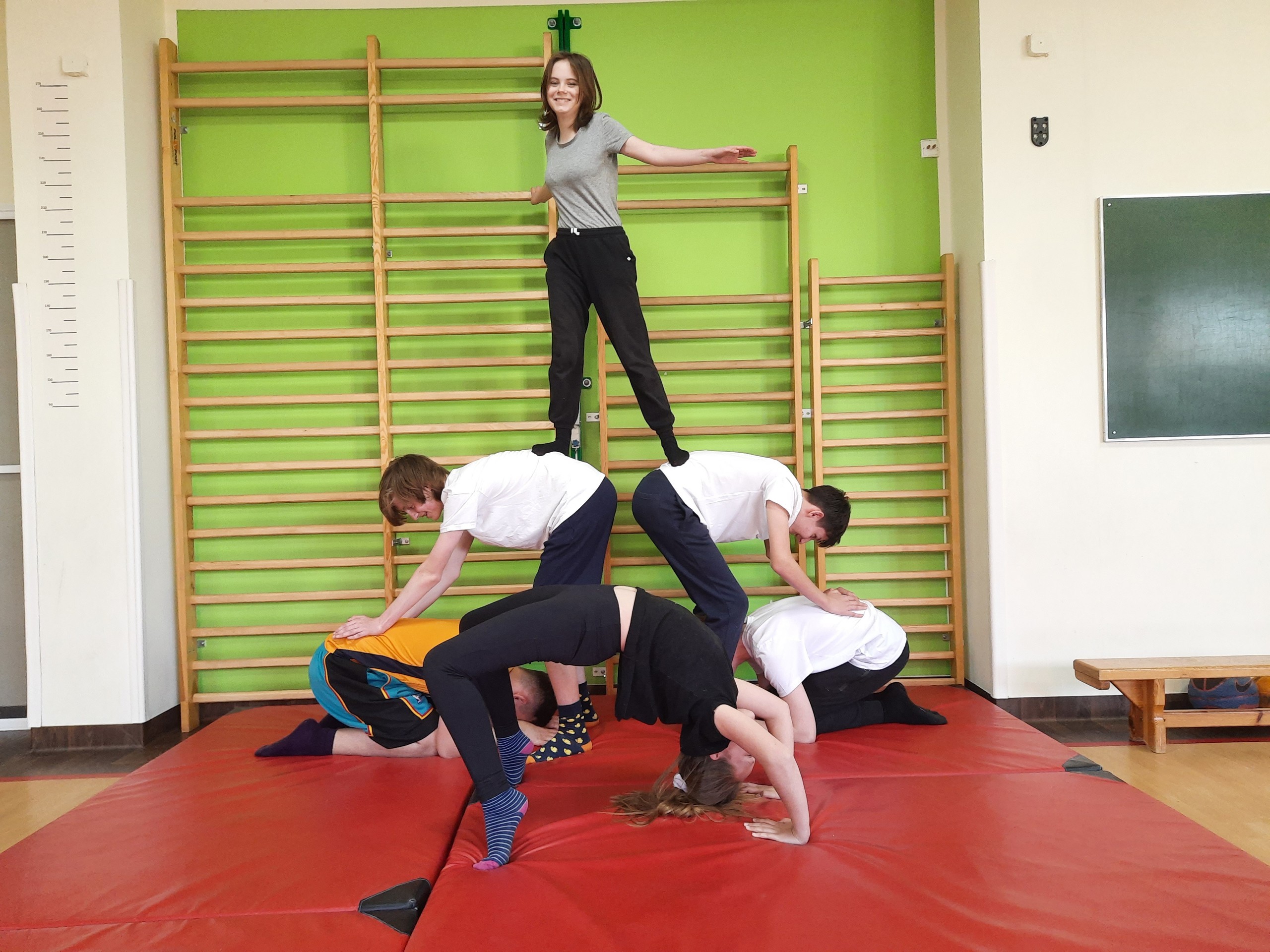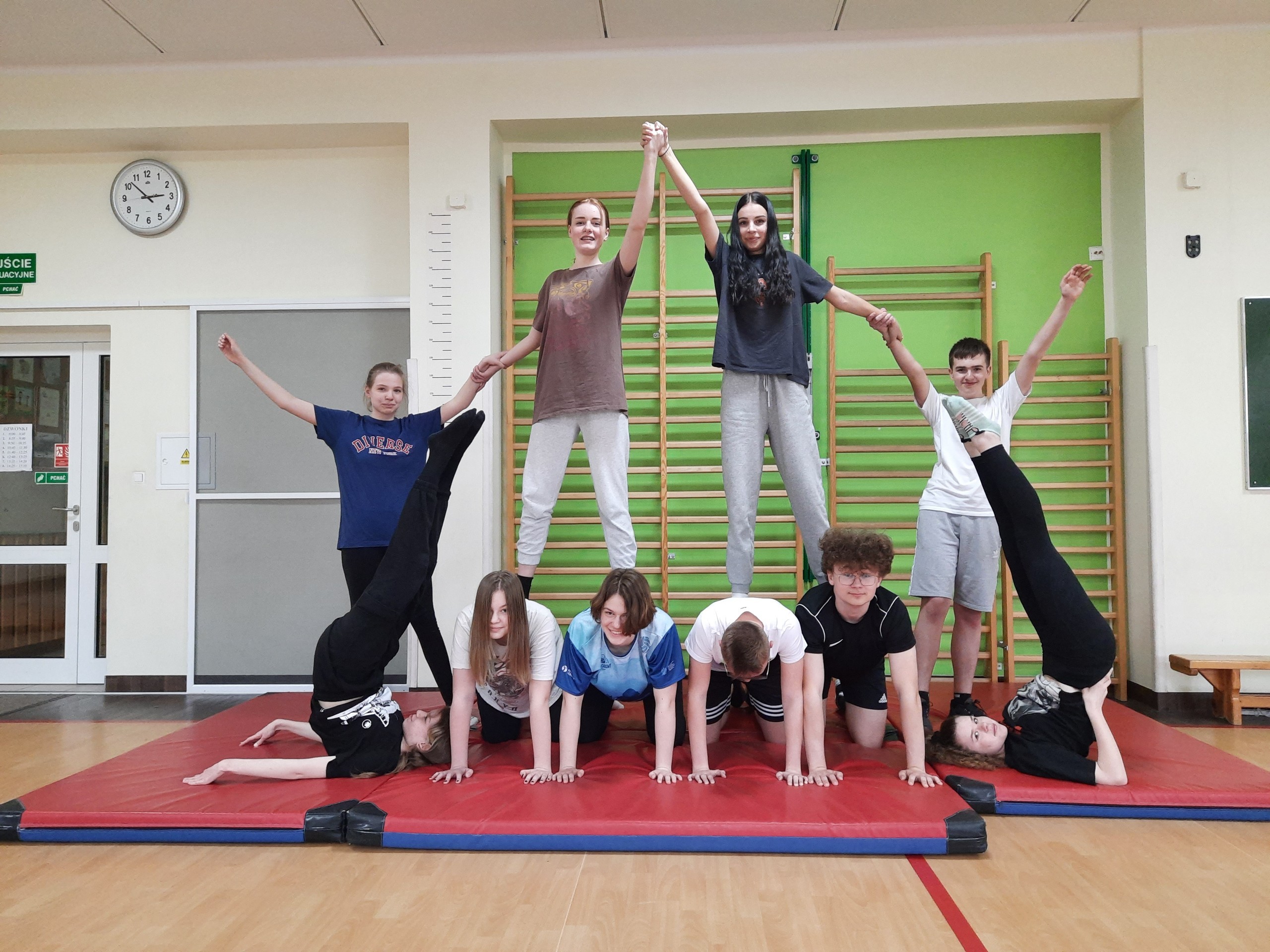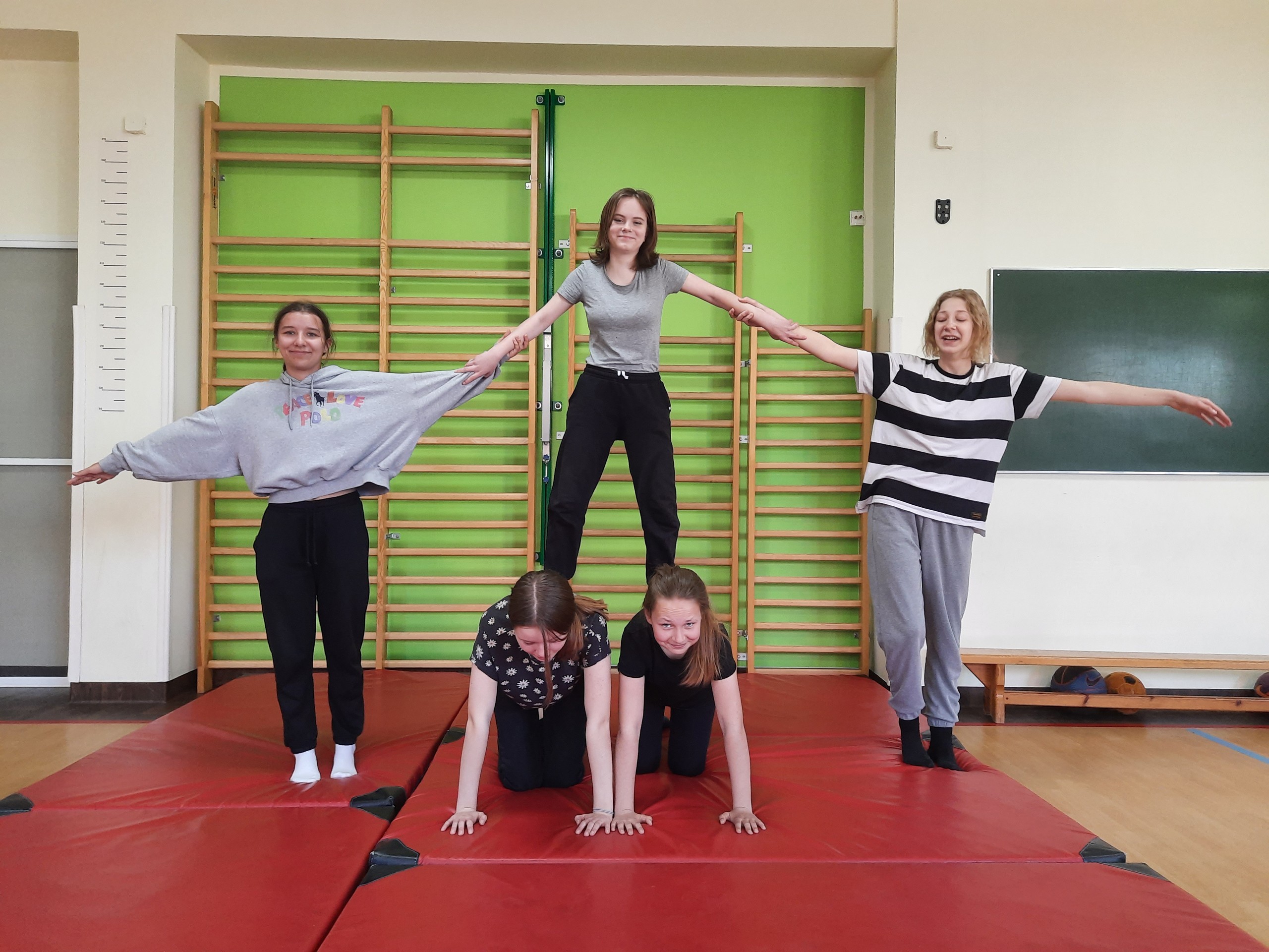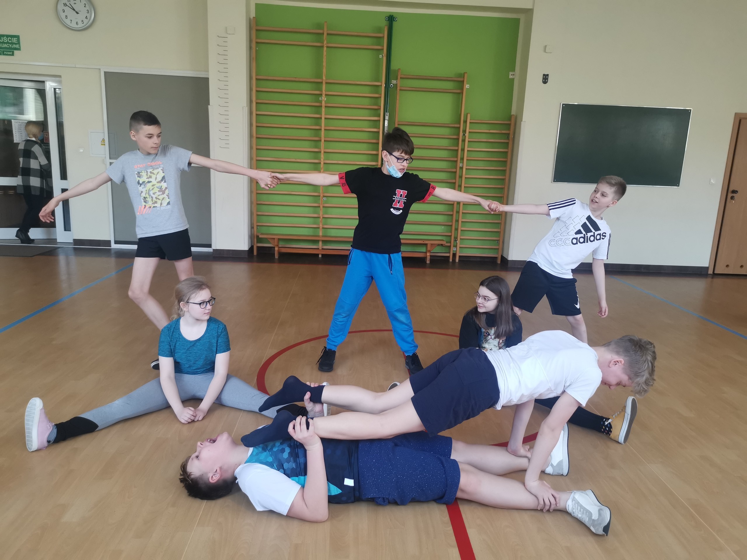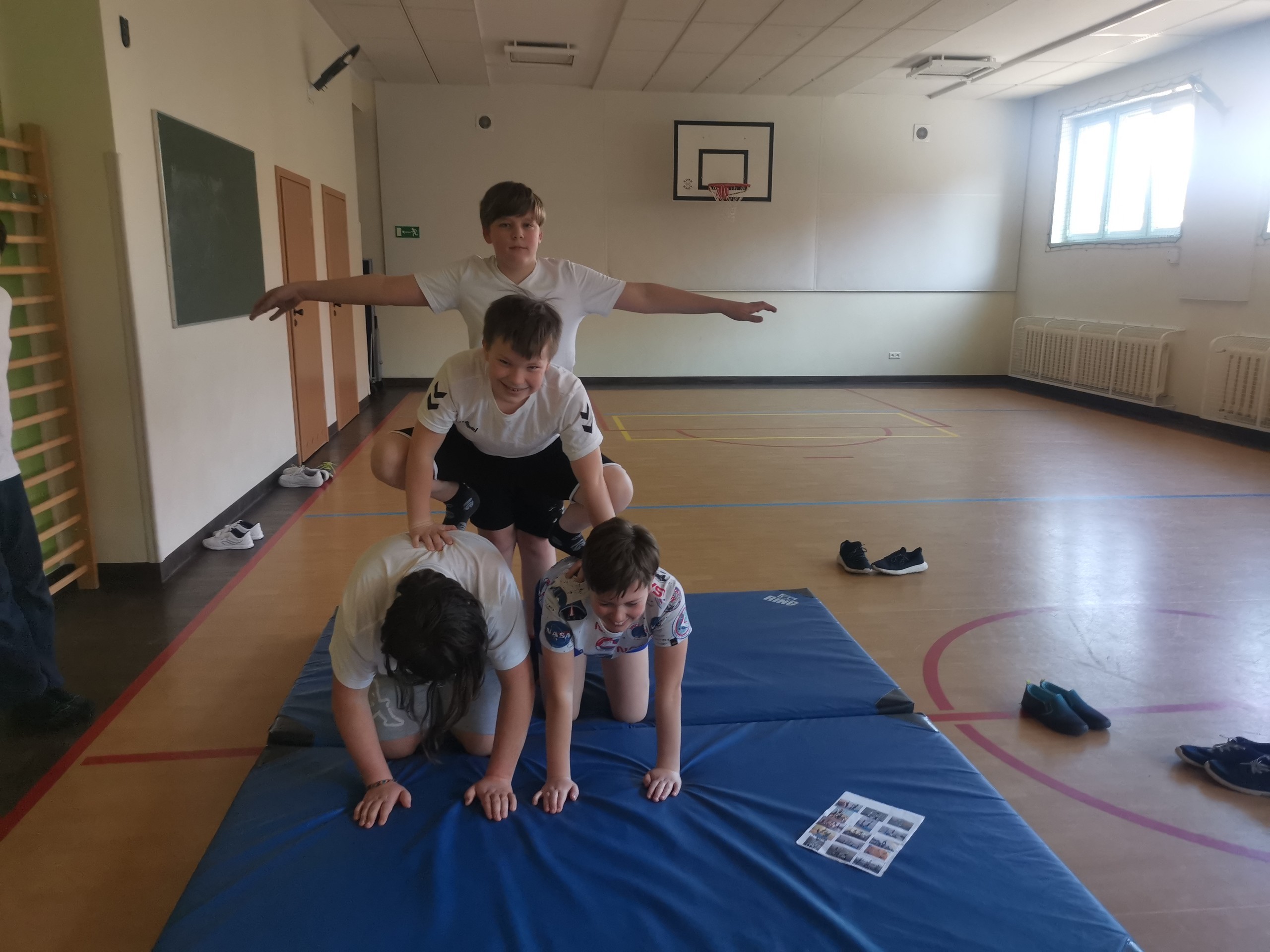 Na lekcjach wychowania fizycznego uczniowie klas 4 - 8 tworzyli różne piramidy gimnastyczne, te prostsze dwu i trzyosobowe, a także próbowali swoich sił w trudniejszych układach – piramidach wieloosobowych. Podczas takich zajęć trzeba wykazać się pomysłowością, aktywnością i kreatywnością. Działając w grupie uczniowie uczą się współpracować, polegać na sobie, wzajemnie się asekurować i wspierać, aby stworzyć wspaniały gimnastyczny pokaz. Jednocześnie  lekcje przynoszą wszystkim mnóstwo dobrej zabawy i śmiechu.