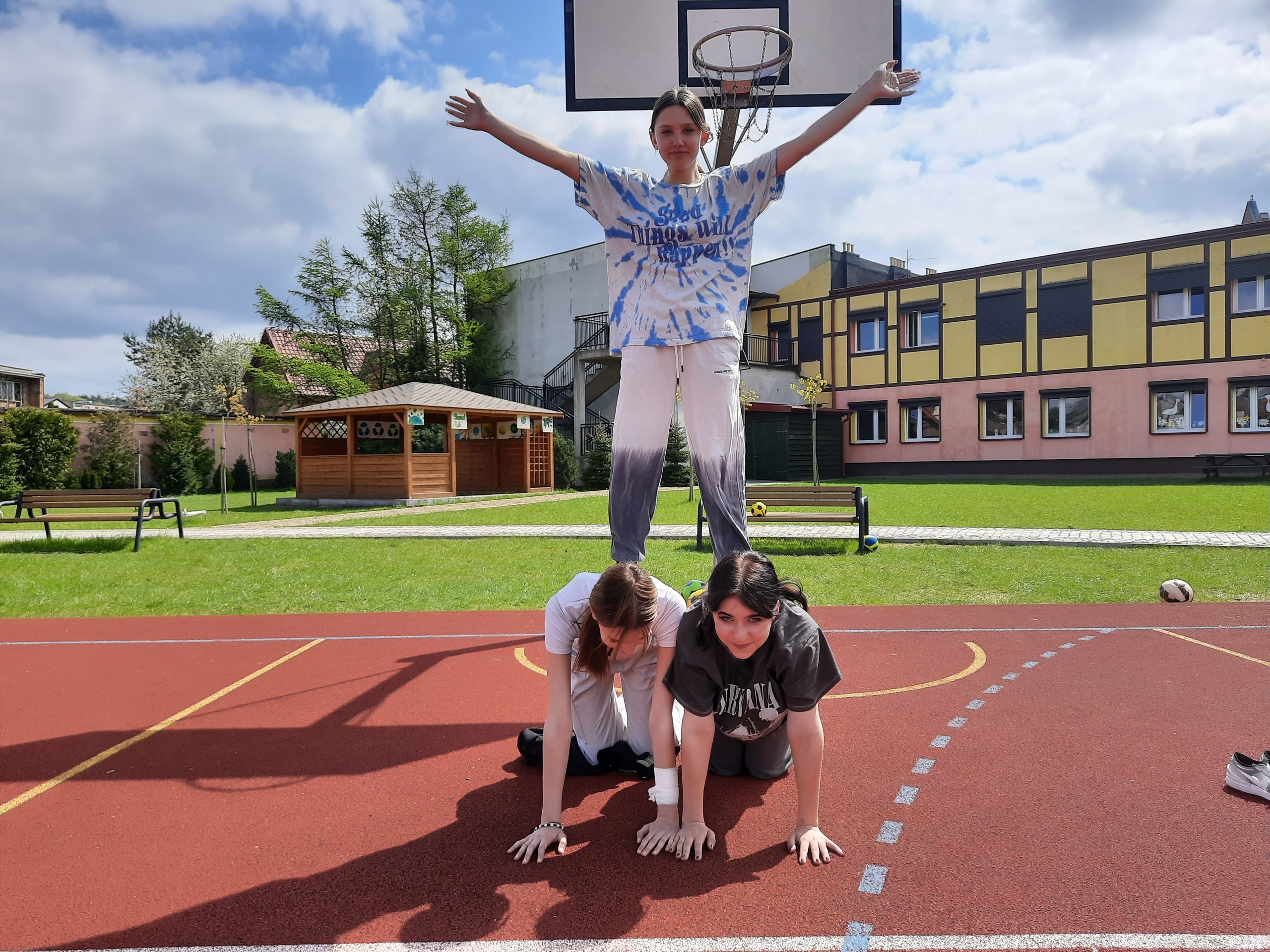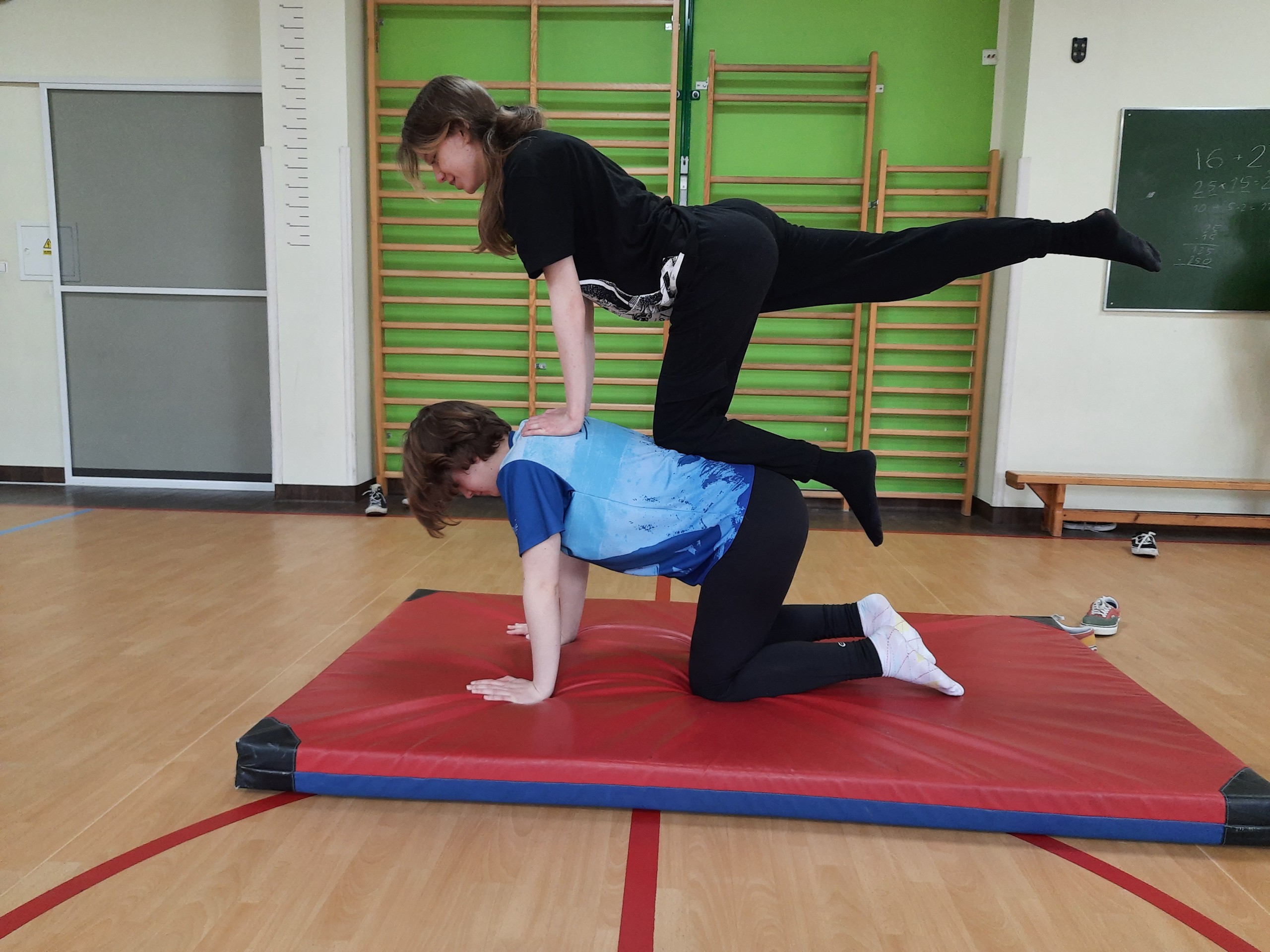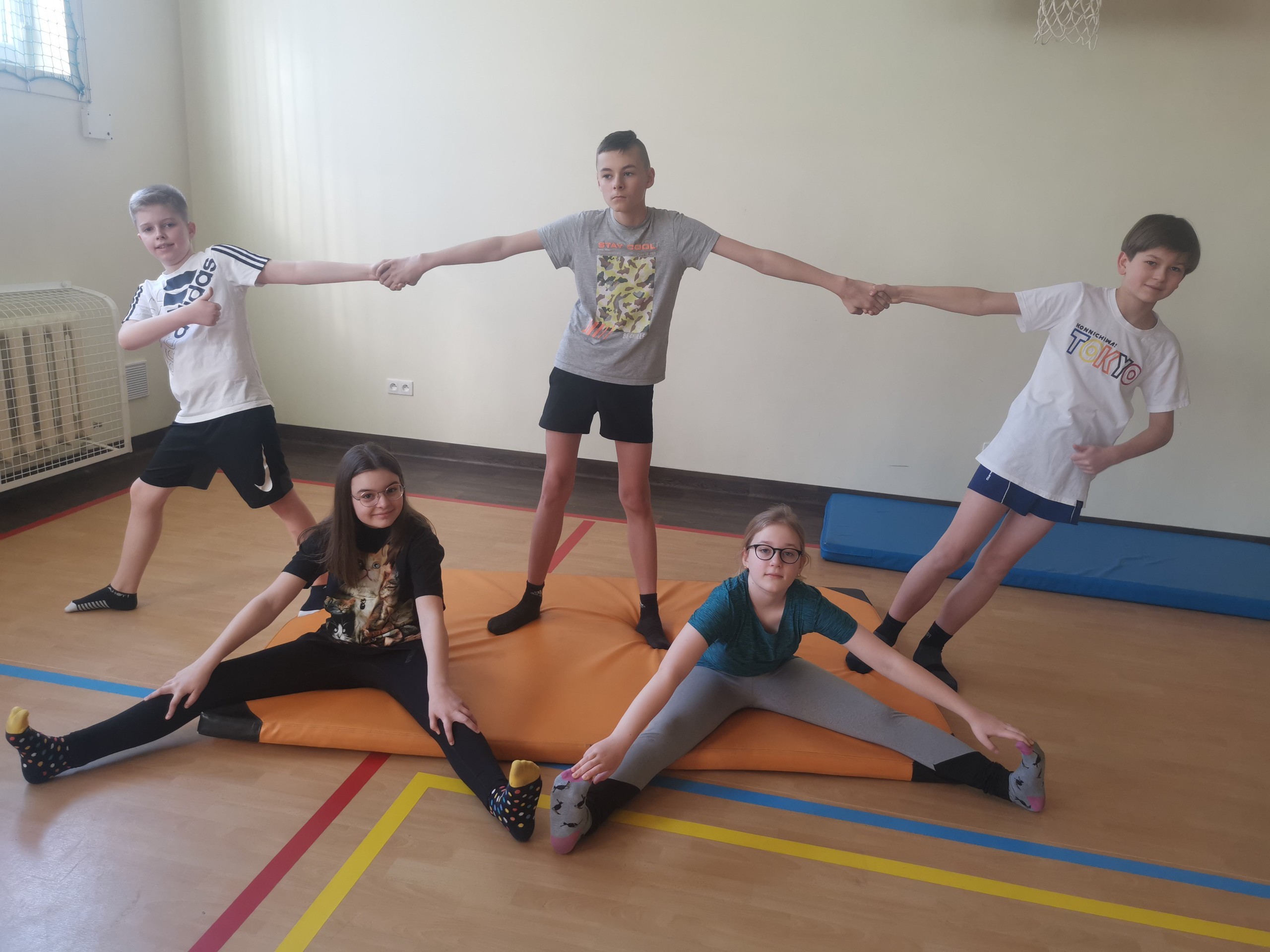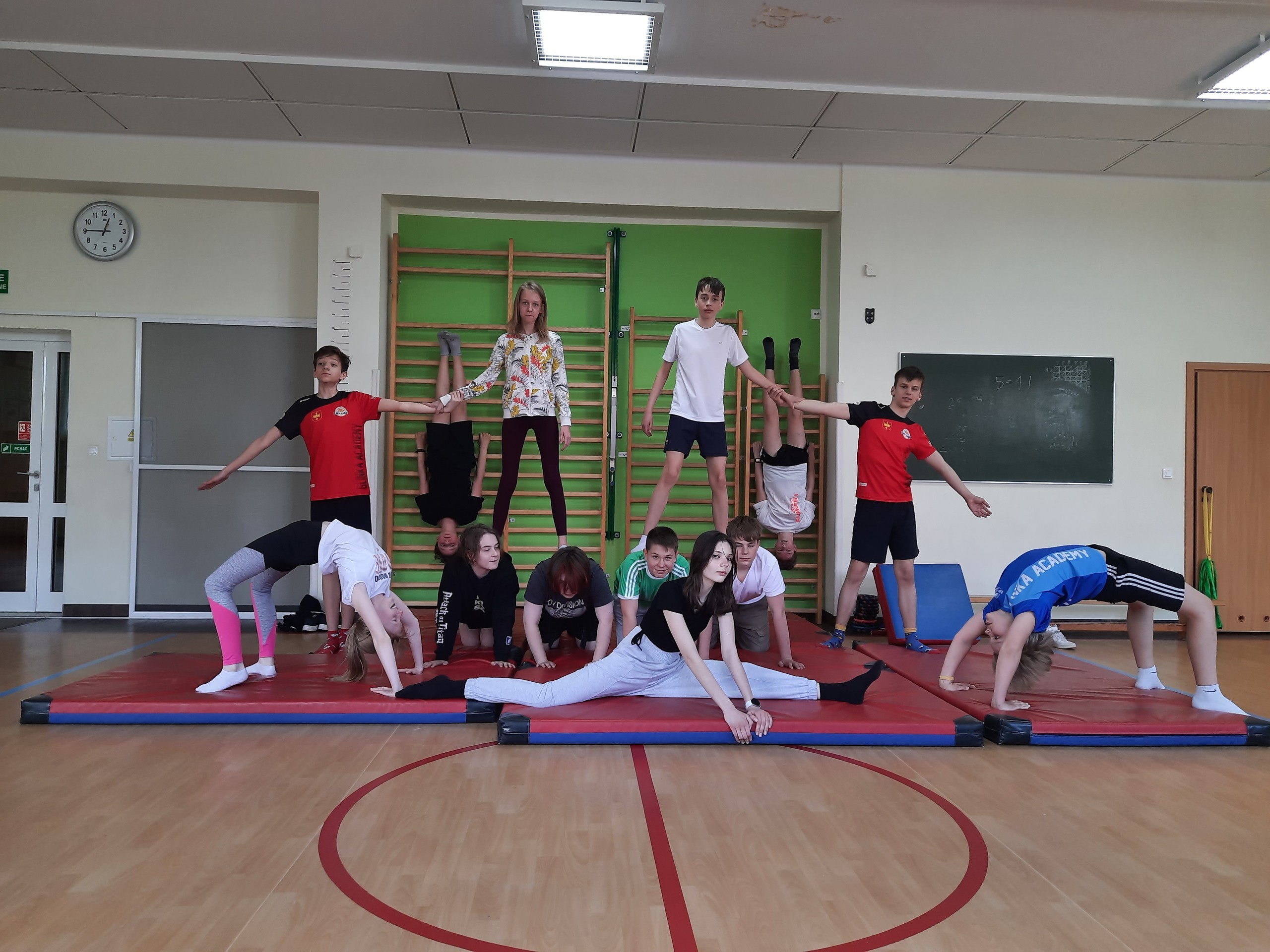Na lekcjach wychowania fizycznego uczniowie klas 4 - 8 tworzyli różne piramidy gimnastyczne, te prostsze dwu i trzyosobowe, a także próbowali swoich sił w trudniejszych układach – piramidach wieloosobowych. Podczas takich zajęć trzeba wykazać się pomysłowością, aktywnością i kreatywnością. Działając w grupie uczniowie uczą się współpracować, polegać na sobie, wzajemnie się asekurować i wspierać, aby stworzyć wspaniały gimnastyczny pokaz. Jednocześnie  lekcje przynoszą wszystkim mnóstwo dobrej zabawy i śmiechu.