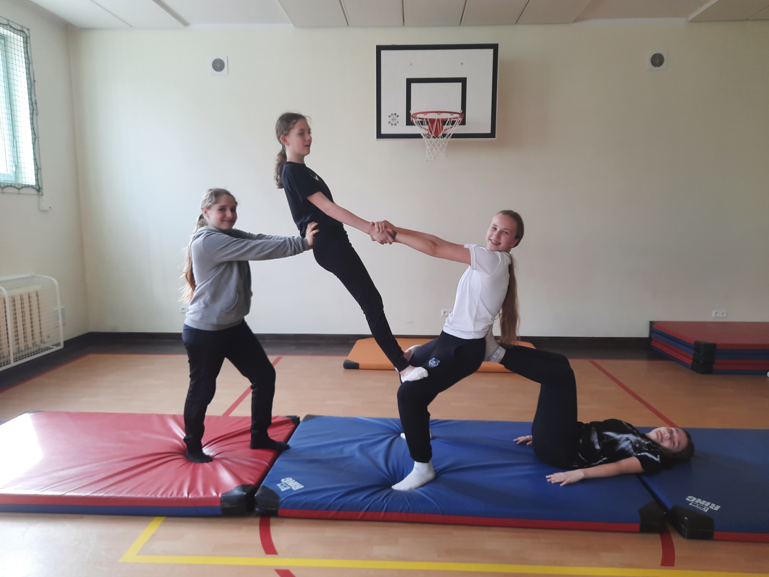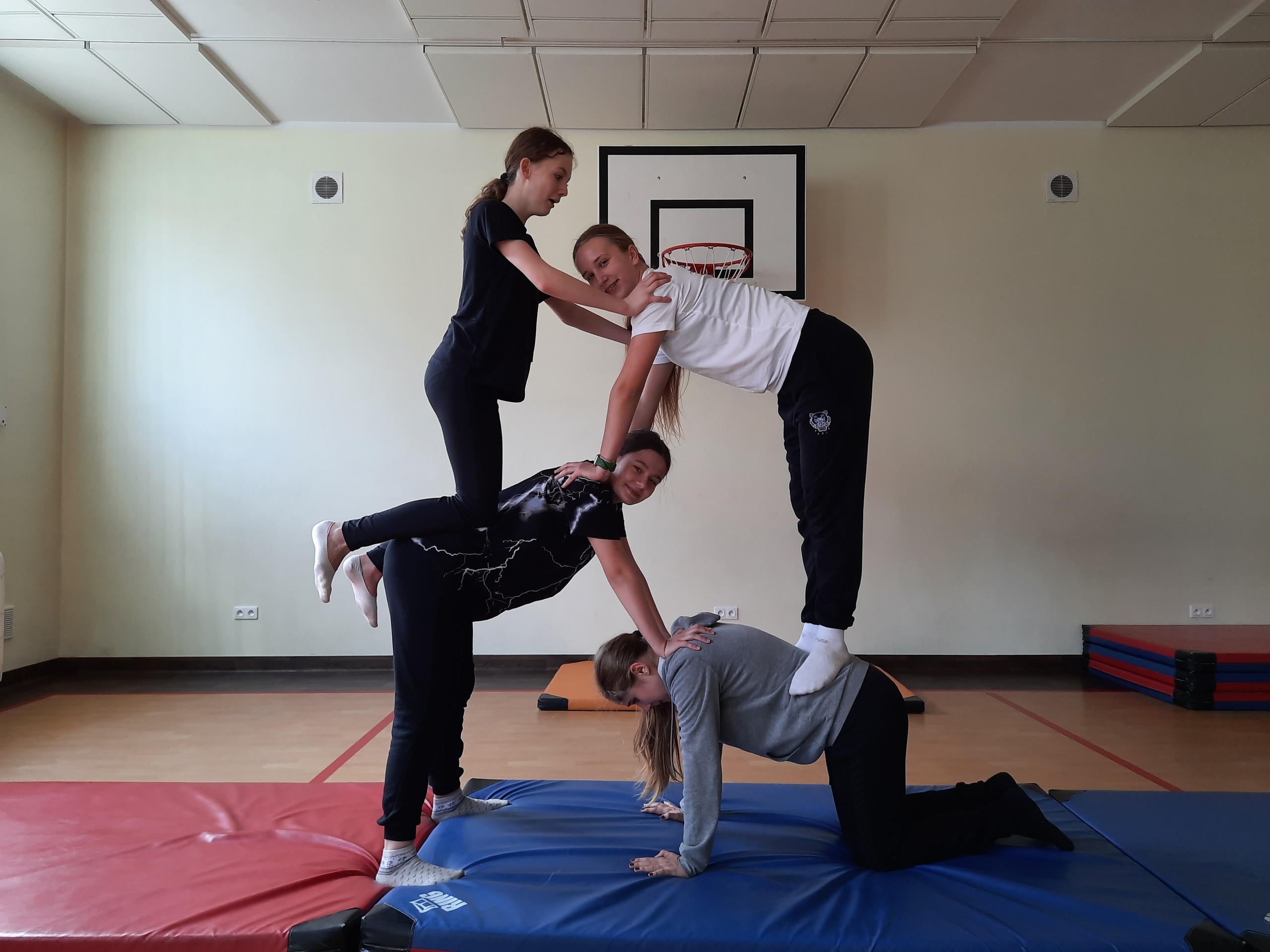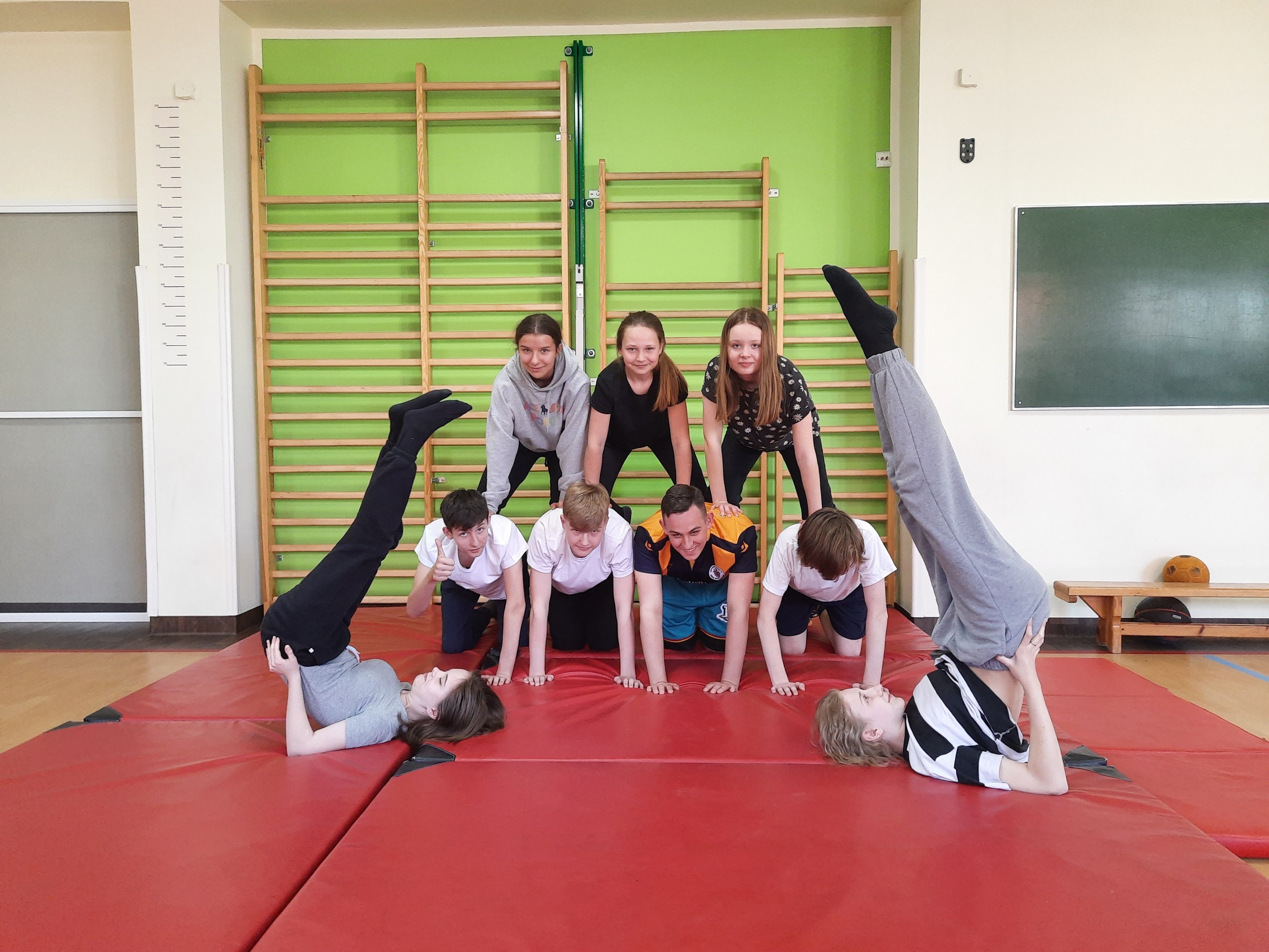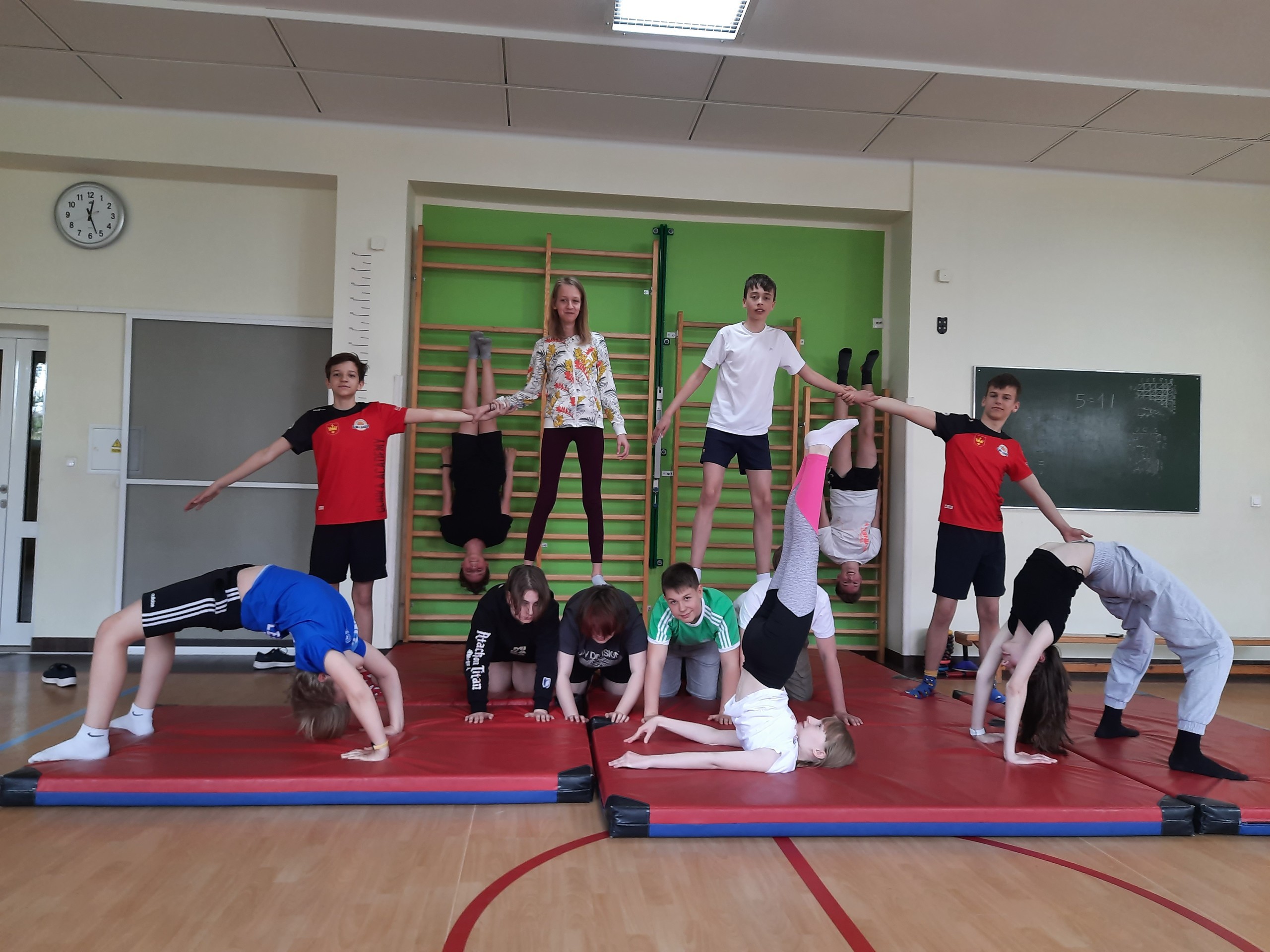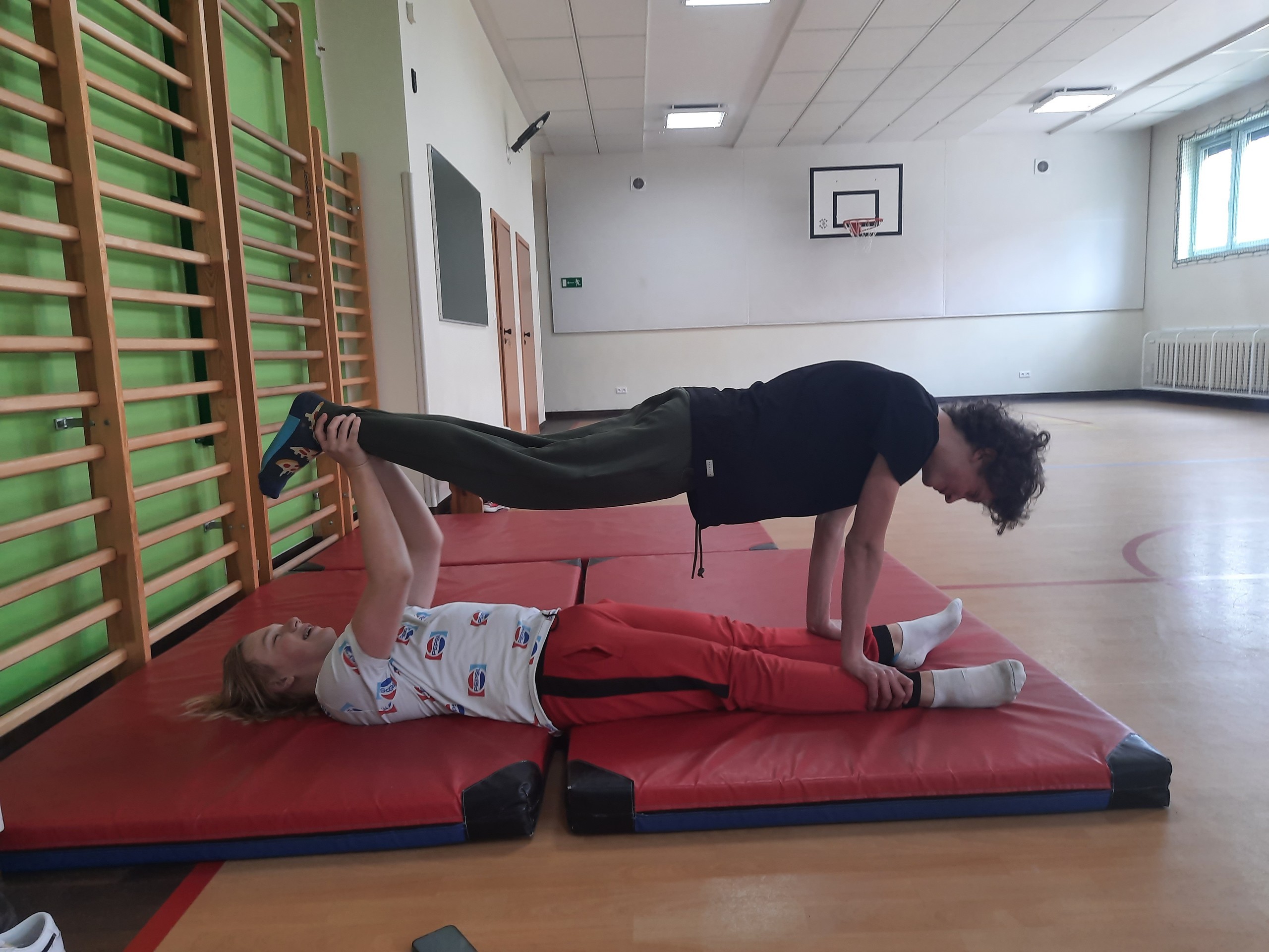 Na lekcjach wychowania fizycznego uczniowie klas 4 - 8 tworzyli różne piramidy gimnastyczne, te prostsze dwu i trzyosobowe, a także próbowali swoich sił w trudniejszych układach – piramidach wieloosobowych. Podczas takich zajęć trzeba wykazać się pomysłowością, aktywnością i kreatywnością. Działając w grupie uczniowie uczą się współpracować, polegać na sobie, wzajemnie się asekurować i wspierać, aby stworzyć wspaniały gimnastyczny pokaz. Jednocześnie  lekcje przynoszą wszystkim mnóstwo dobrej zabawy i śmiechu.
