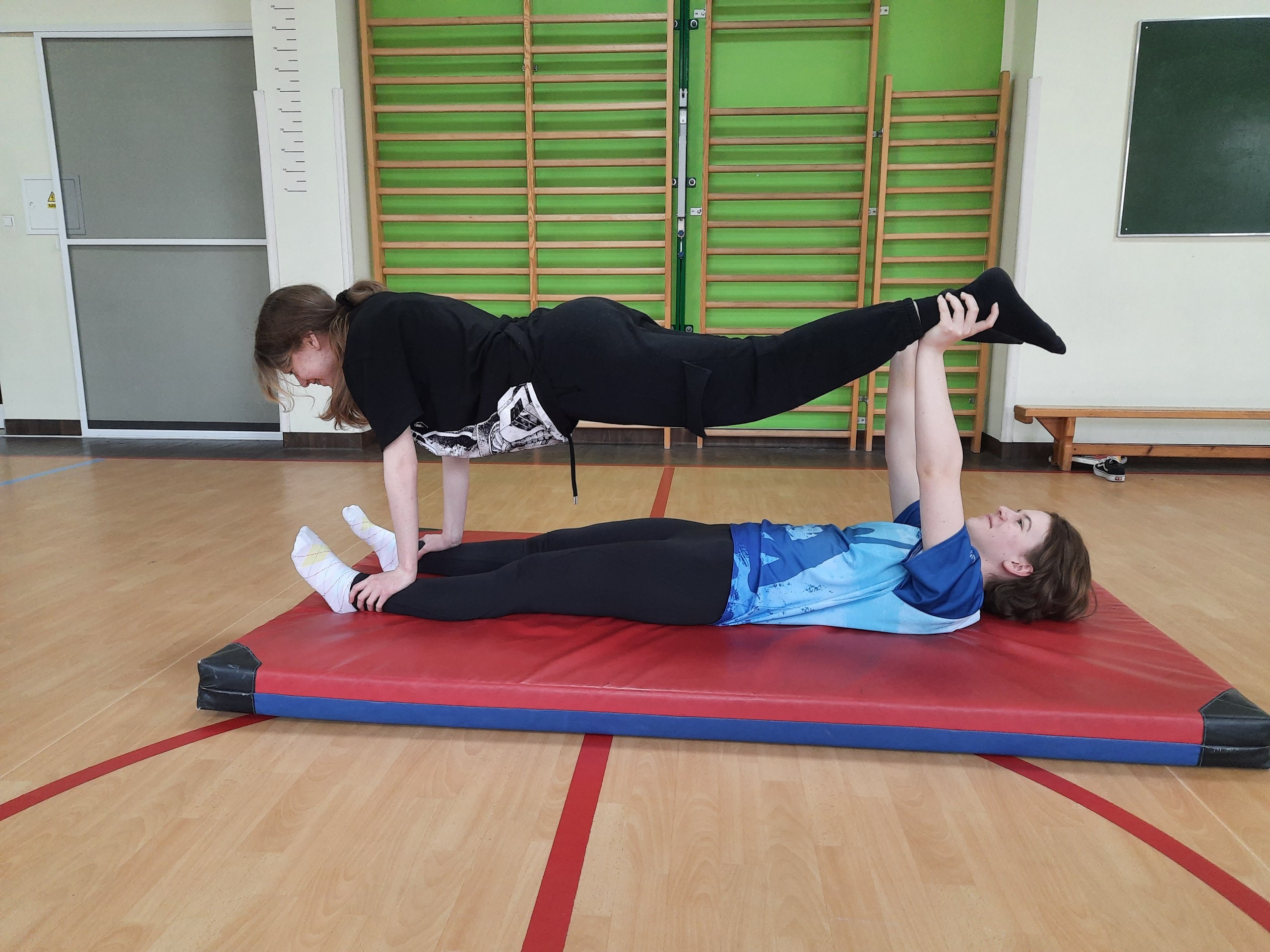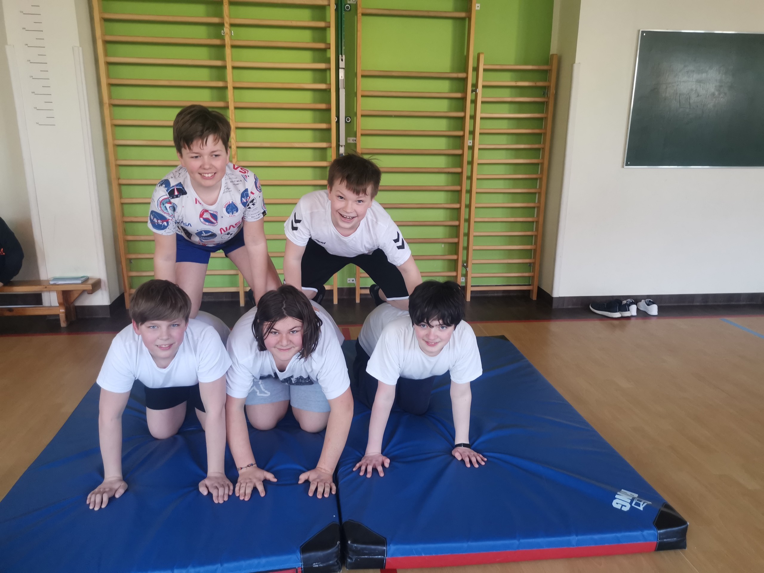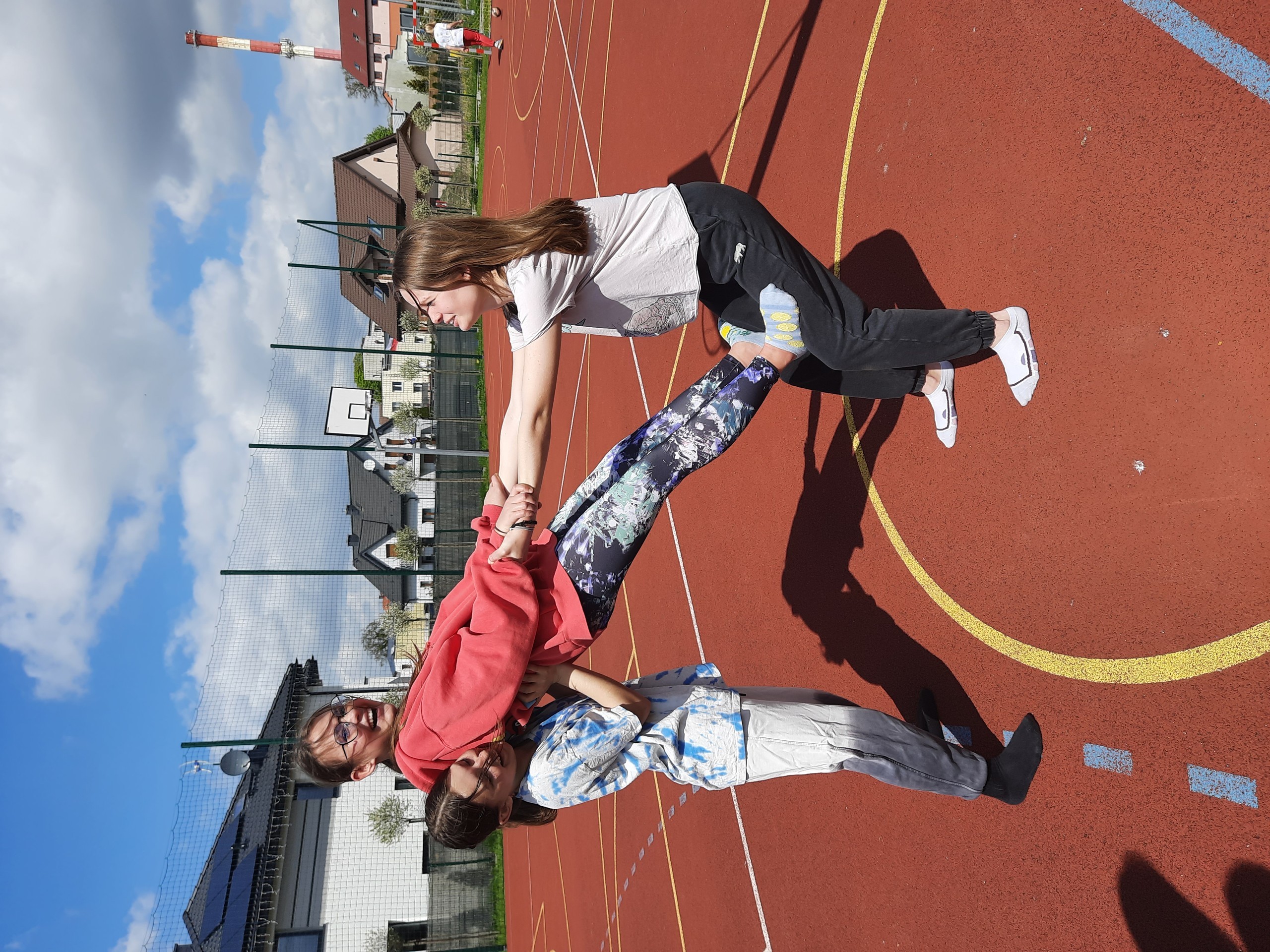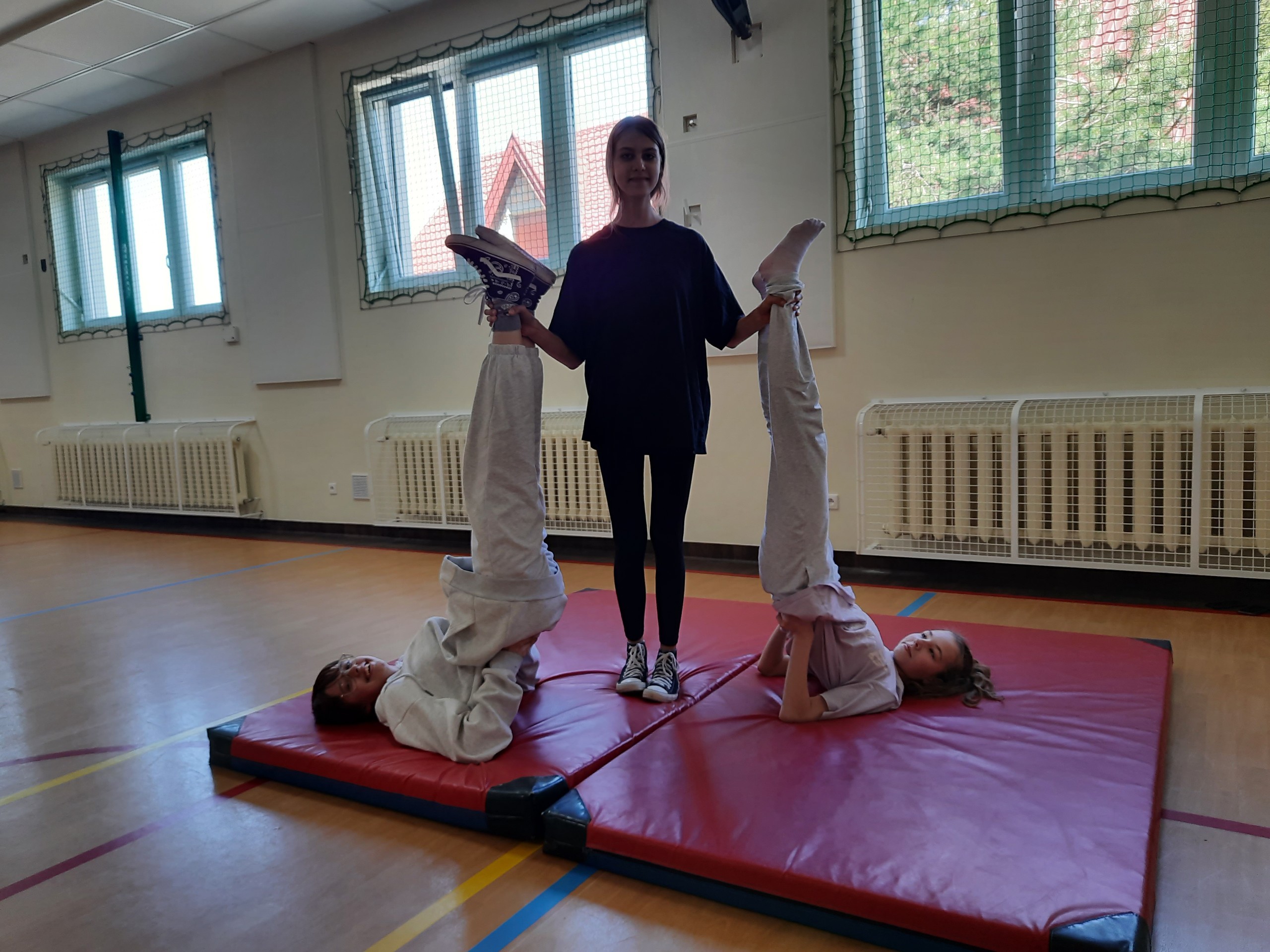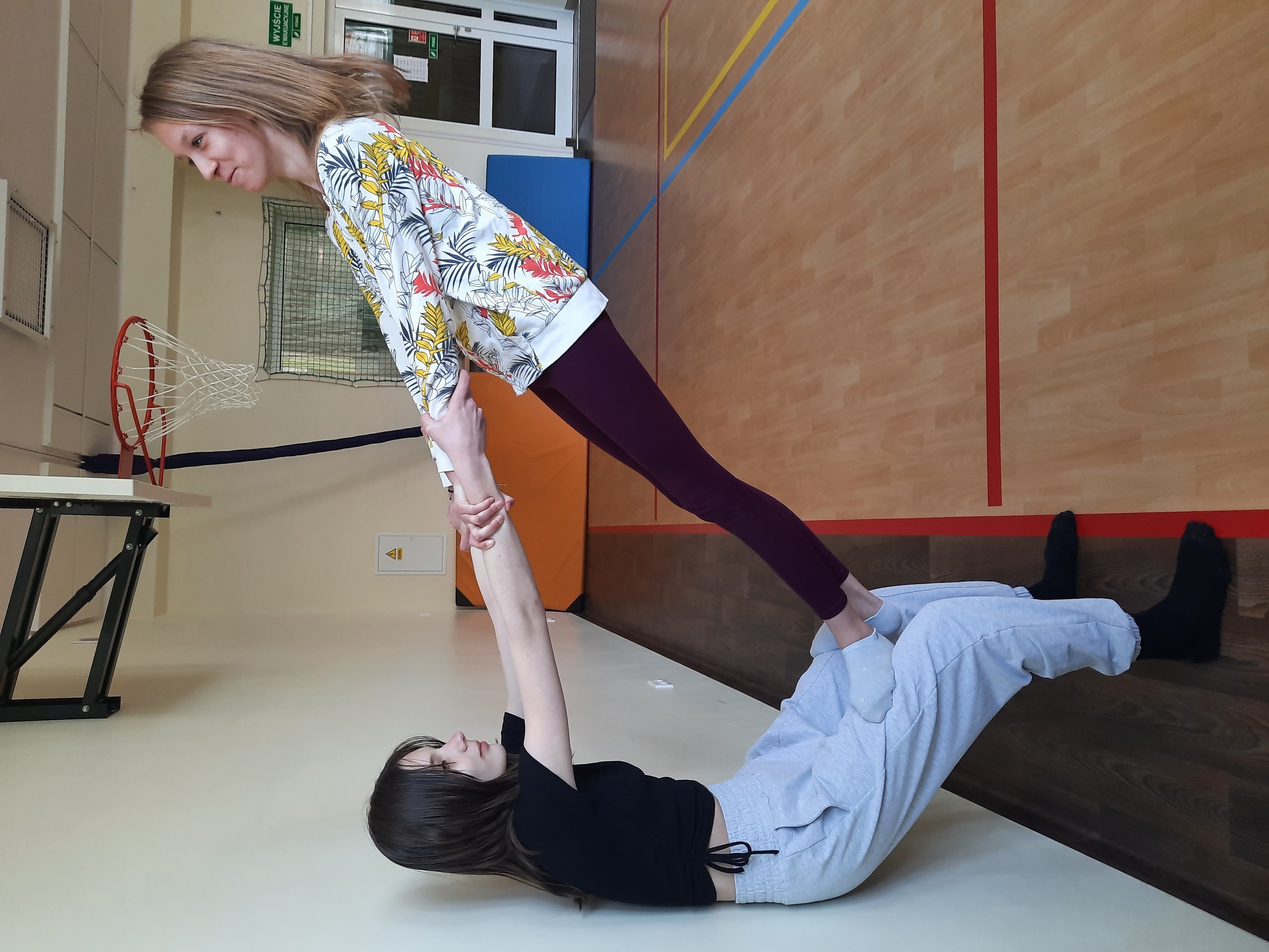 Na lekcjach wychowania fizycznego uczniowie klas 4 - 8 tworzyli różne piramidy gimnastyczne, te prostsze dwu i trzyosobowe, a także próbowali swoich sił w trudniejszych układach – piramidach wieloosobowych. Podczas takich zajęć trzeba wykazać się pomysłowością, aktywnością i kreatywnością. Działając w grupie uczniowie uczą się współpracować, polegać na sobie, wzajemnie się asekurować i wspierać, aby stworzyć wspaniały gimnastyczny pokaz. Jednocześnie  lekcje przynoszą wszystkim mnóstwo dobrej zabawy i śmiechu.