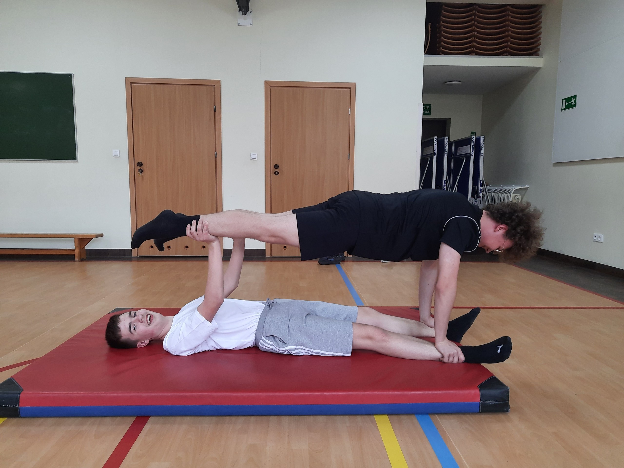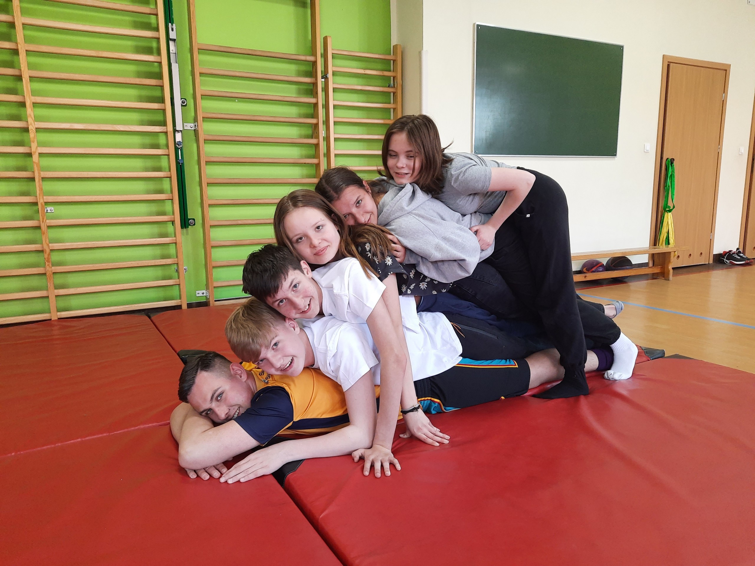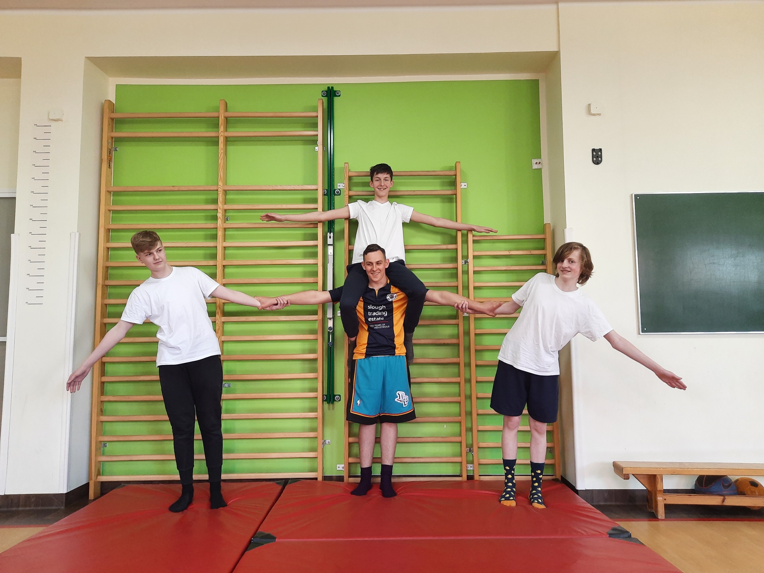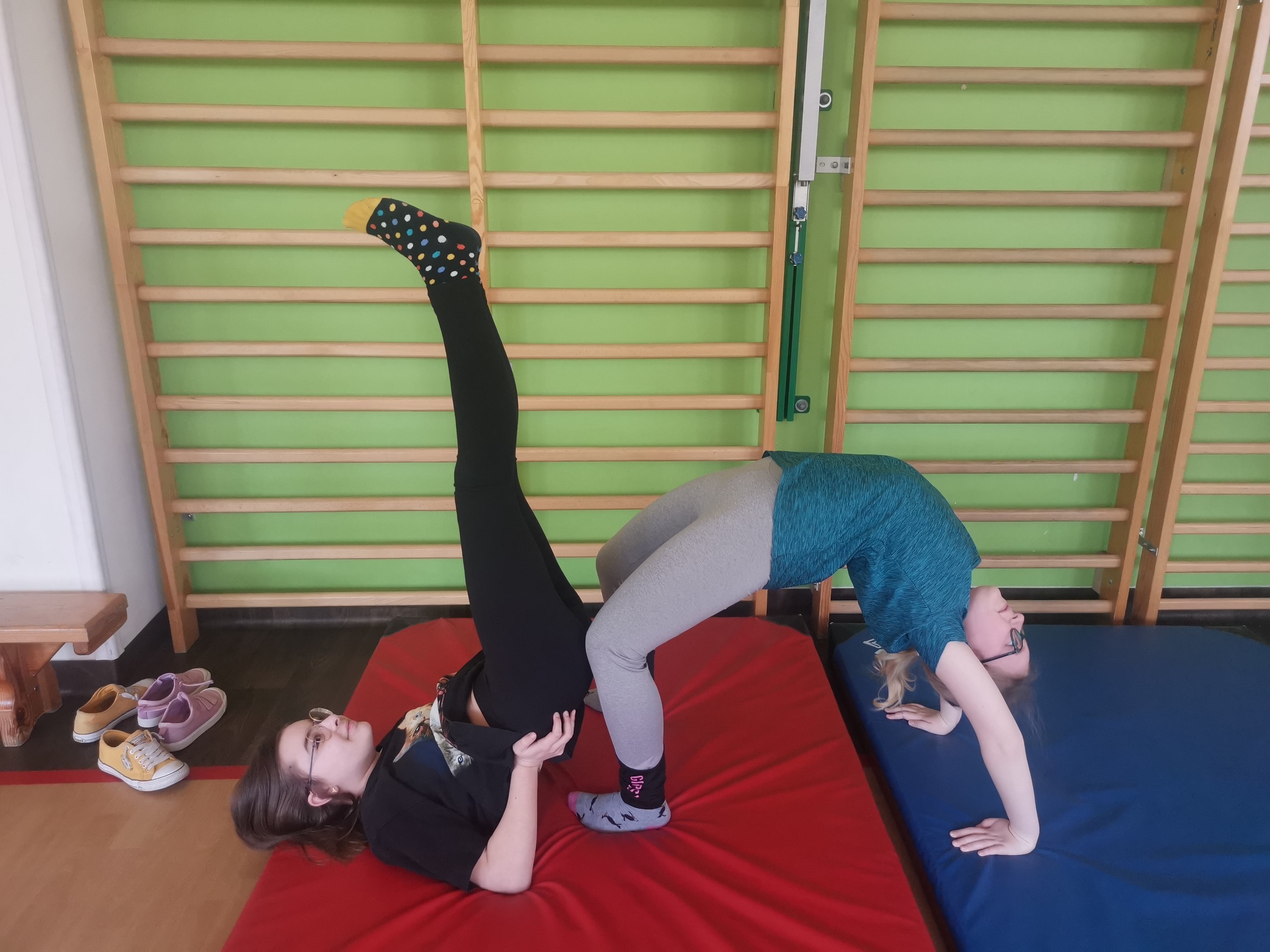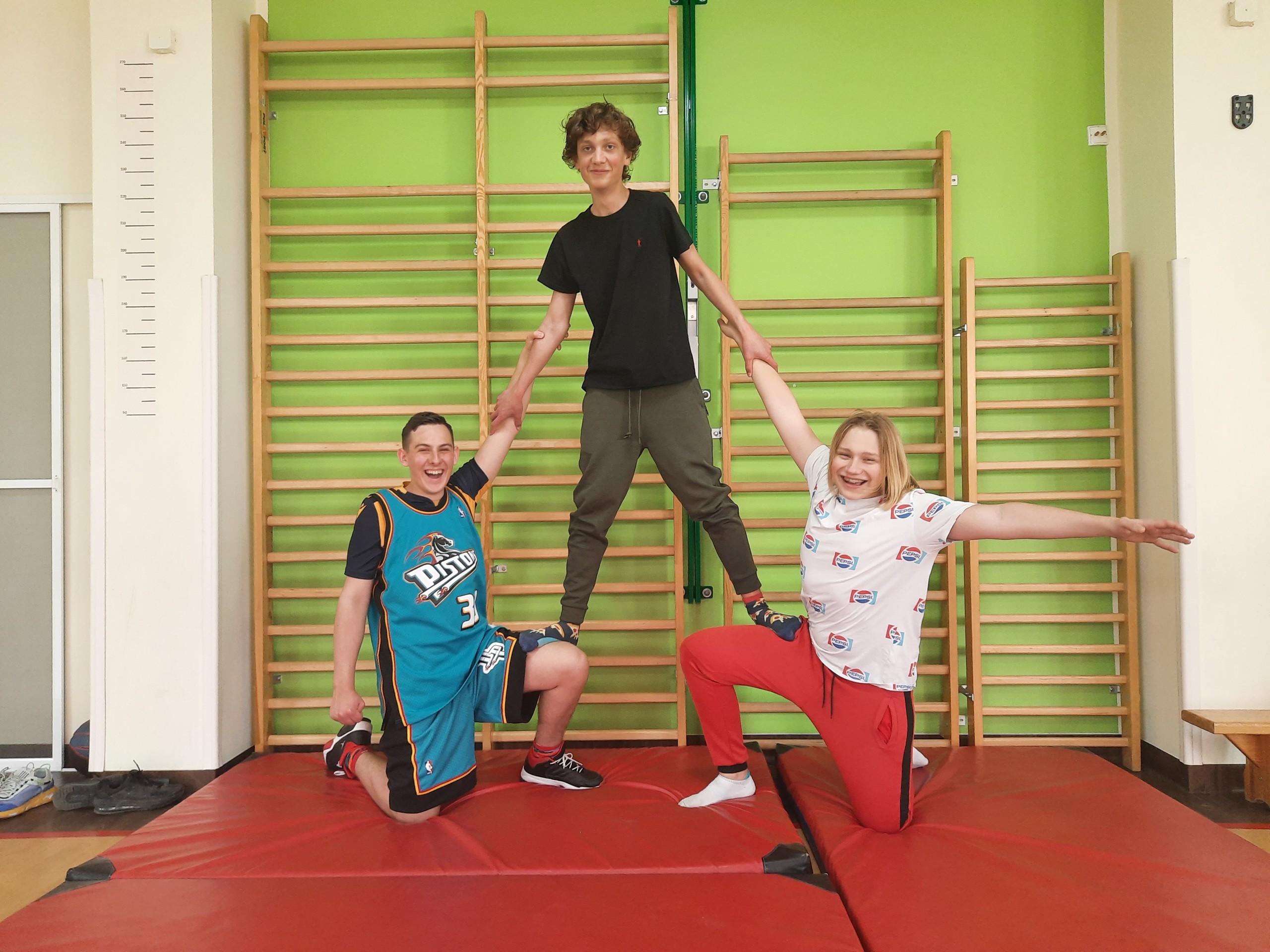 Na lekcjach wychowania fizycznego uczniowie klas 4 - 8 tworzyli różne piramidy gimnastyczne, te prostsze dwu i trzyosobowe, a także próbowali swoich sił w trudniejszych układach – piramidach wieloosobowych. Podczas takich zajęć trzeba wykazać się pomysłowością, aktywnością i kreatywnością. Działając w grupie uczniowie uczą się współpracować, polegać na sobie, wzajemnie się asekurować i wspierać, aby stworzyć wspaniały gimnastyczny pokaz. Jednocześnie  lekcje przynoszą wszystkim mnóstwo dobrej zabawy i śmiechu.