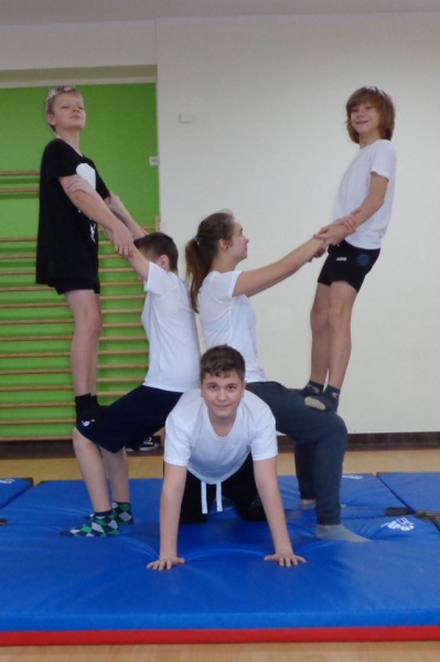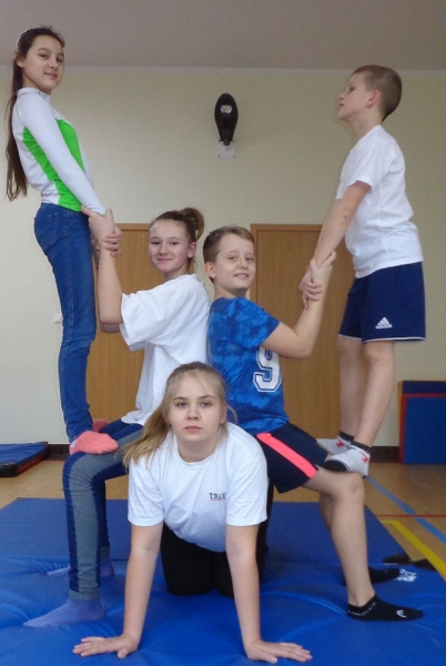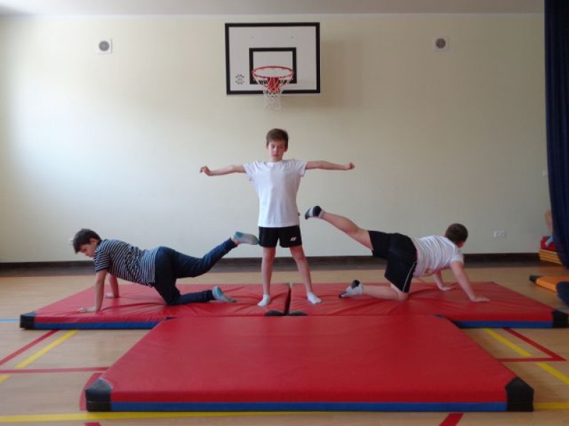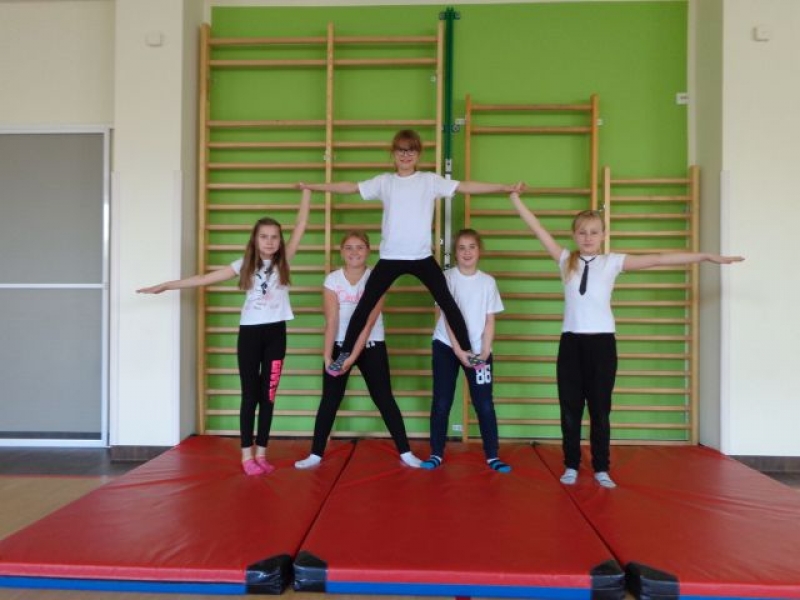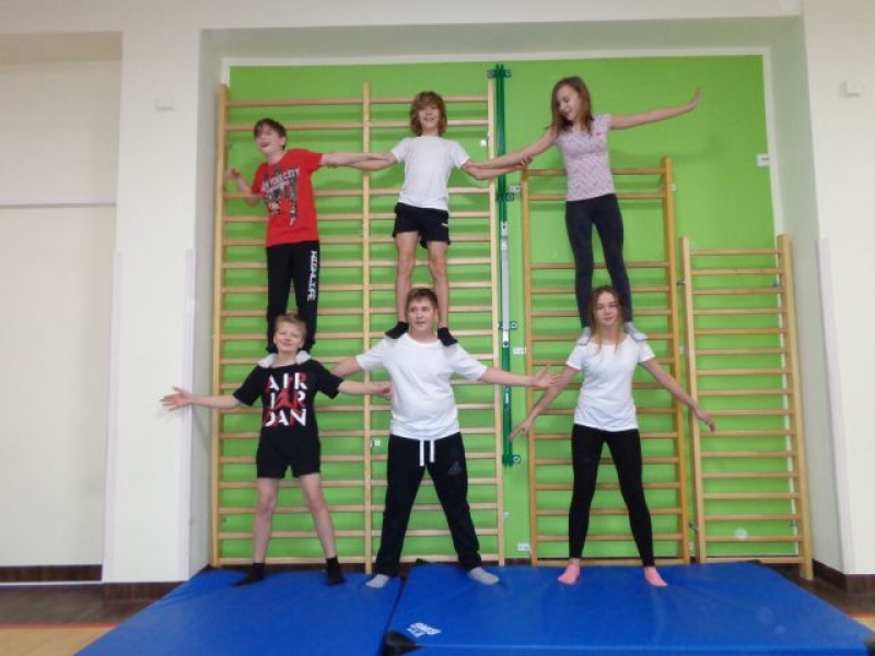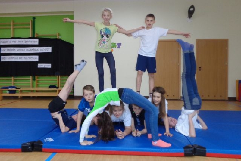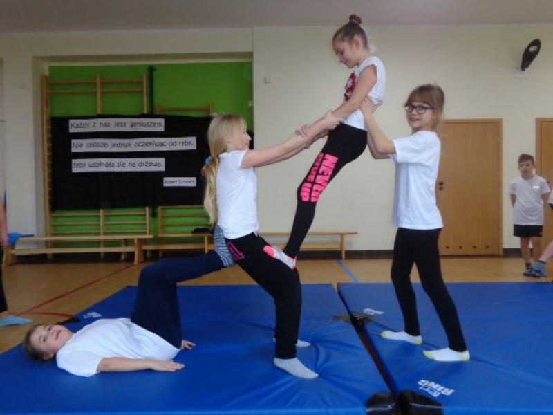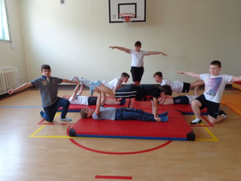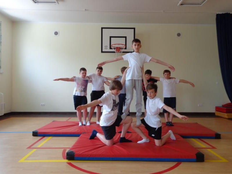 Na lekcjach wychowania fizycznego w ramach zajęć z gimnastyki uczniowie klas IV-VI wykonują piramidy, które są jedną z odmian ćwiczeń akrobatycznych o charakterze równoważno-statycznym. Ćwiczenia te są atrakcyjne dla ćwiczących, gdyż wprowadzają elementy nowe oraz wykorzystują już znane. W trakcie zajęć uczniowie doskonalą elementy gimnastyczne, wykazują się pomysłowością, ale przede wszystkim uczą się współdziałać w grupie, wzajemnie się asekurować i polegać na sobie. Uczniowie wykonywali proste piramidy dwu i trzyosobowe, a także próbowali swoich sił w najtrudniejszych układach – piramidach wieloosobowych.