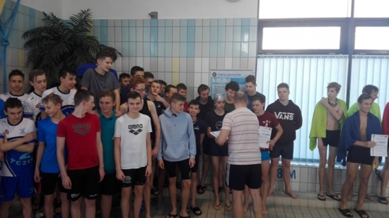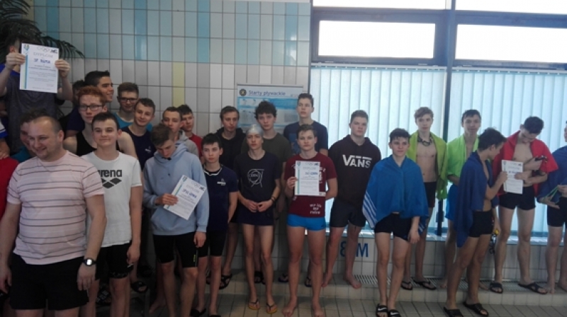 W piątek 2 marca 2018 r. na lęborskiej pływalni Rafa odbył się XIX Półfinał Igrzysk Młodzieży Szkolnej Województwa Pomorskiego w Pływaniu Drużynowym. W zawodach mieli prawo startu zwycięzcy eliminacji powiatowych. Wśród chłopców były to drużyny z Rumii, Gdyni, Tczewa, Pogórza i Lęborka. Swoich starszych kolegów z SGJ wspierał uczeń naszej szkoły Beniamin Marcisz. Sztafeta uplasowała się na 4 miejscu. Rywalizacja była bardzo zacięta. W wielu startach indywidualnych o zajętym miejscu decydowały ułamki sekund. Tym razem zabrakło nam trochę szczęścia i ostatecznie zajęliśmy 4 lokatę. Do 3 miejsca i awansu do Finału zabrakło nam tylko 13 punktów.