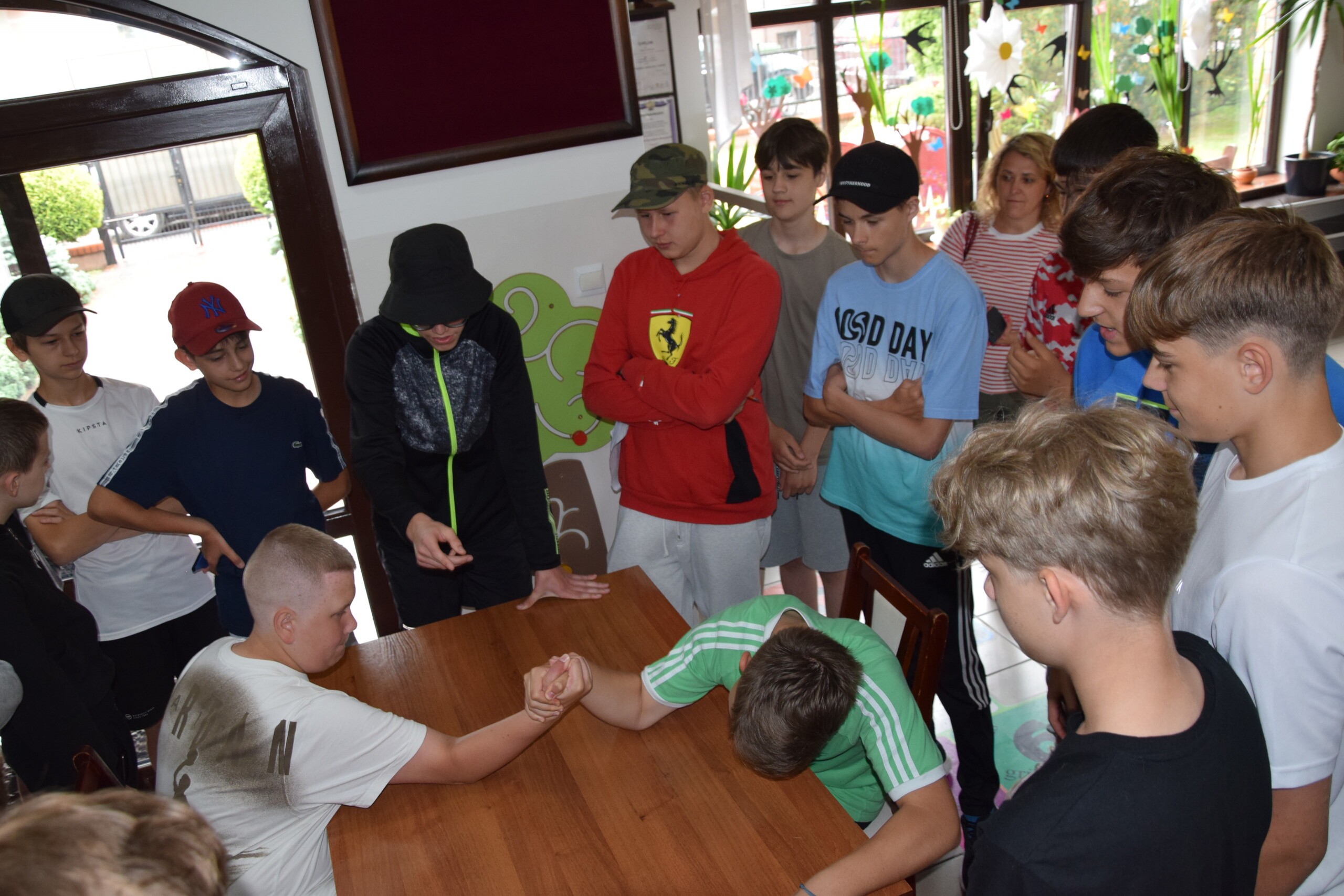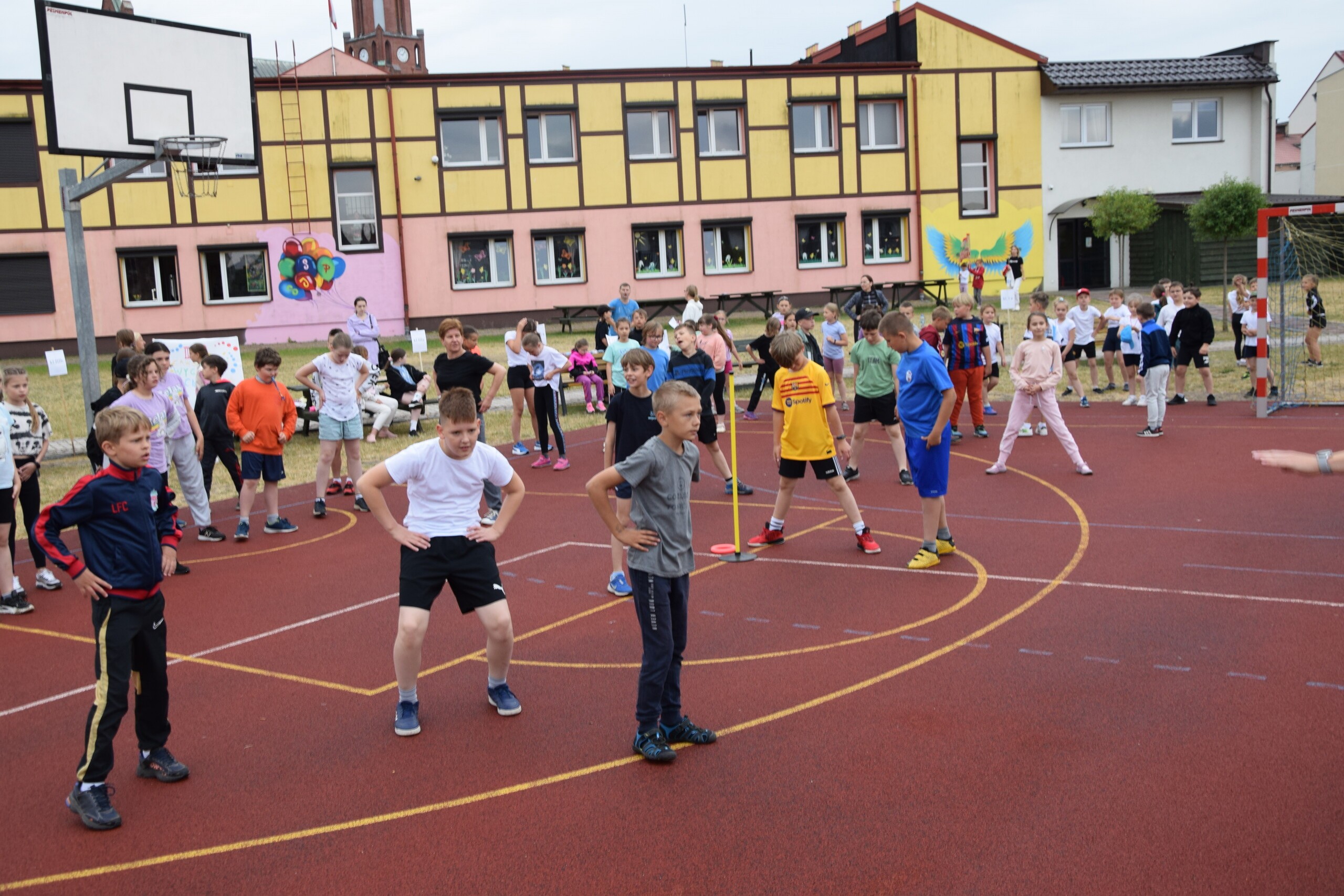 15 czerwca odbył się w naszej szkole Dzień Sportu, który miał jeszcze mocniej zachęcić dzieci i młodzież do aktywności ruchowej, pomóc w integrowaniu się klas, a także wzbogacić przeżycia poprzez szlachetne współzawodnictwo. W tym roku rywalizacja toczyła się między oddziałami tzn. klasa I walczyła z II, III a z III b, IV z V, VI a i VI b z VII, a VIII a z VIII b. Każda klasa reprezentowana była przez ośmiu uczniów. Pozostałe dzieci rewelacyjnie dopingowały rówieśników. W poszczególnych zabawach uczniowie zmieniali się, a więc wszyscy mieli szansę wykazać się sprawnością fizyczną w różnych konkurencjach: biegu z przekazywaniem ringo, strzałach do bramki, biegu kelnera, rzutach woreczkami do celu czy piłką do kosza. Pogoda spłatała nam dzisiaj figla, ale deszcz nie ostudził naszego sportowego zapału i kiedy na chwilę rywalizacja przeniosła się do szkoły, uczniowie zmierzyli się w konkurencji siłowania się na rękę. Wiele emocji dostarczył wszystkim mecz w zbijaka, w którym uczniowie rywalizowali ze swoimi nauczycielami i pracownikami szkoły. Rozegrano 2 połowy, każda po 10 minut. Walka była bardzo zacięta. Lepsi okazali się nauczyciele, ale uczniom należą się duże brawa za walkę o każdy punkt. W końcowej klasyfikacji zwyciężyły klasy: II, III b, V, VII i VIII a, zajmując I miejsca, a tuż za nimi klasy I, III a, IV, VI a i VI b oraz VIII b, zdobywając miejsca II. Najlepiej kibicującą klasą okazała się klasa V. Klasy otrzymały słodkości i pamiątkowe dyplomy. Na zakończenie Dnia Sportu odbyło się losowanie nagród spośród obecnych uczniów. Wszyscy spędziliśmy dzień aktywnie i radośnie, na świeżym powietrzu, zamiast w szkolnych ławkach. Zachęcamy do codziennej aktywności fizycznej!