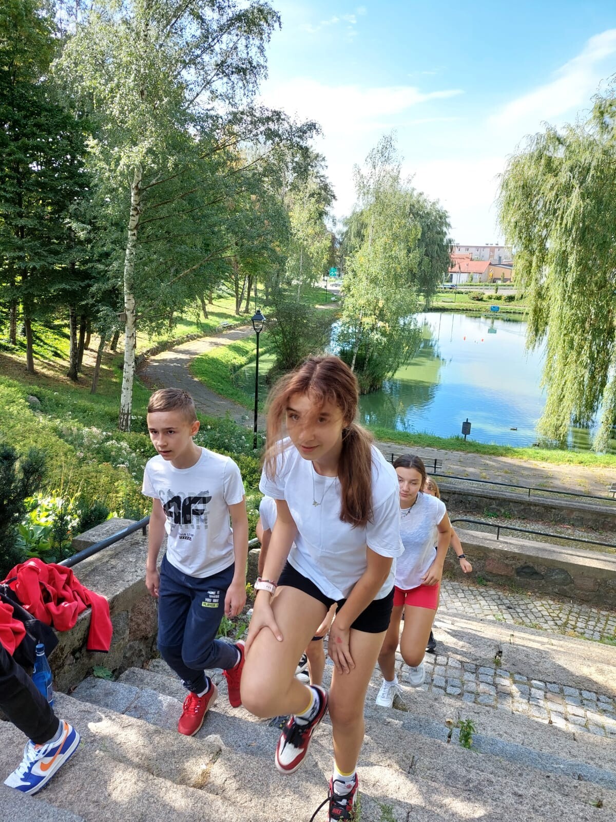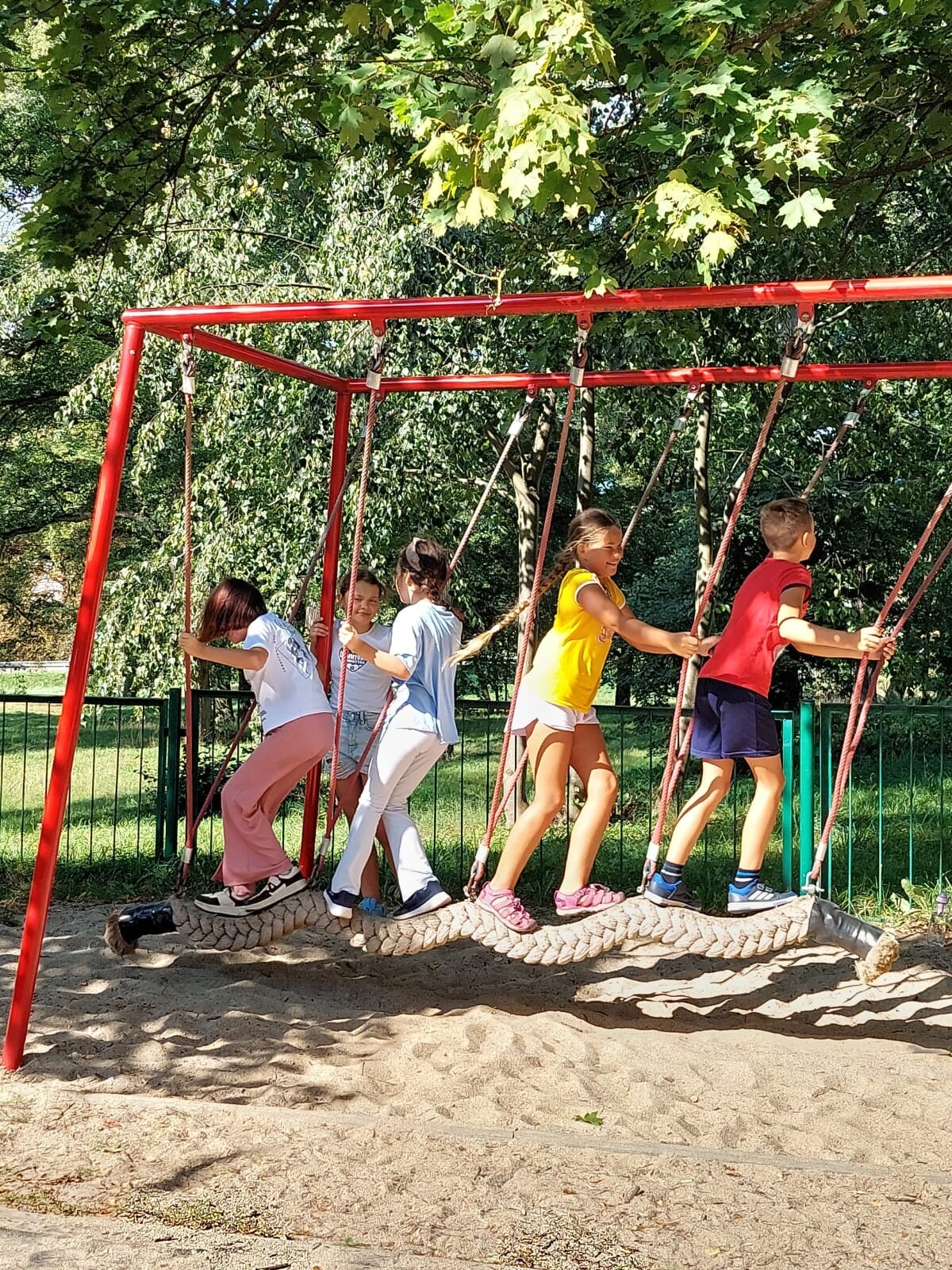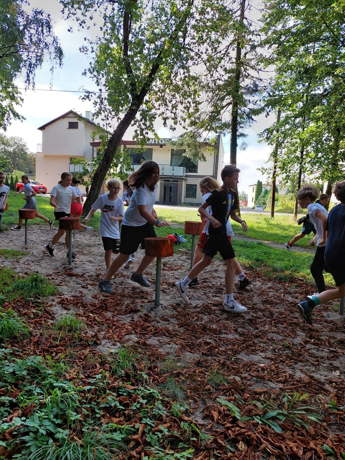 Wychowanie fizyczne na świeżym powietrzu. Wykorzystaliśmy ścieżkę zdrowia znajdującą się w parku Chrobrego. Był czas na bieg, skoki, wspinanie się w okolicach czołgu, podbieganie po schodach , ale i chwila integracji na placu zabaw.