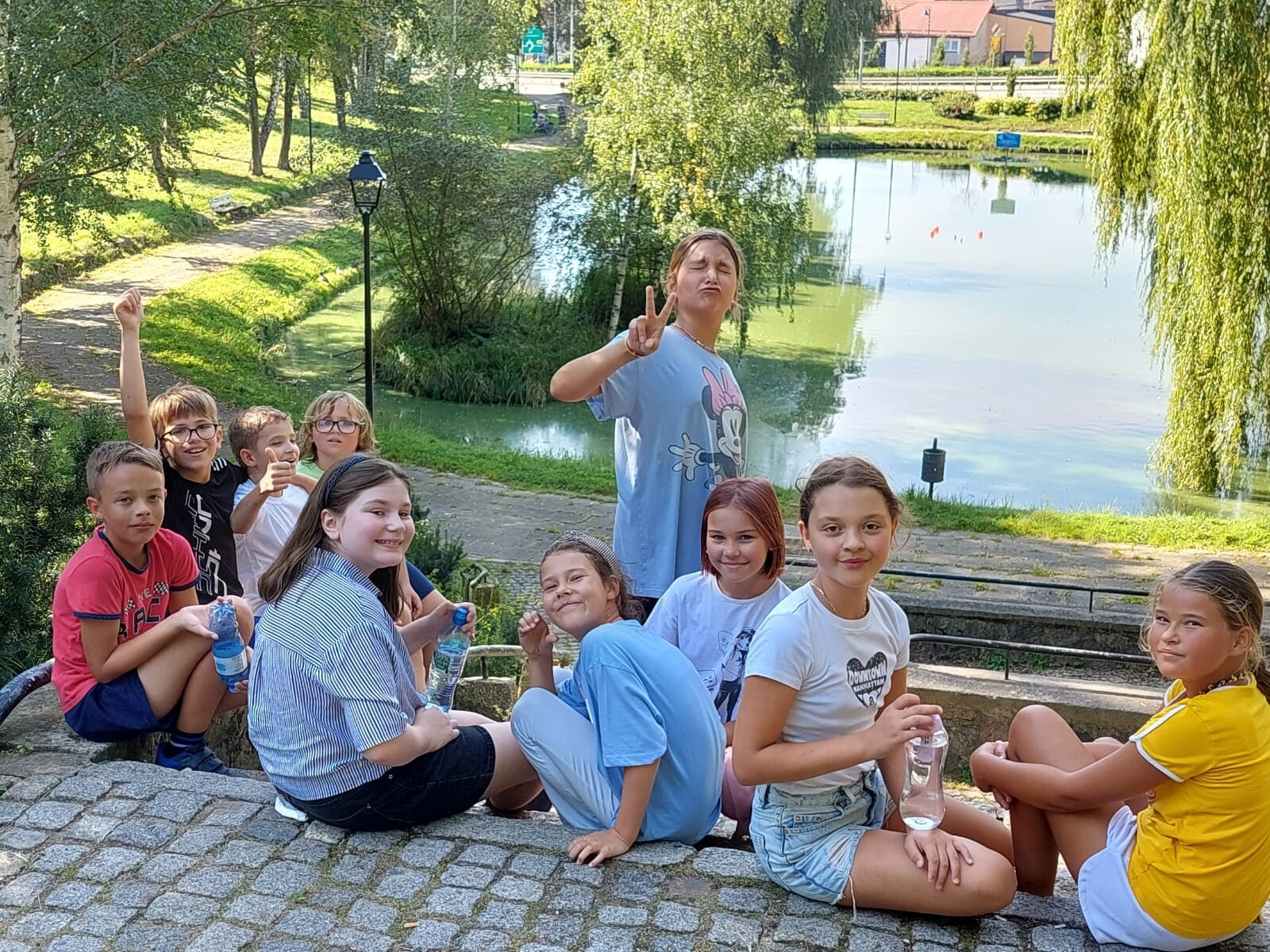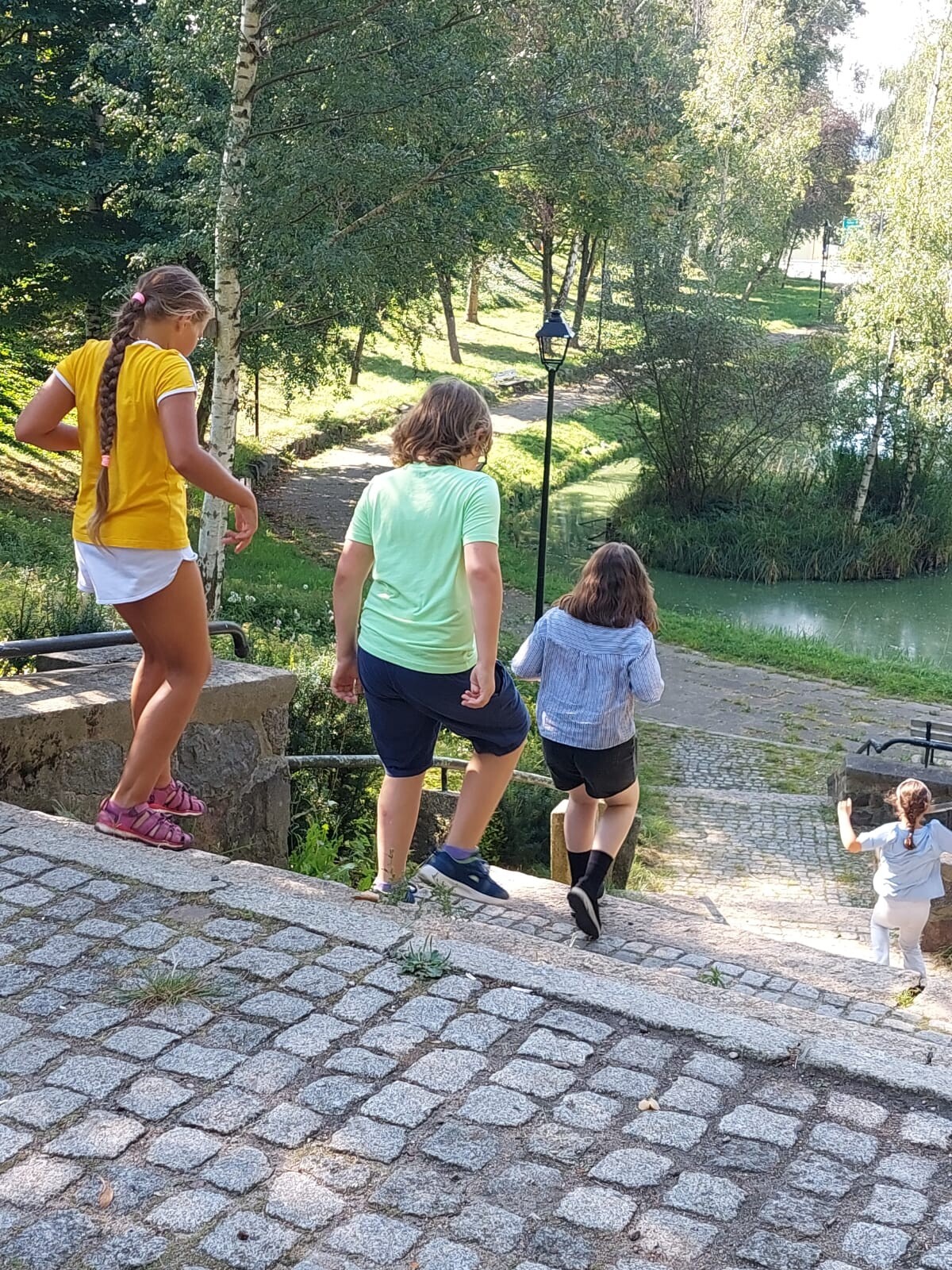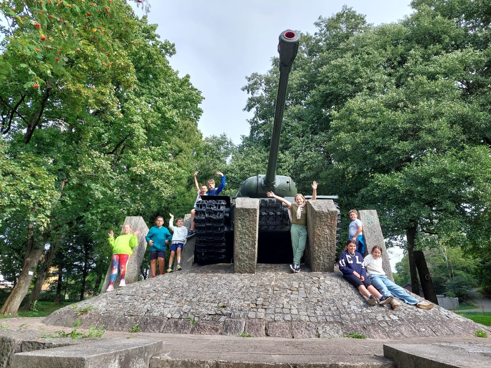 Wychowanie fizyczne na świeżym powietrzu. Wykorzystaliśmy ścieżkę zdrowia znajdującą się w parku Chrobrego. Był czas na bieg, skoki, wspinanie się w okolicach czołgu, podbieganie po schodach , ale i chwila integracji na placu zabaw.